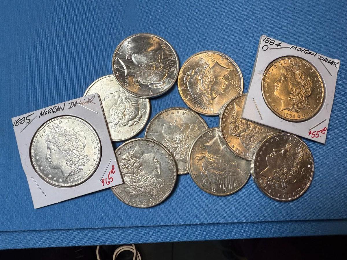 BAG #8 OF 10 DECENT SHAPE MORGAN & PEACE SILVER DOLLARS AT MELT SILVER PRICE AS PICTURED. (RECEIVE ALL COINS PICTURED).