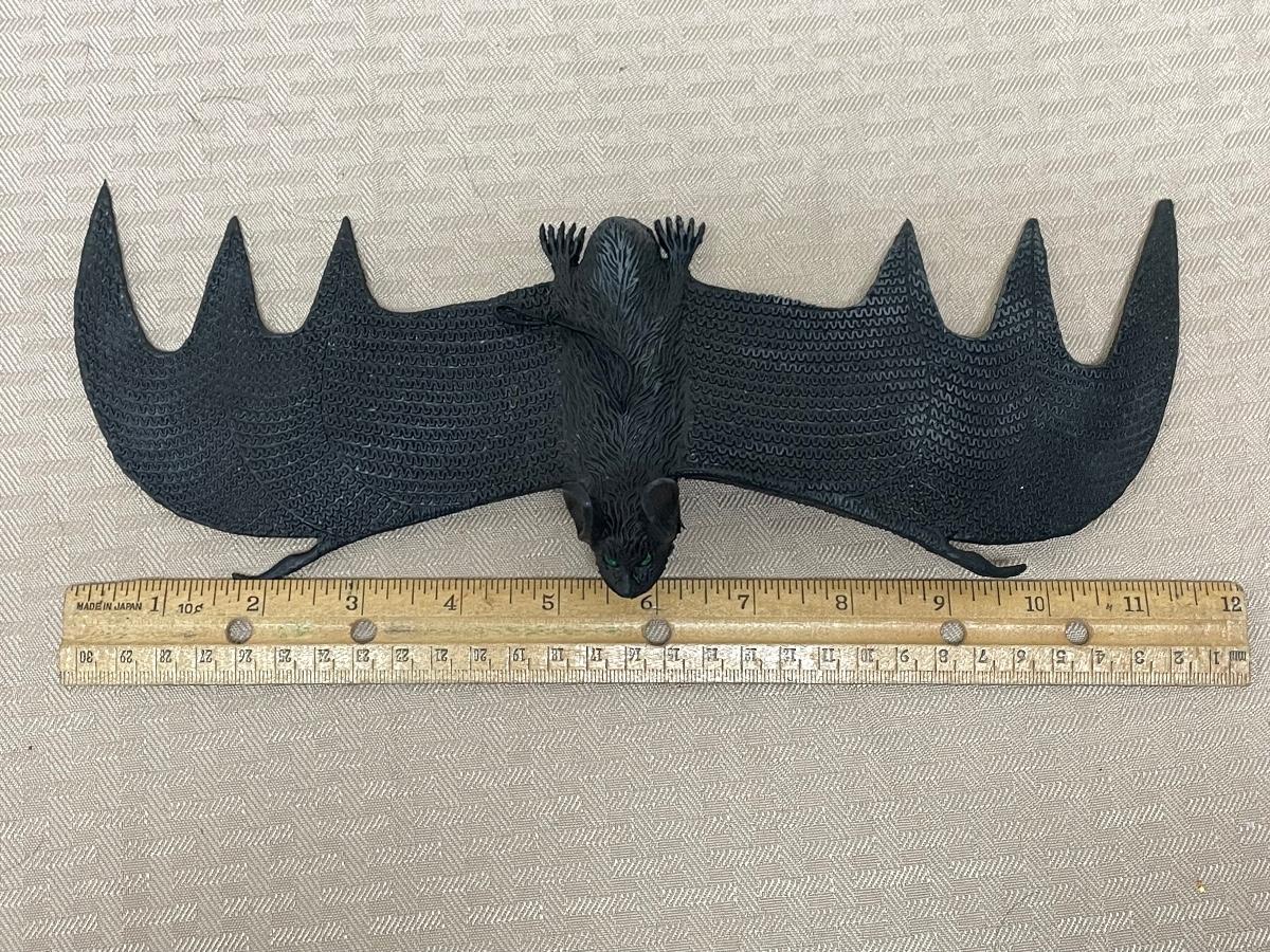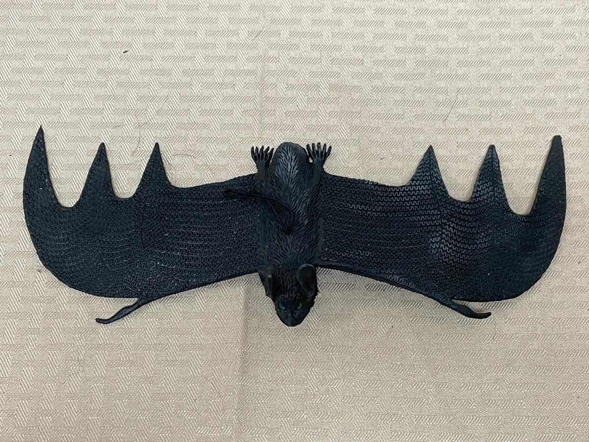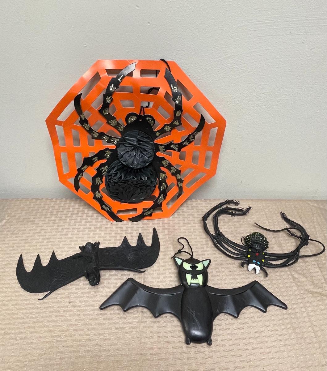 Item comes with one rubber bat, one plastic bat, one paper spider decoration, and one rubber spider. Items are all in great condition and have no significant damages.
