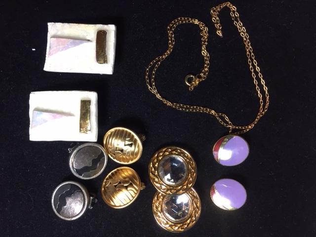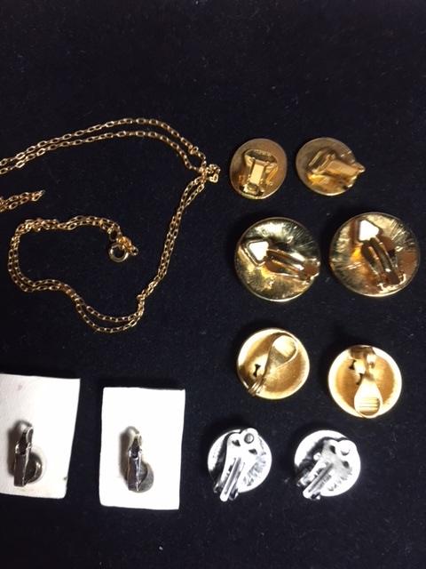 Includes several pairs of various clip on earring in different styles and materials. Includes gold tone chain.
