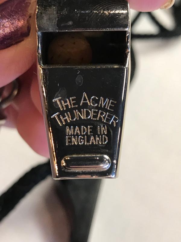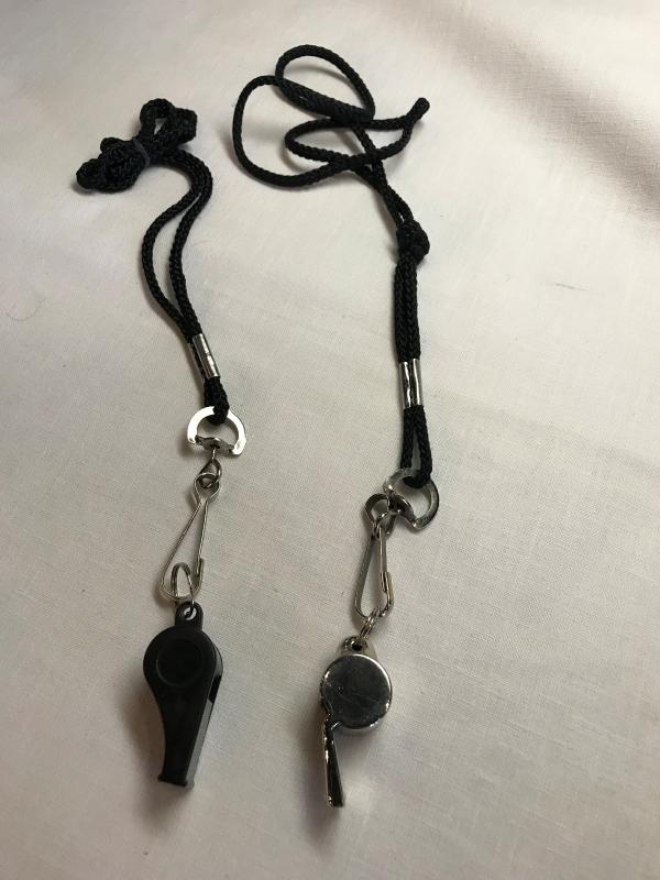 Includes a pair of whitsles on lanyards. One is black plastic. The other is the silvertone metal "The Acme Thunderer" made in England.