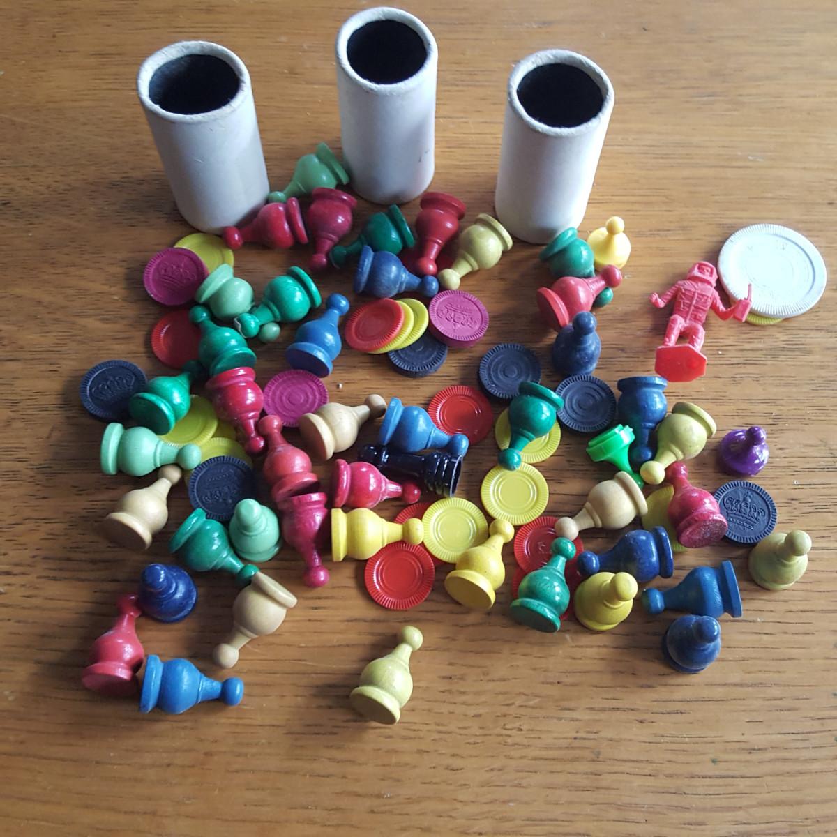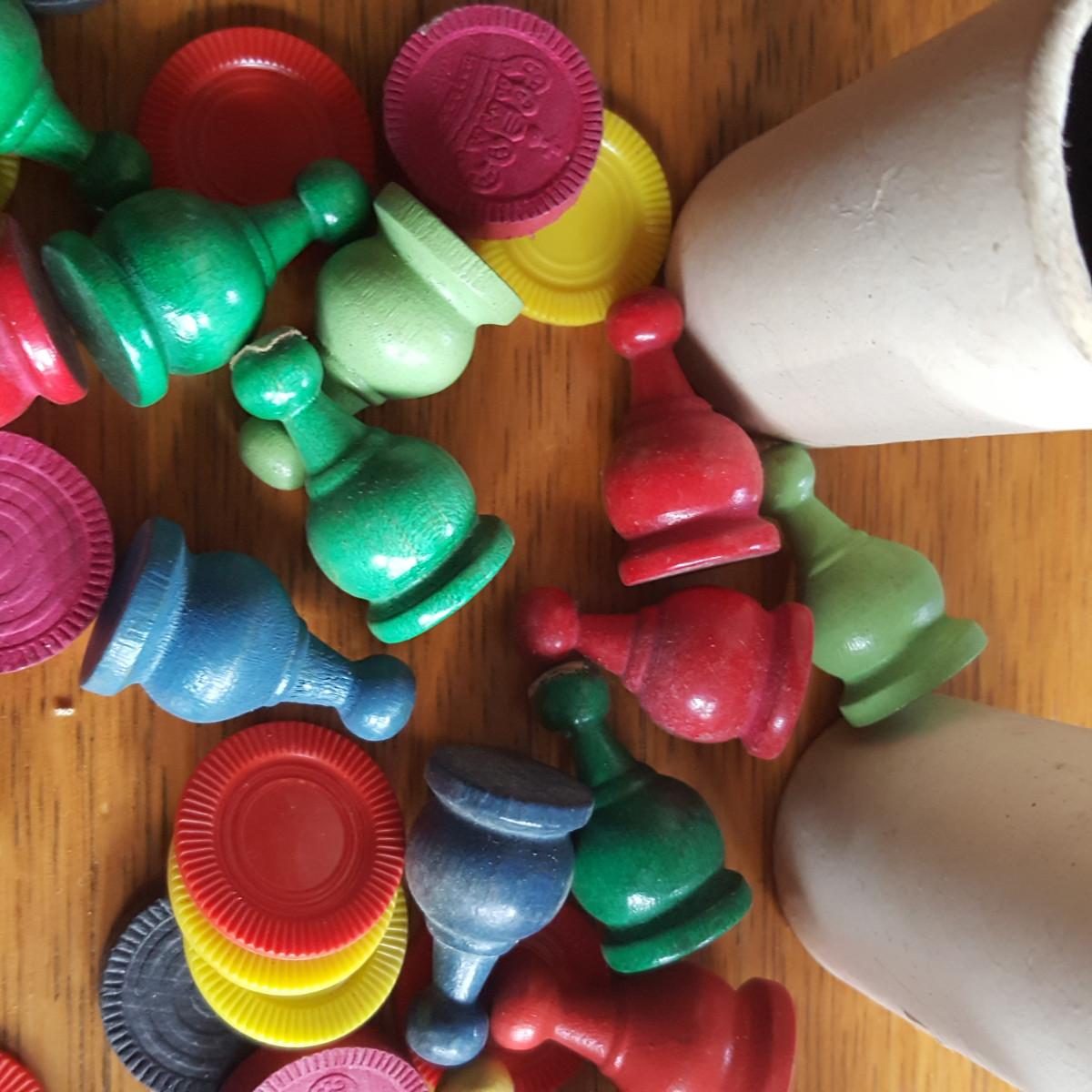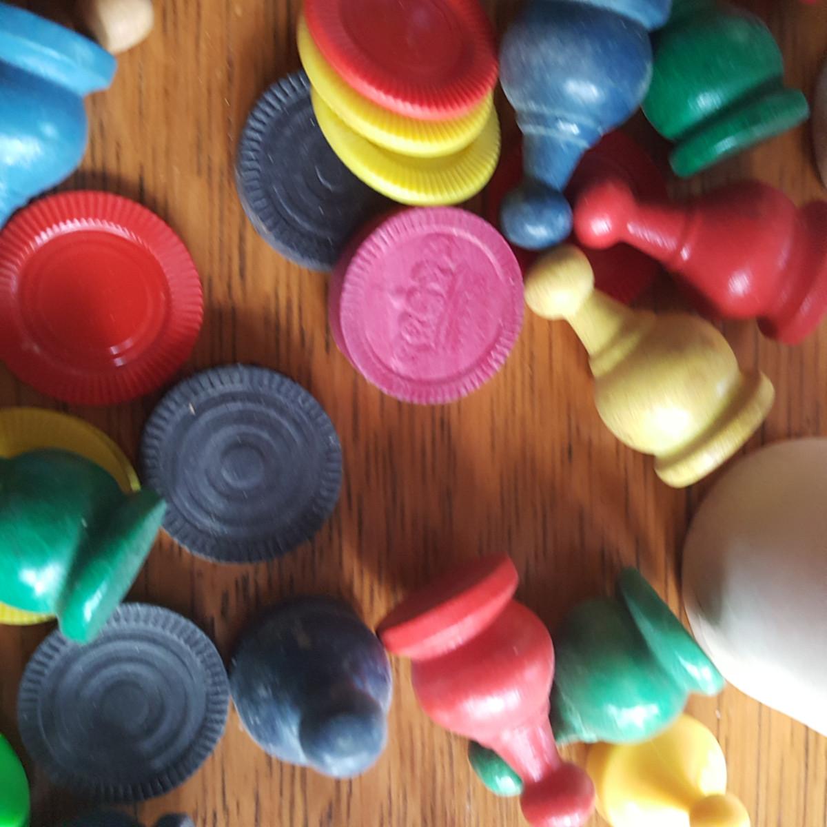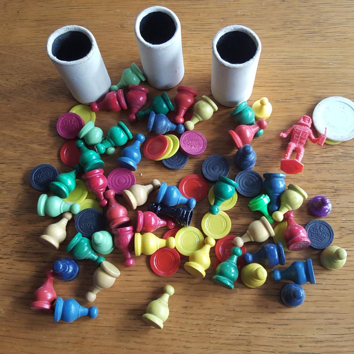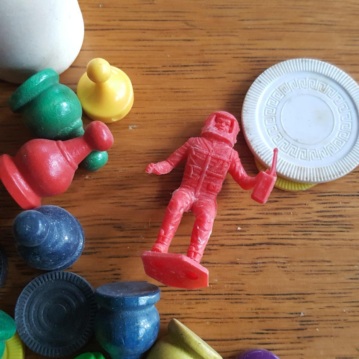 This auction lot is for a Bag 'O Miscellaneous Vintage Game Pieces. This bag contains dice pots, checker pieces, both wood and plastic game movement pieces and a plastic spaceman. If you have games with some missing pieces this grouping will help you fill the void. Or use for a special art or crafting project.
