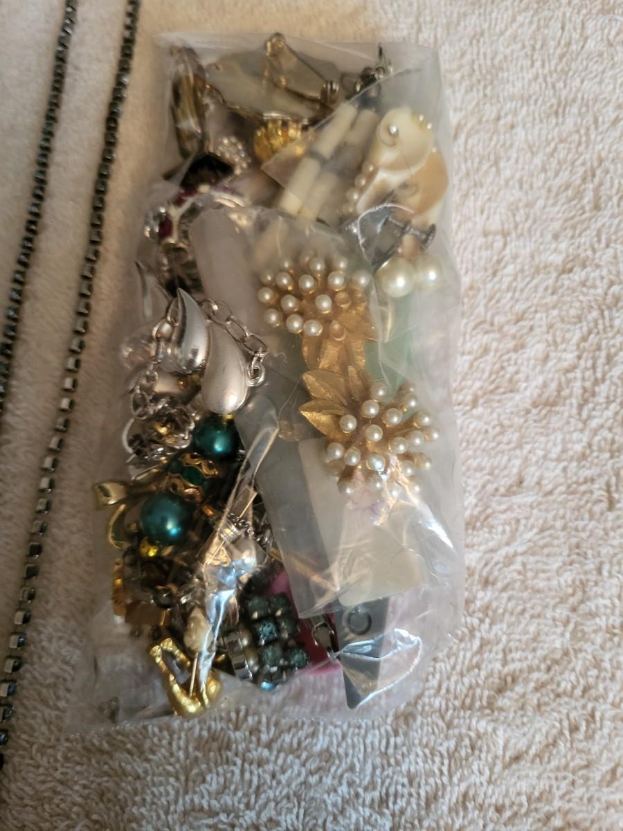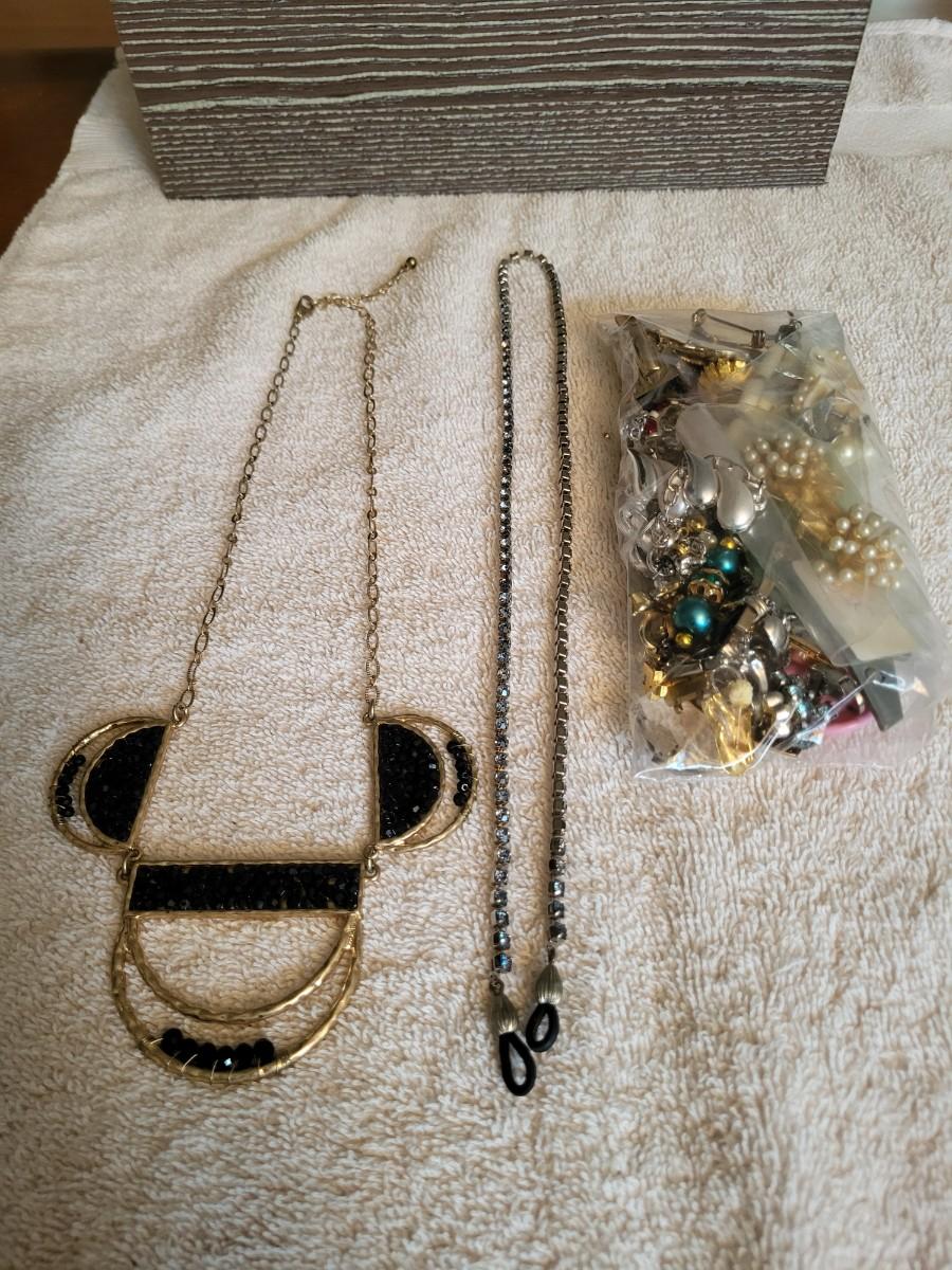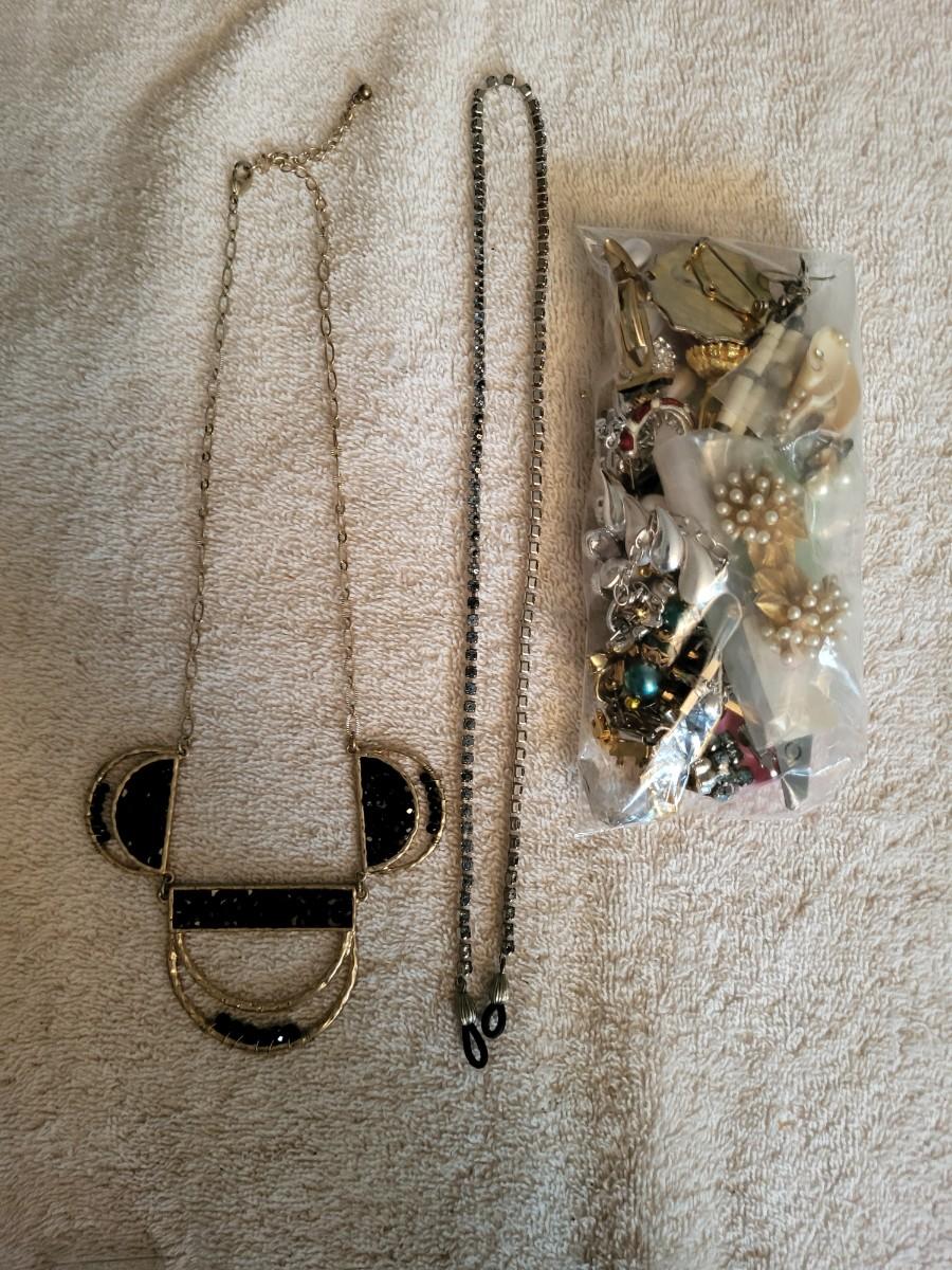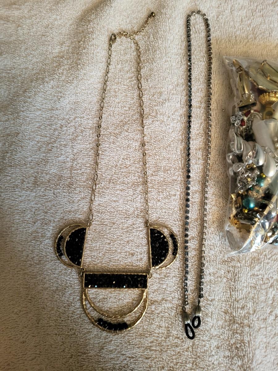BAG OF BROKEN CRAFT JEWELRY, NECKLACE AND EYEGLASS CHAIN