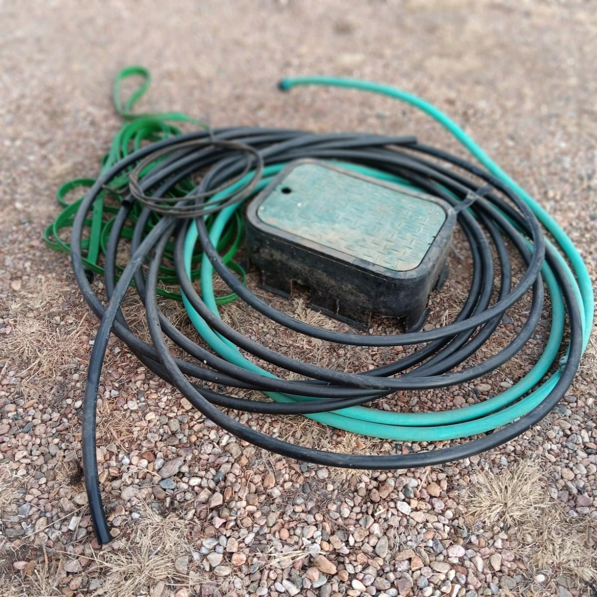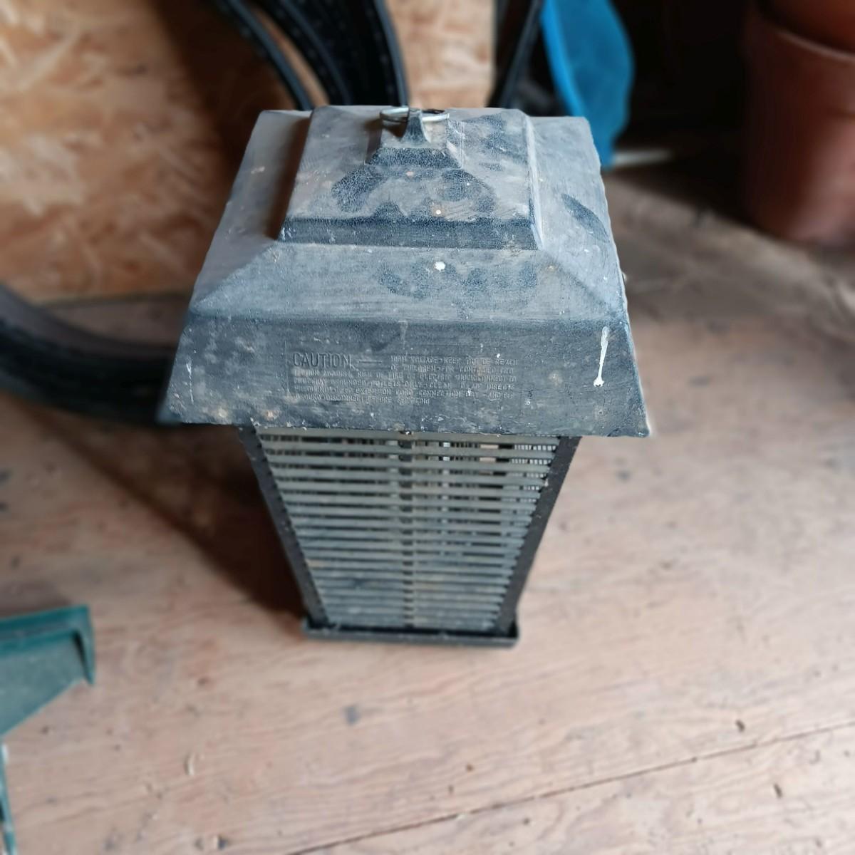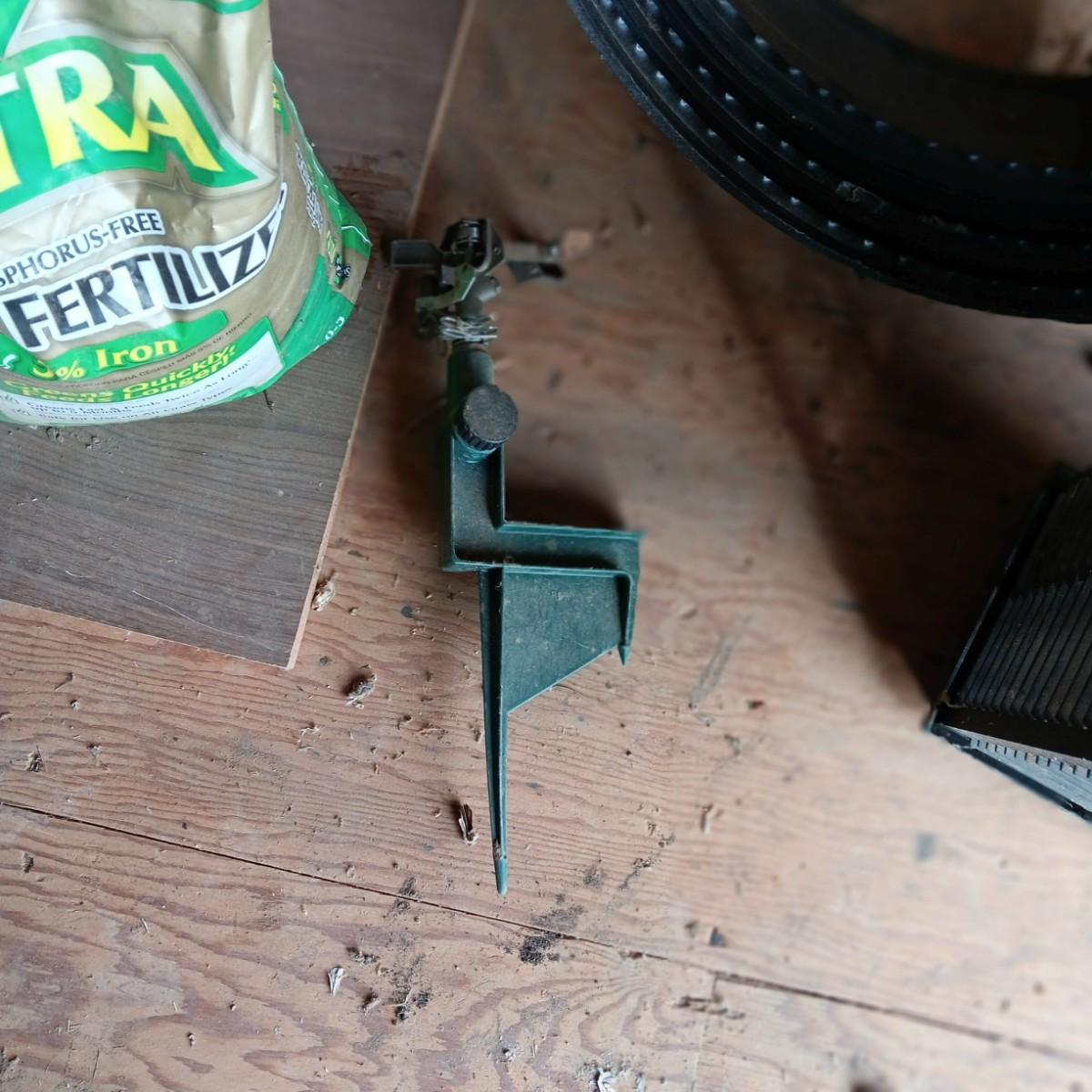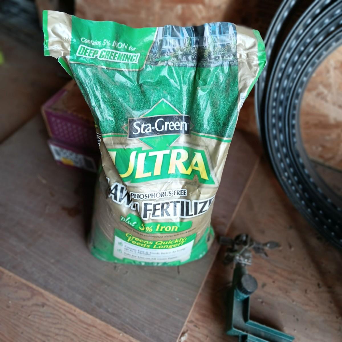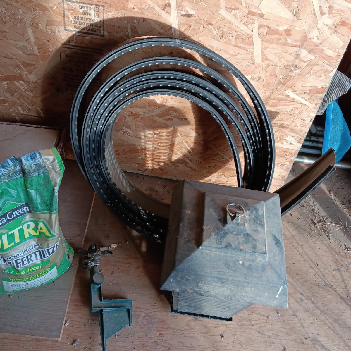 BAG OF FERTILIZER, EDGING, BUG ZAPPER AND GARDEN HOSE