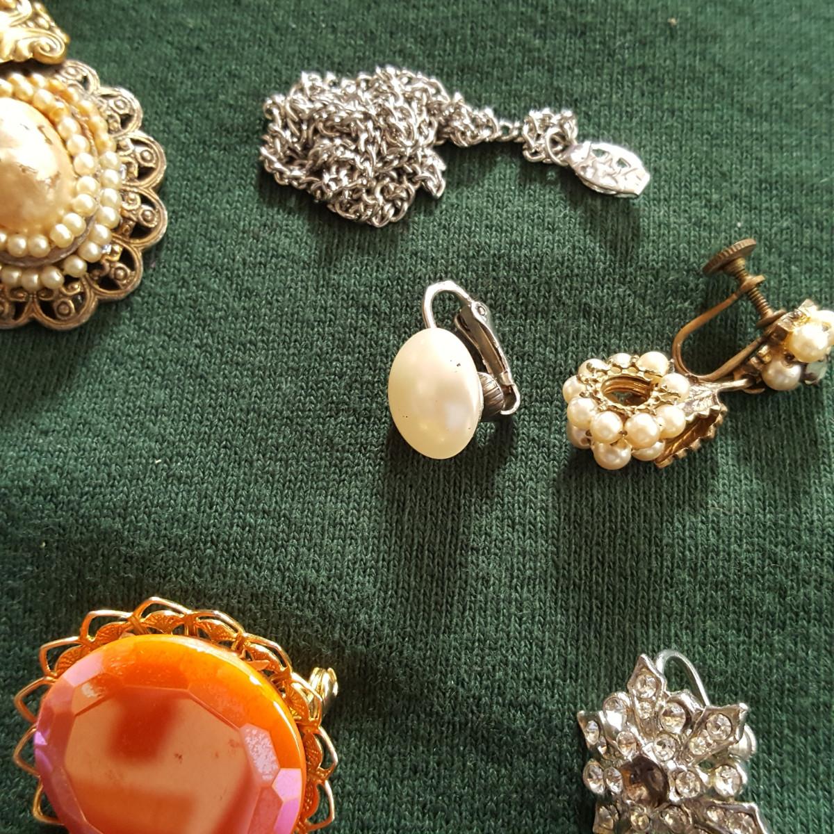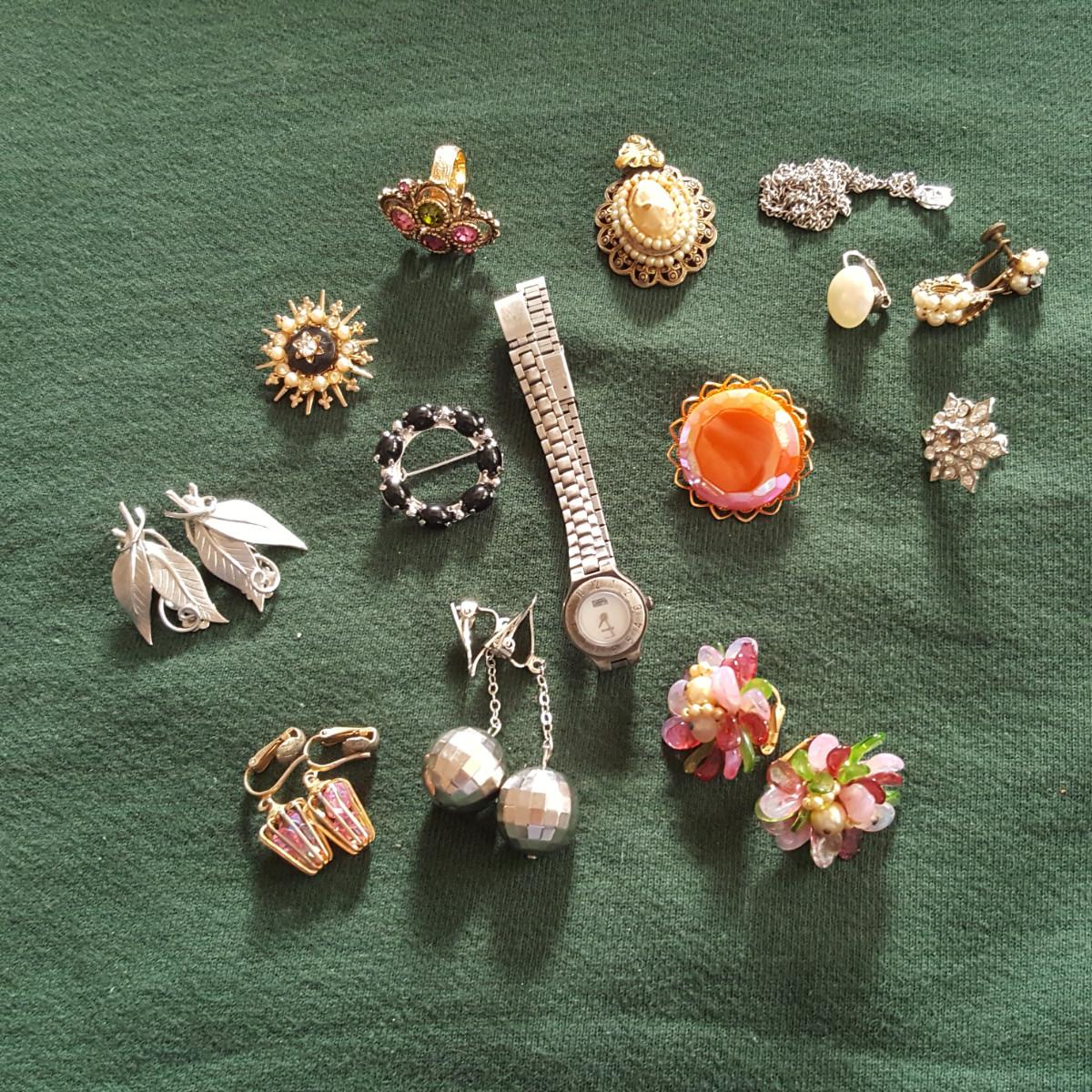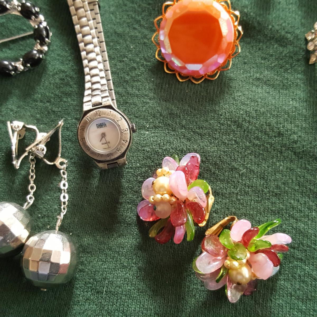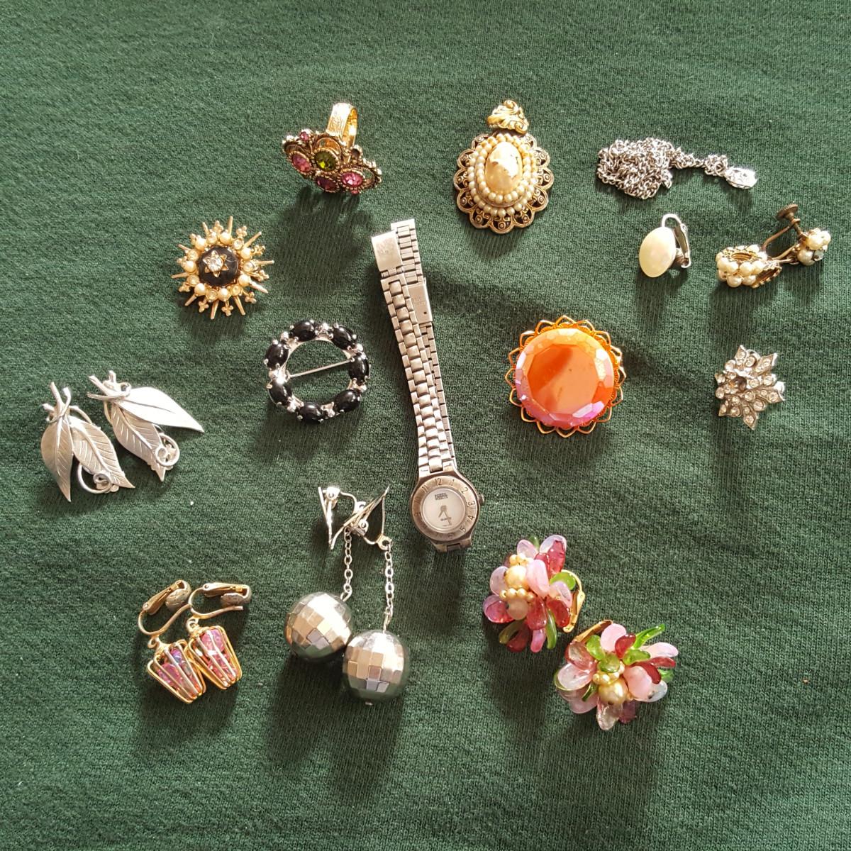 This auction lot is for a Bag of Miscellaneous Vintage Jewelry that holds 4 pair of nice, stylish earrings that are equipped with the clip-on fastener. Plus 3 costume pins, 1 dinner ring, a Fossil watch, a necklace pendant that holds a rough "pearl" but needs to be glued, 3 single earrings and a metal chain. Great for wearing or art projects.