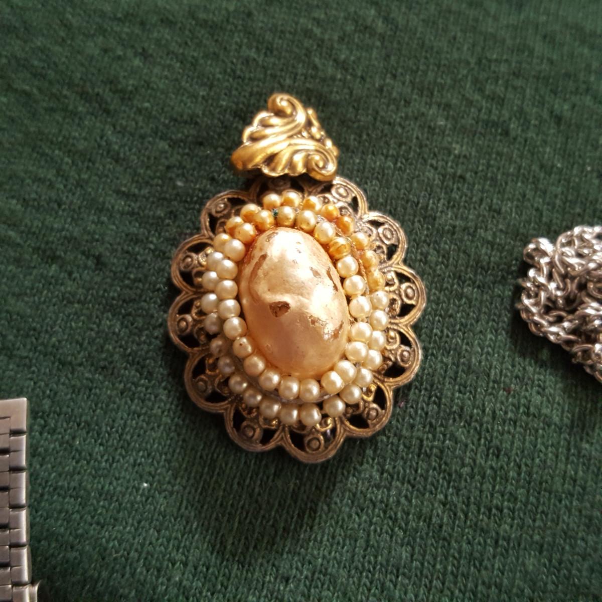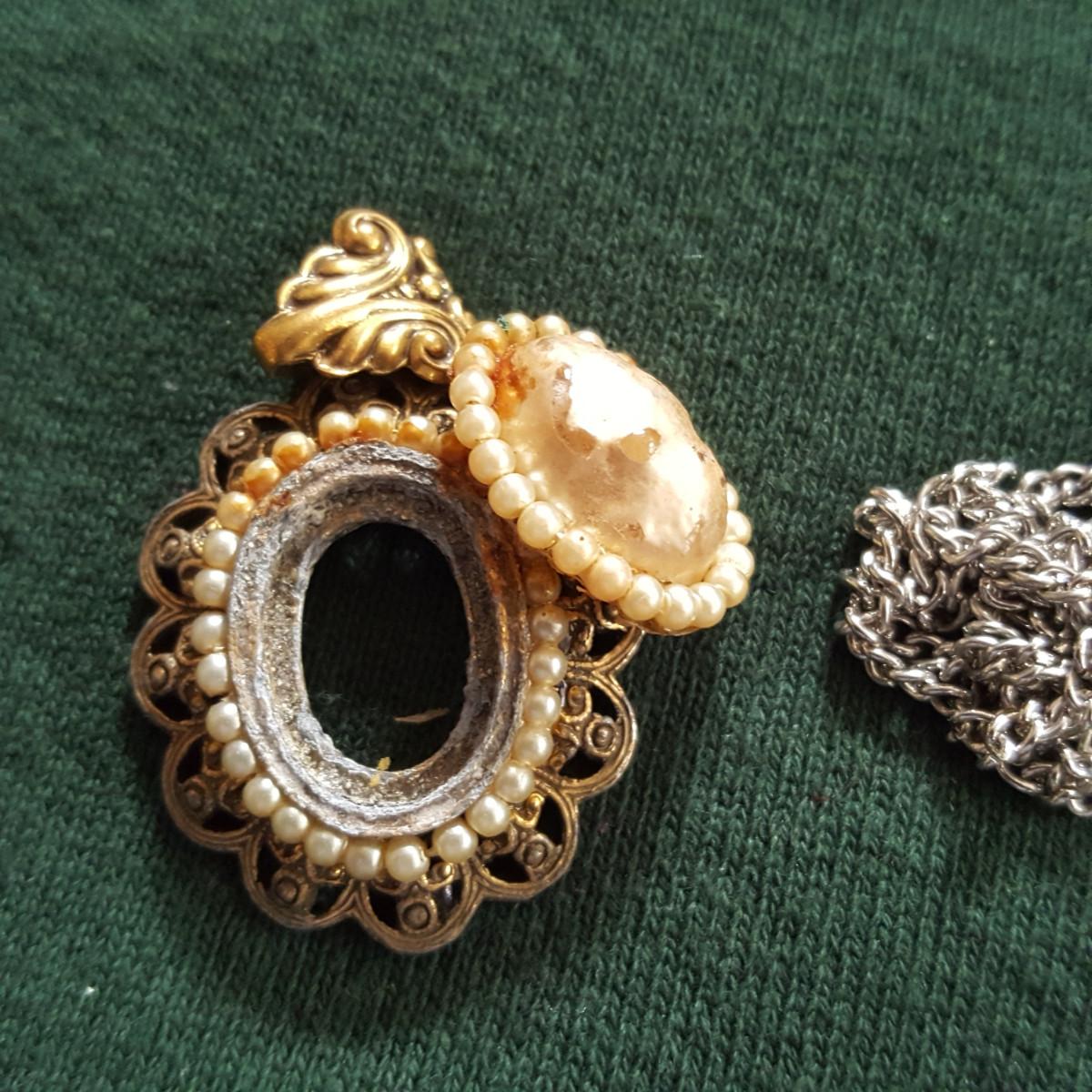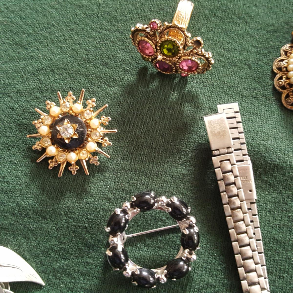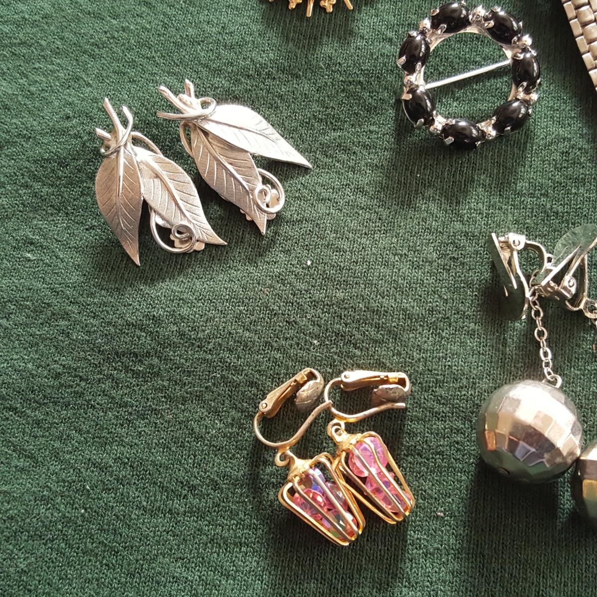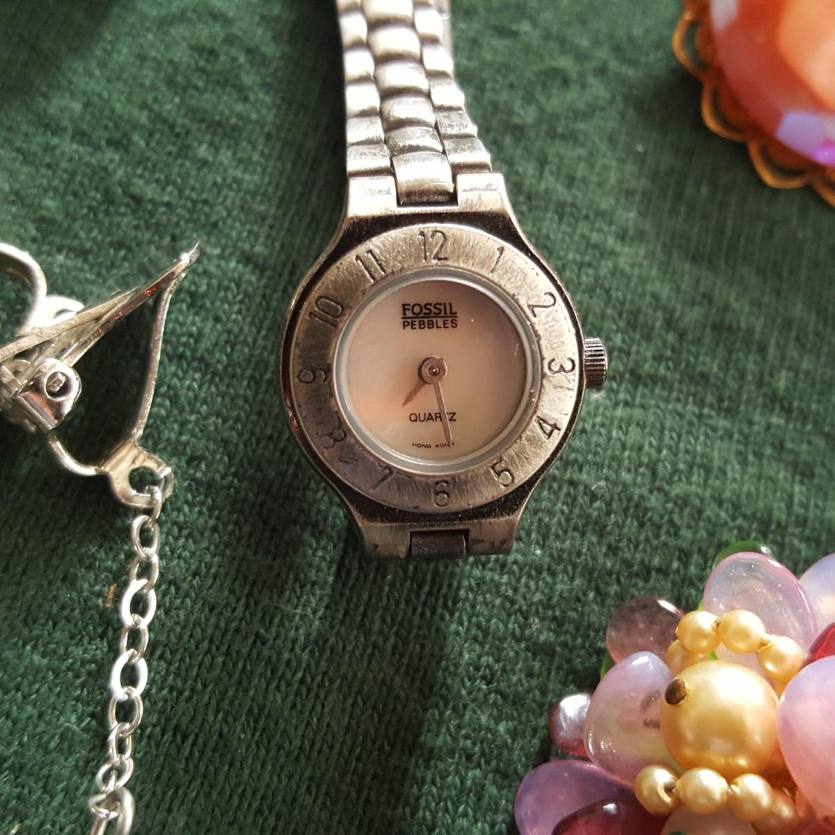 This auction lot is for a Bag of Miscellaneous Vintage Jewelry that holds 4 pair of nice, stylish earrings that are equipped with the clip-on fastener. Plus 3 costume pins, 1 dinner ring, a Fossil watch, a necklace pendant that holds a rough "pearl" but needs to be glued, 3 single earrings and a metal chain. Great for wearing or art projects.