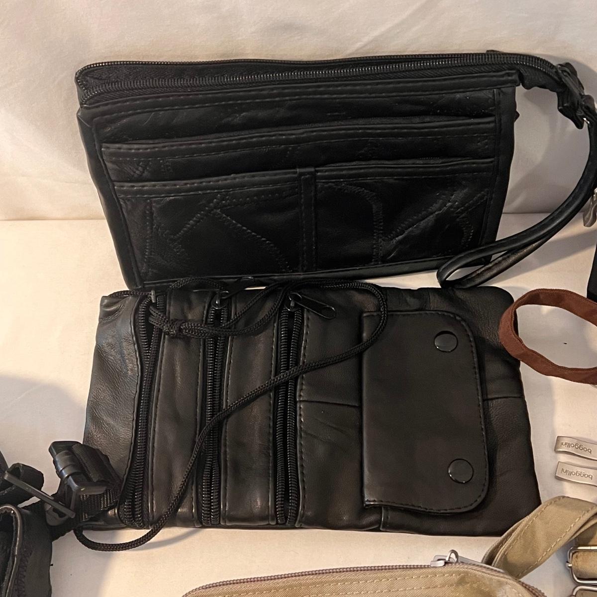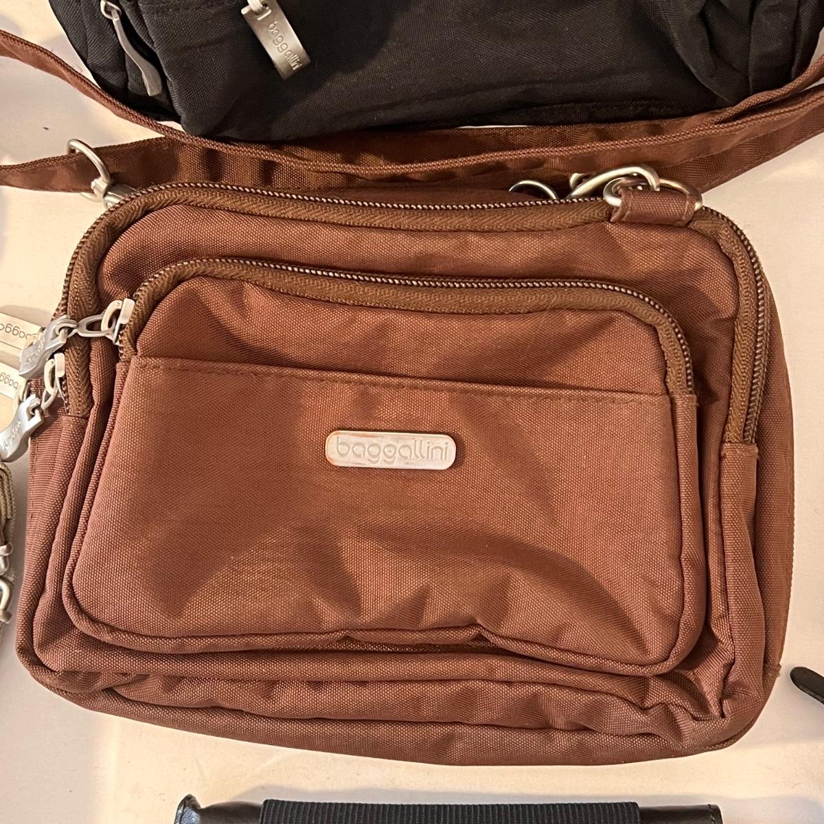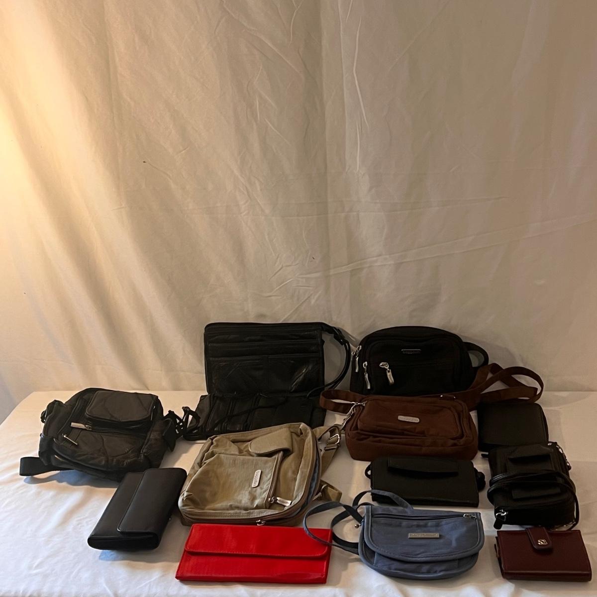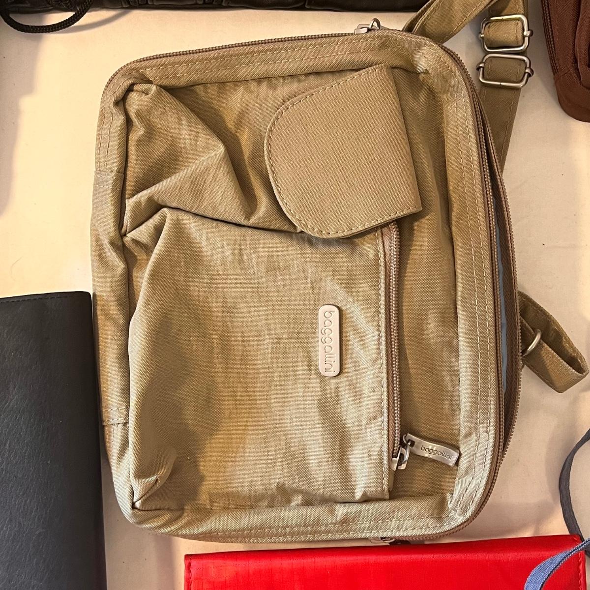 This lot comes with around ten bags of various sizes. There are around four Baggallini branded bags, one Samsonite wallet, one Buxton clutch, one Ohio Bag Corp, and more. Taupe Baggallini bag measures approximately 9.5" x 8." Shipping available.