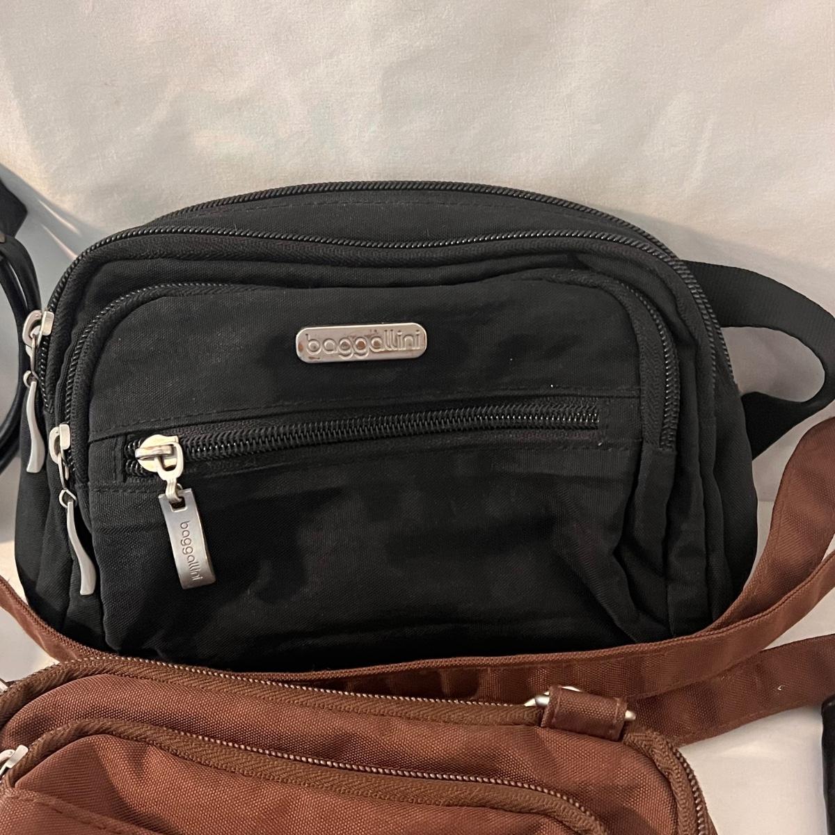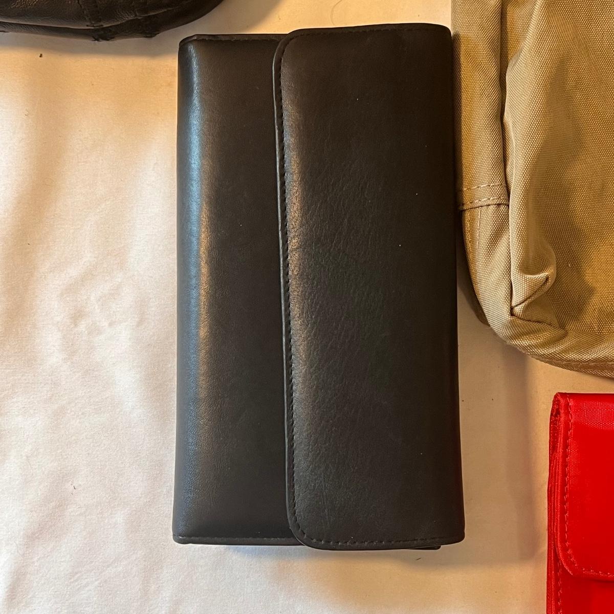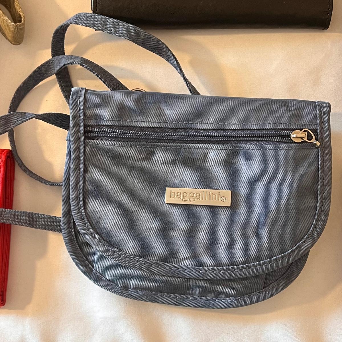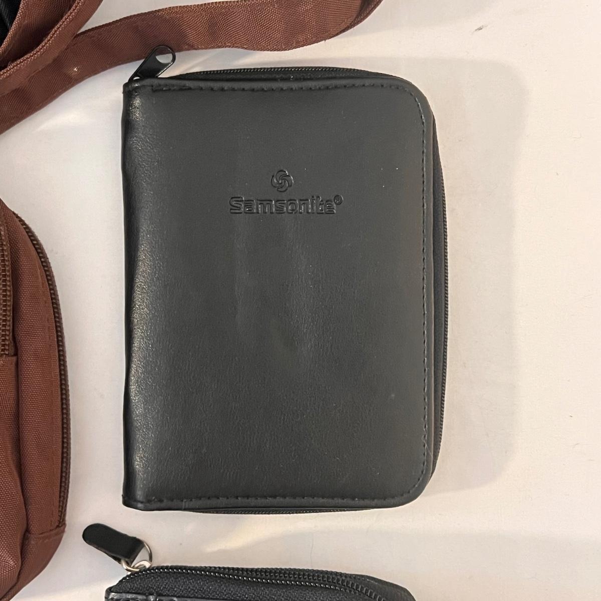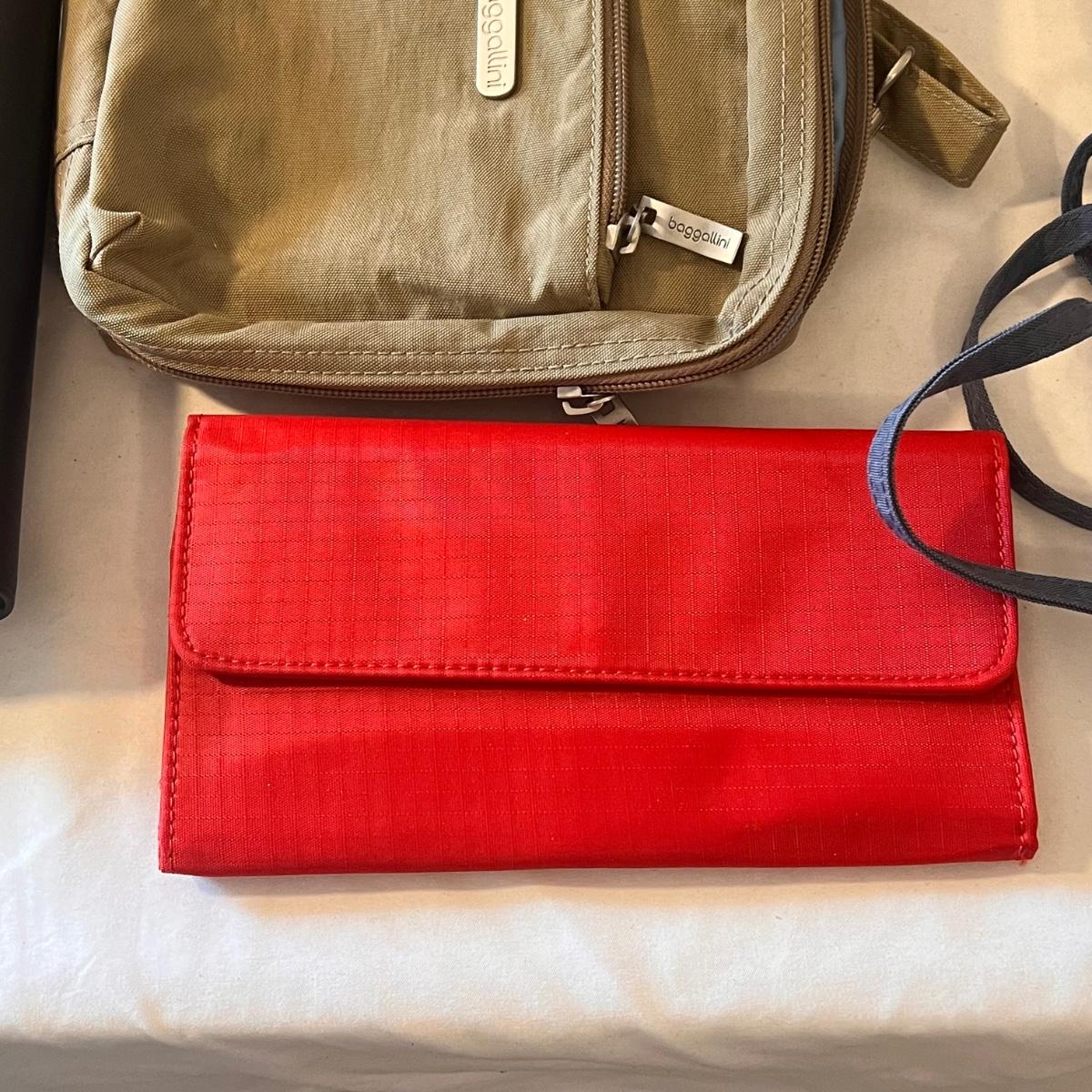 This lot comes with around ten bags of various sizes. There are around four Baggallini branded bags, one Samsonite wallet, one Buxton clutch, one Ohio Bag Corp, and more. Taupe Baggallini bag measures approximately 9.5" x 8." Shipping available.