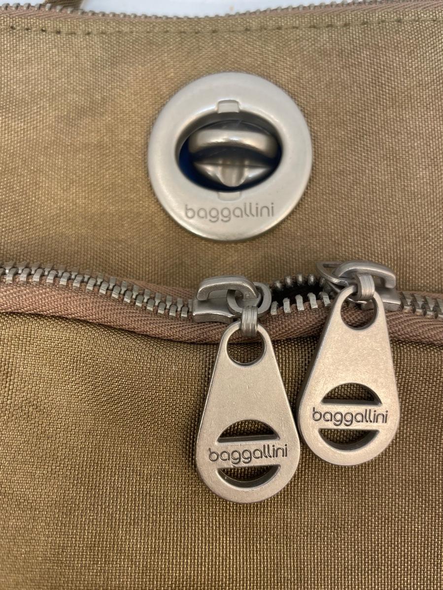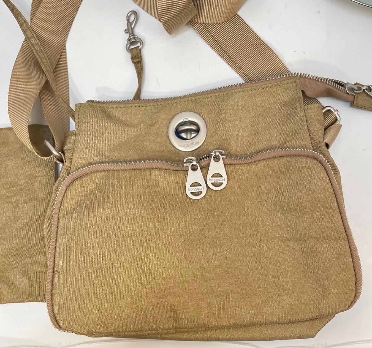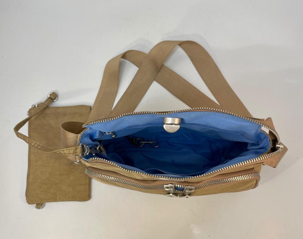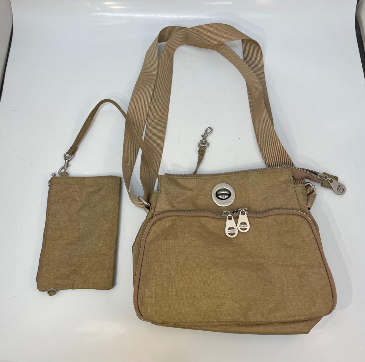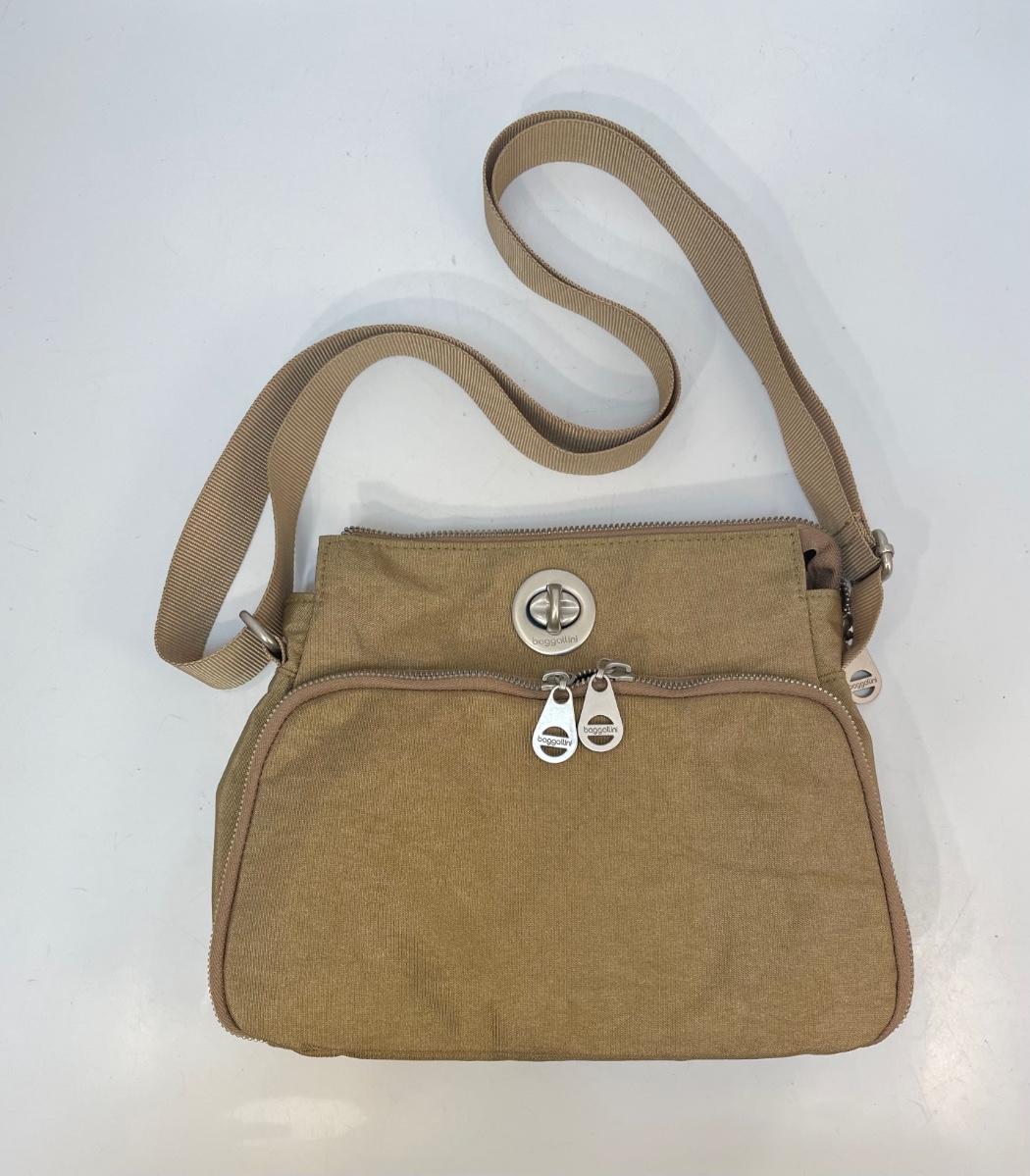 Baggallini Cross Body Bag in taupe water-resistant nylon. Blue lining. Includes separate small zippered pouch for holding smaller items, passports, money, etc.