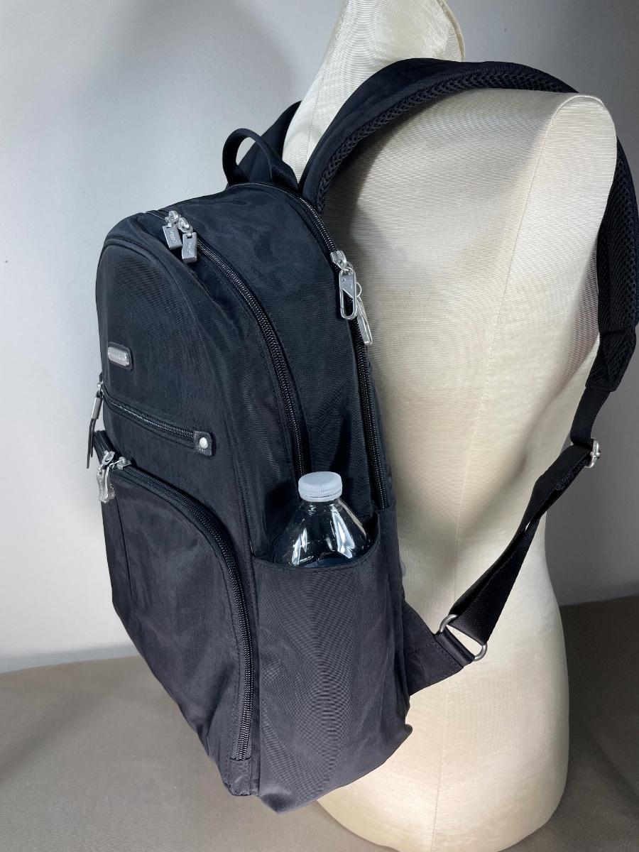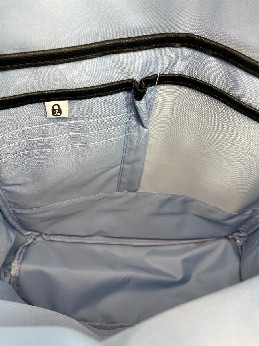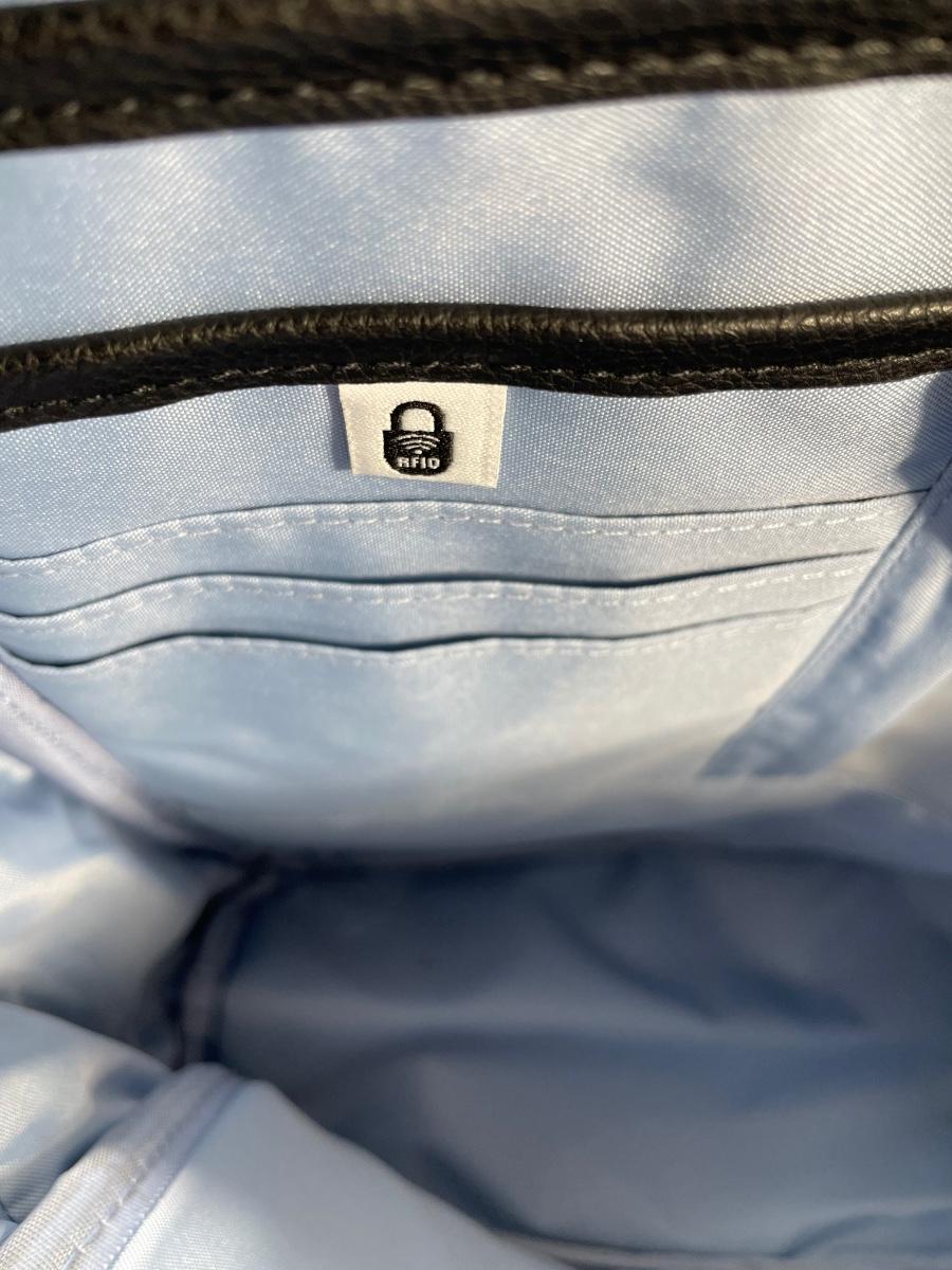 NWOT Large black nylon backpack with light blue interior. Padded for carrying a laptop. RFID area for safe credit card keeping.