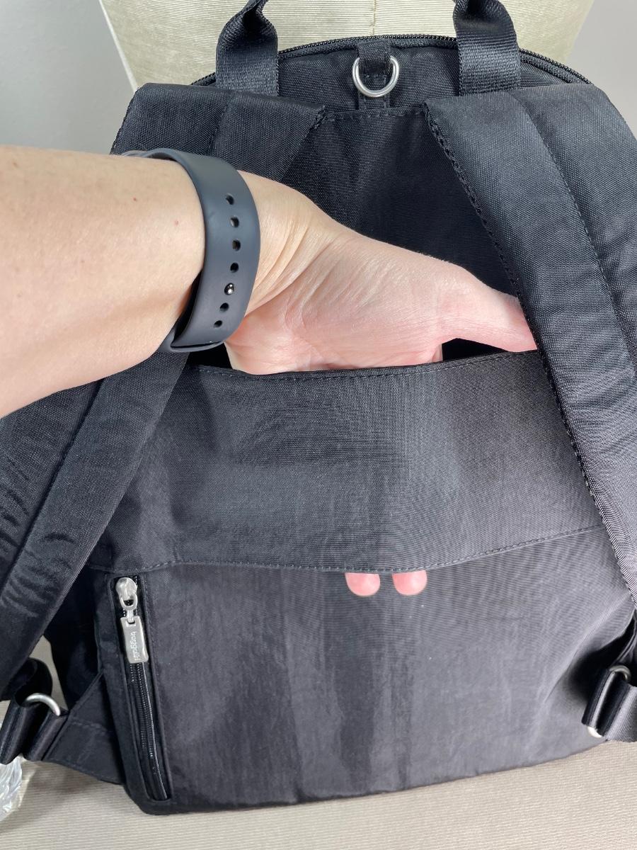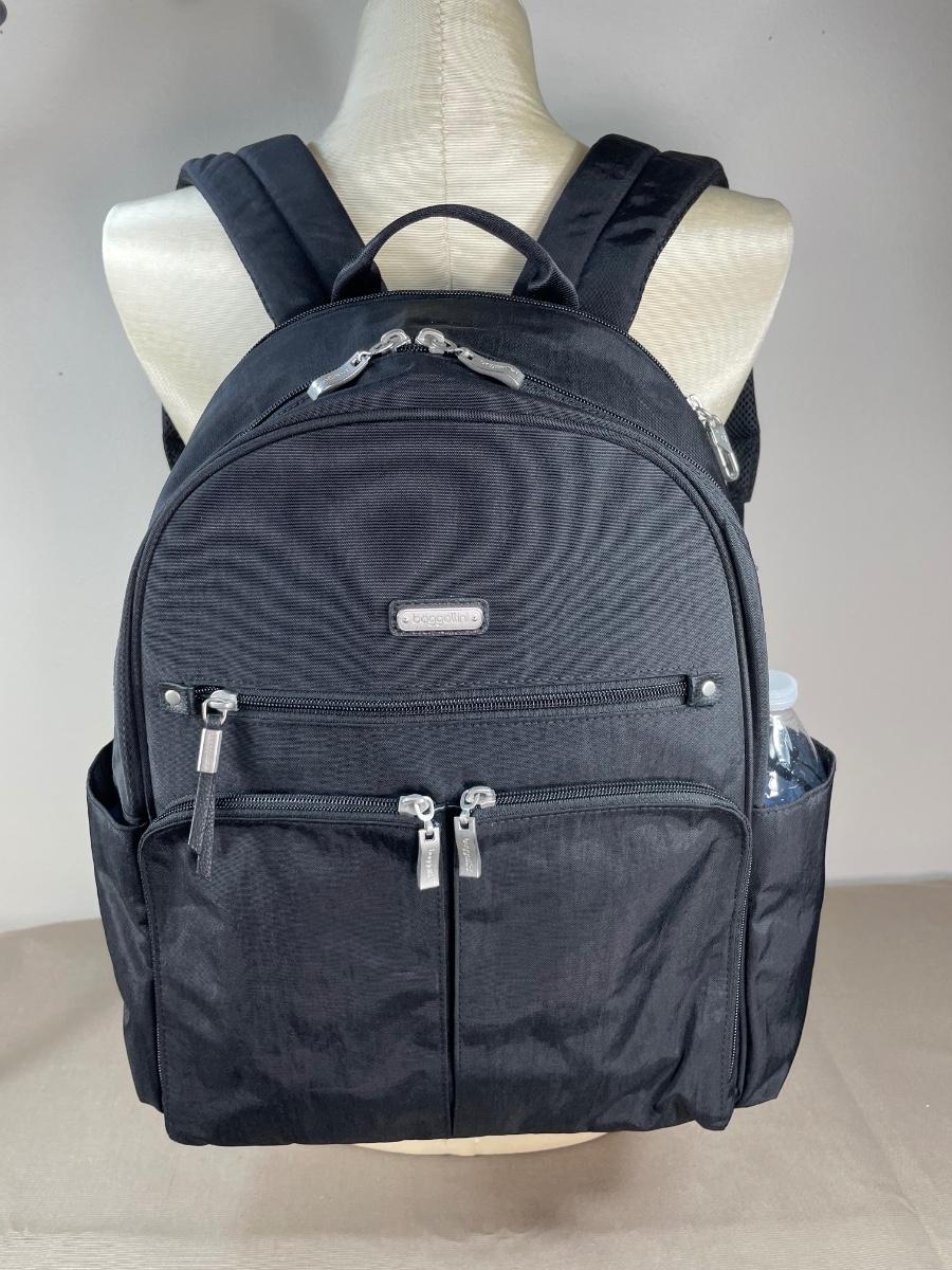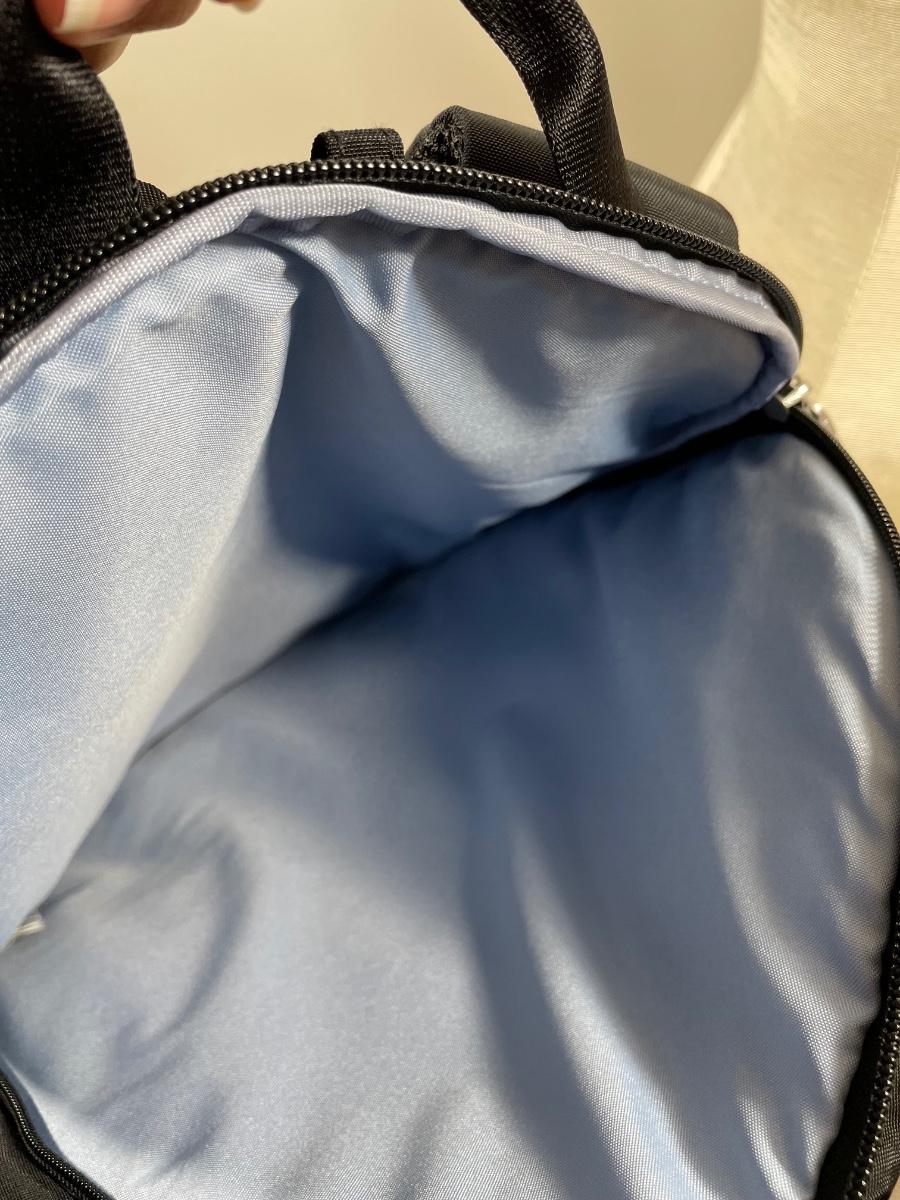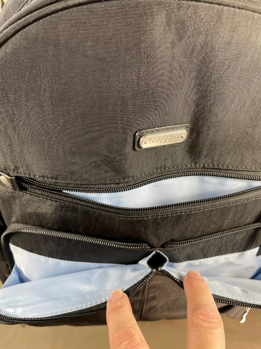 NWOT Large black nylon backpack with light blue interior. Padded for carrying a laptop. RFID area for safe credit card keeping.