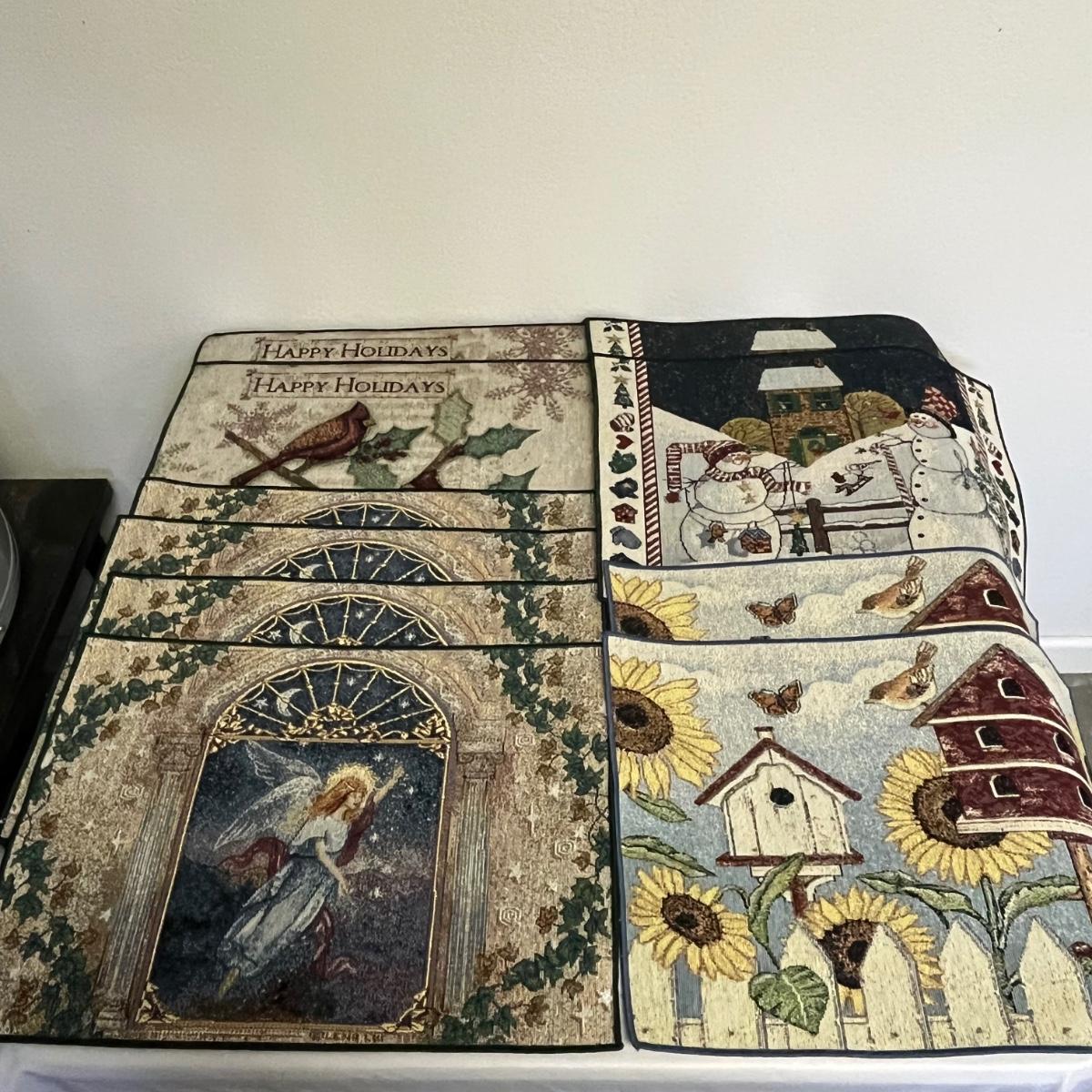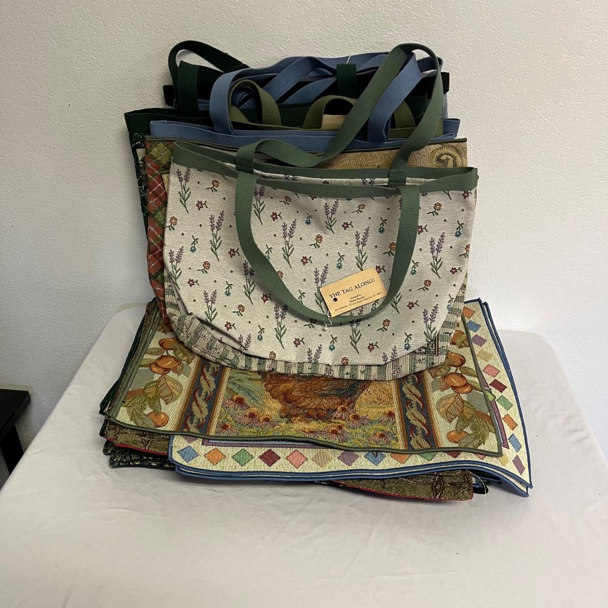 Lot includes six bags with handles, three without handles including one from The Tag Along of Asheville. Bags and the 36 placemats are all fabric. Bags measure 17.5” x 3” x 12” without handles.