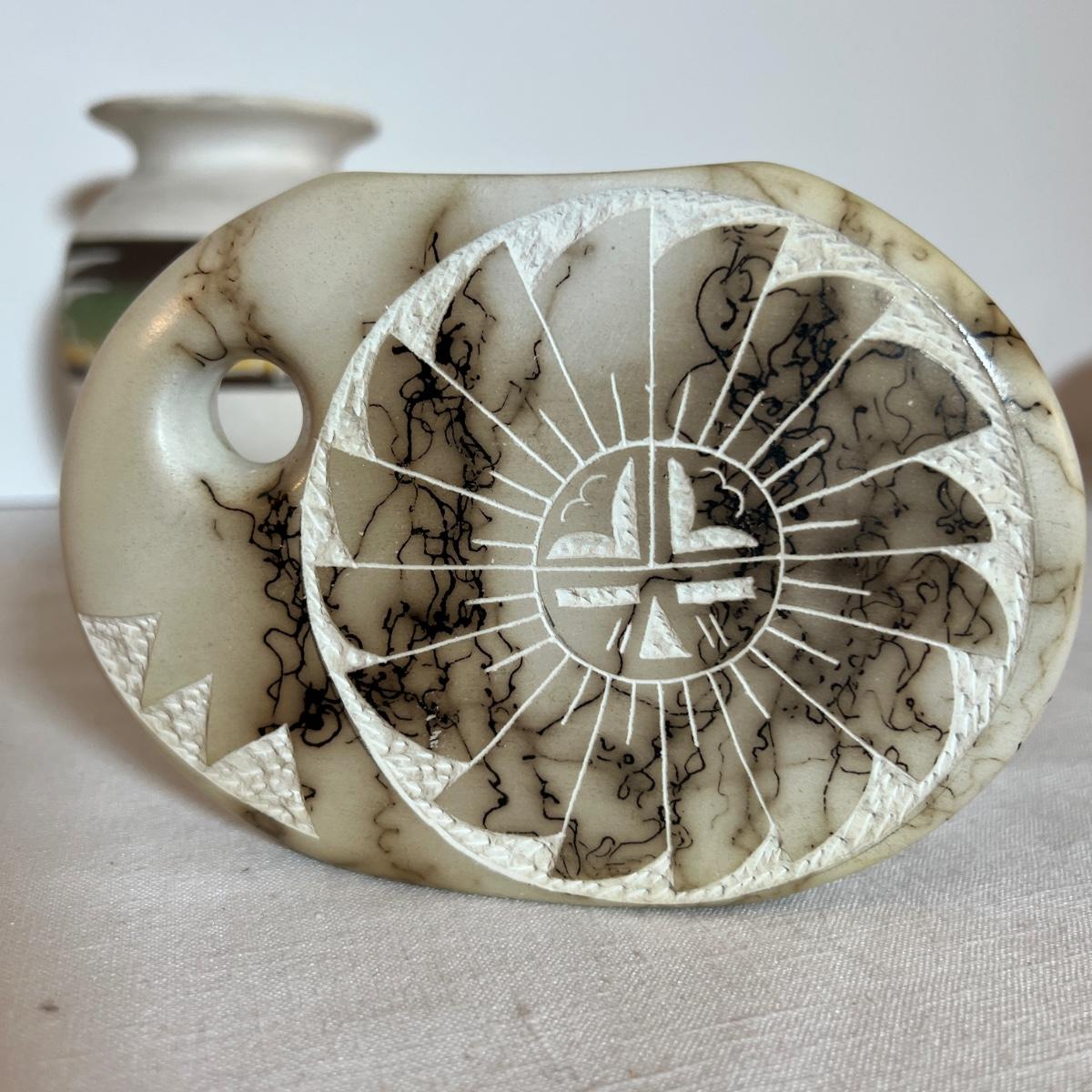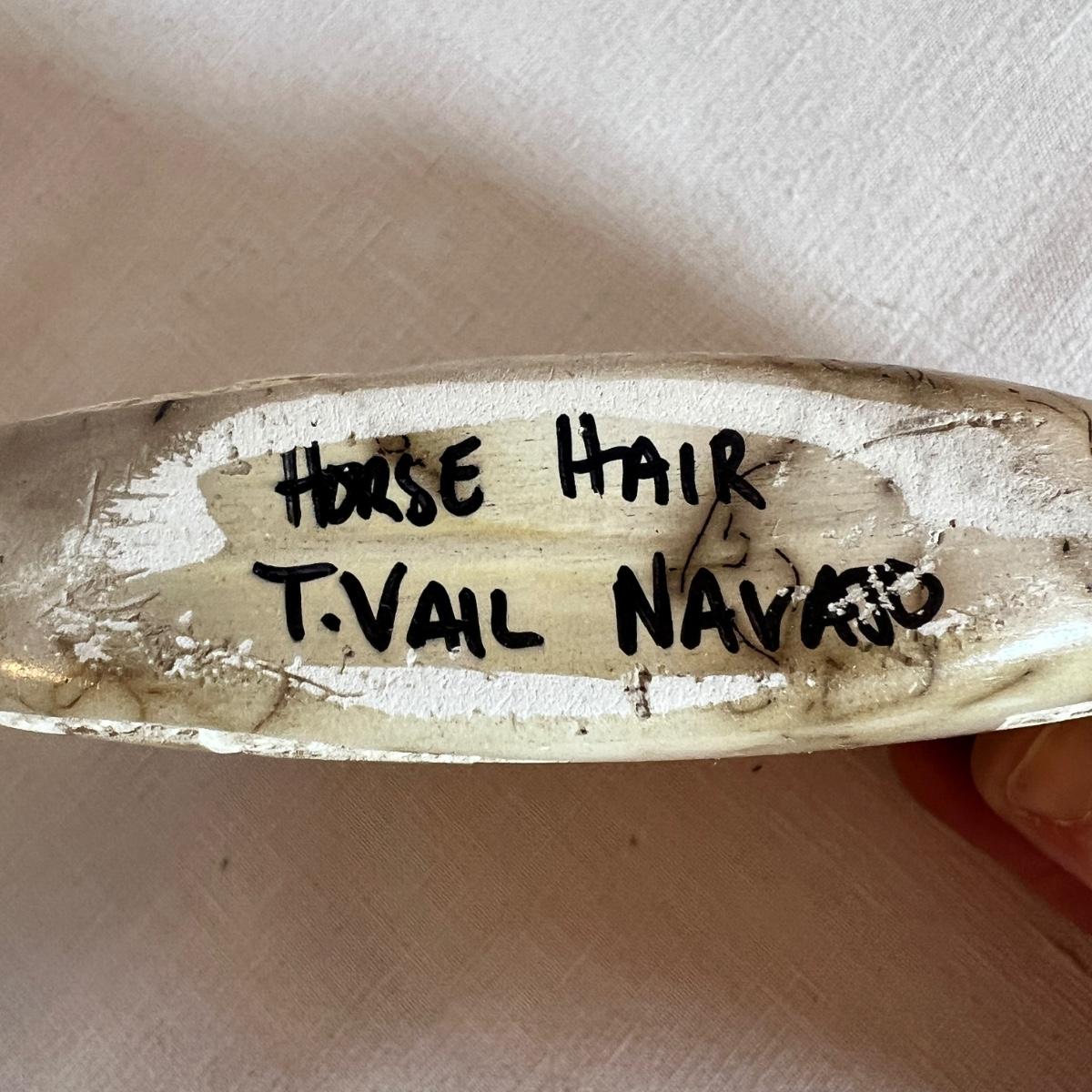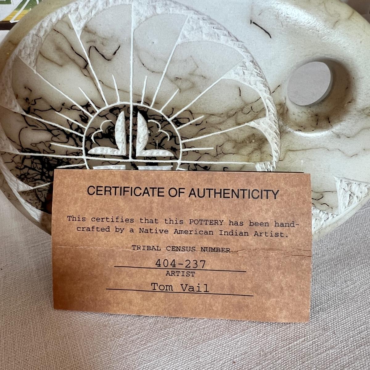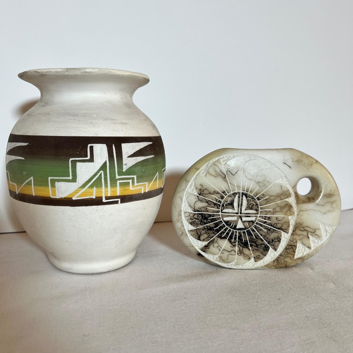 The taller piece is by the Ute Mountain Indian Tribe, signed on the bottom. The shorter piece is by Tom VAIL and comes with a certificate of authenticity. Vail is a Native American NAVAJO artist. The vase is a horse hair HAND CARVED sun art 2 sided pottery vase.