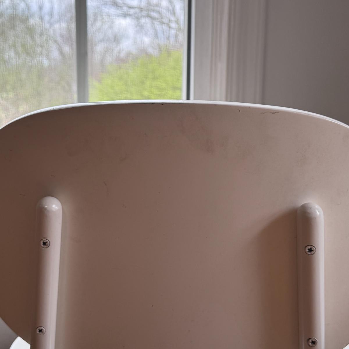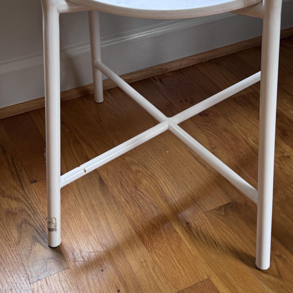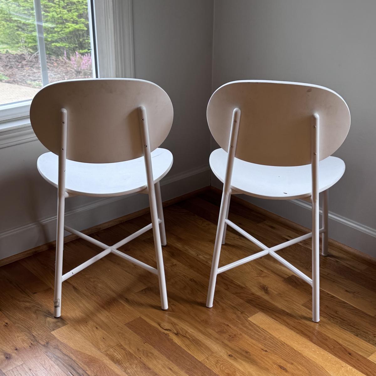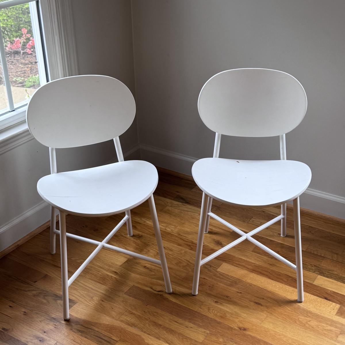 This lot includes two identical Bailey play chairs. Each chair is made of wood and metal - both are painted white. The chairs individually measure 16” x 14” x 27”H with a seat height of 14.5". There are a few signs of wear including a few cracks in the paint on the seats - see pictures included. Local pickup only.