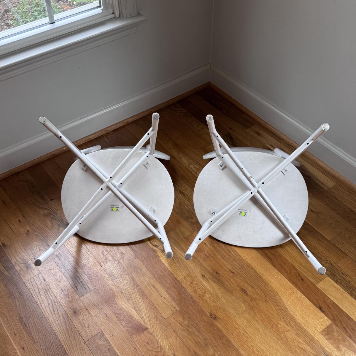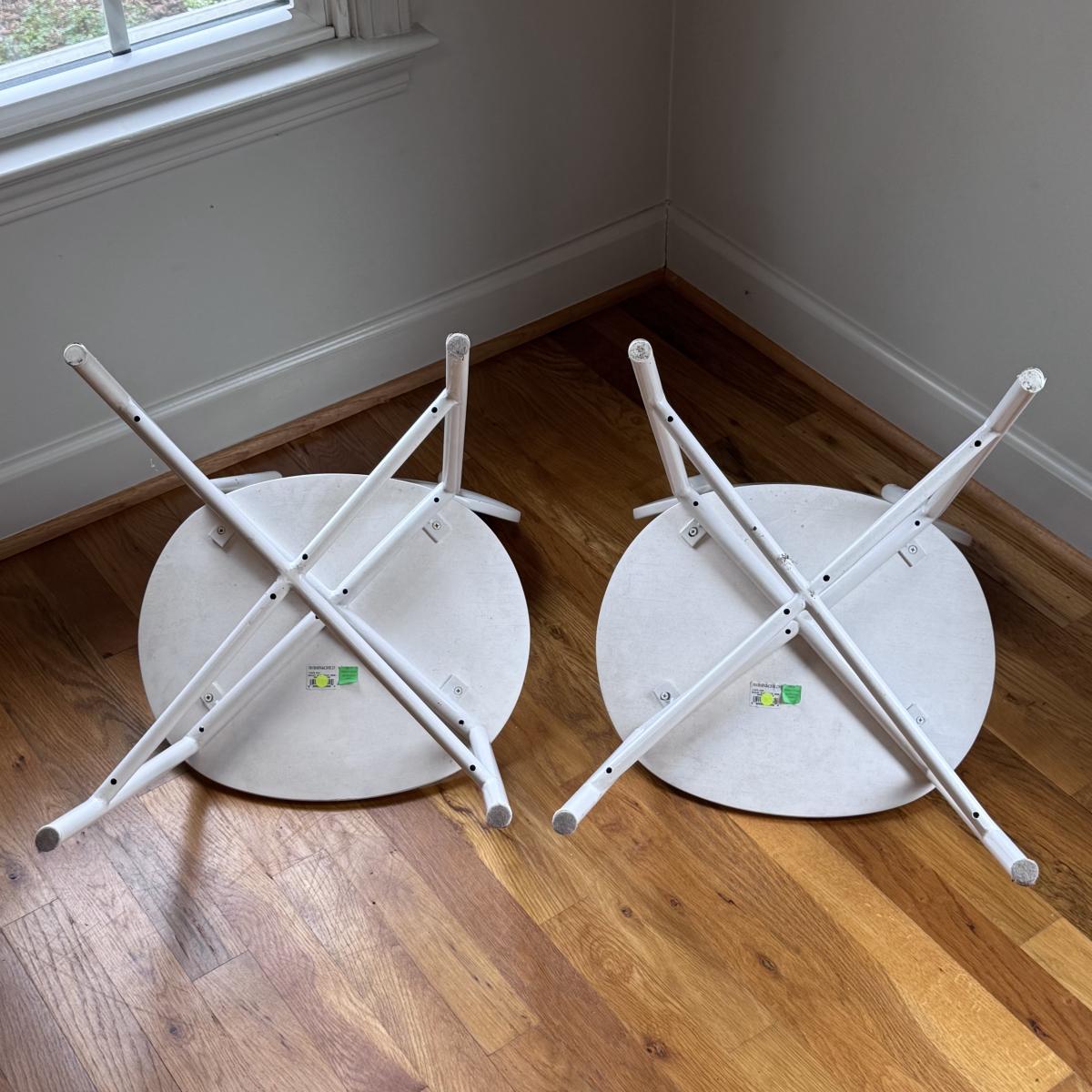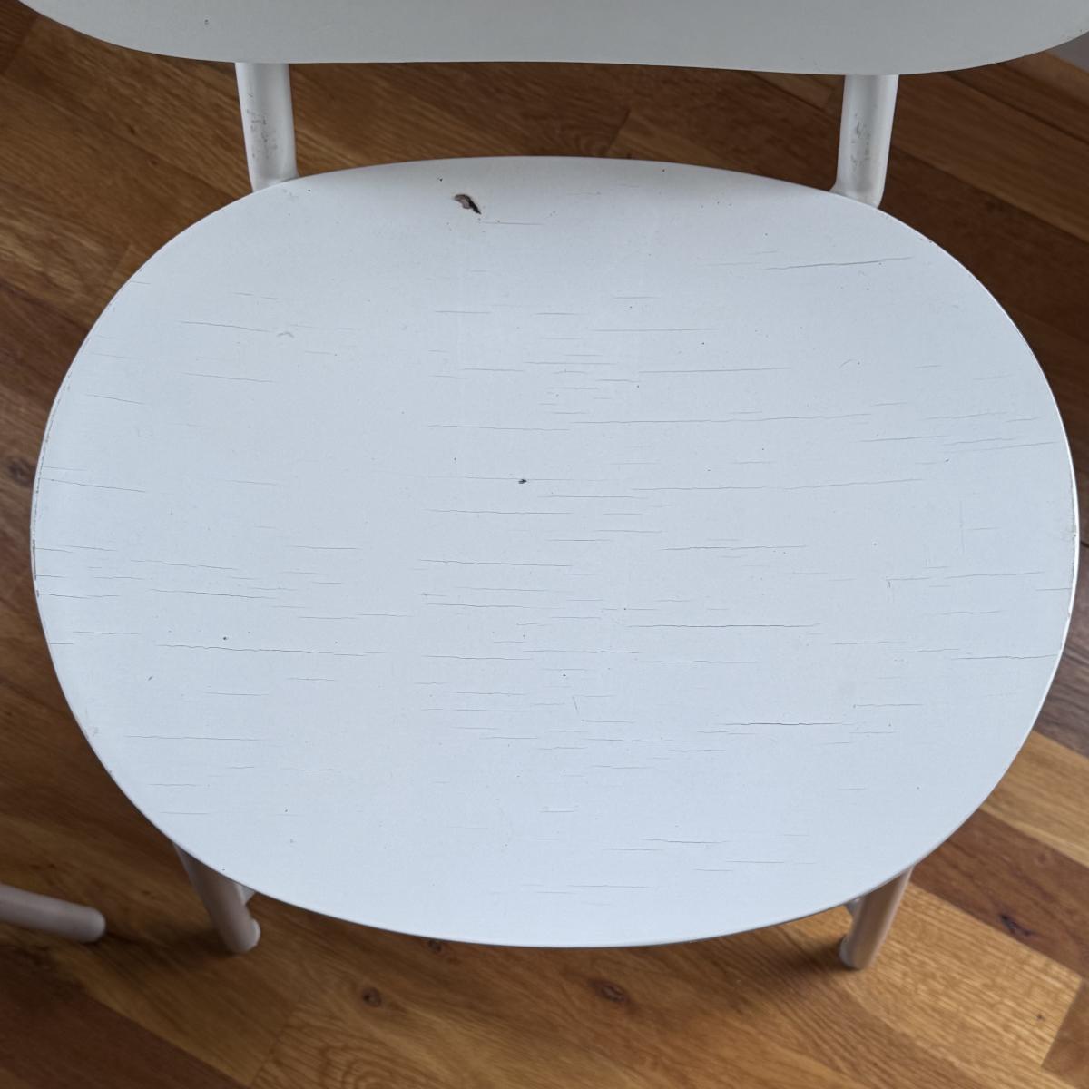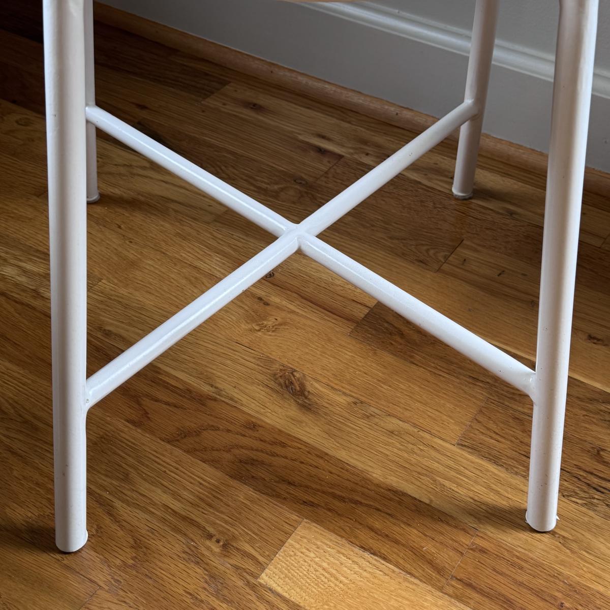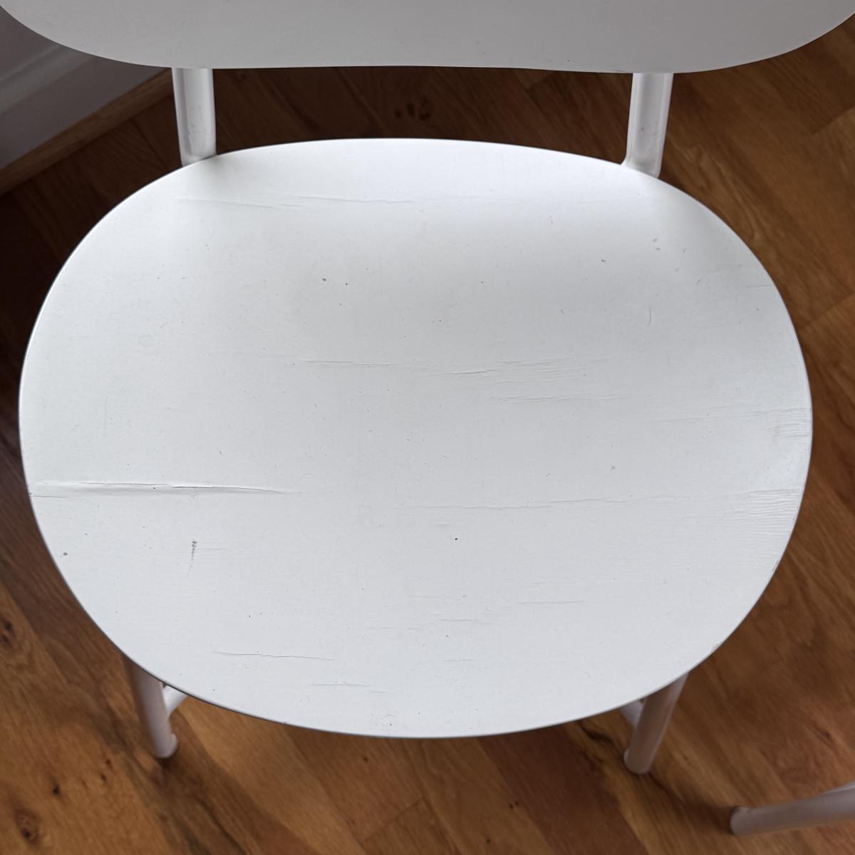 This lot includes two identical Bailey play chairs. Each chair is made of wood and metal - both are painted white. The chairs individually measure 16” x 14” x 27”H with a seat height of 14.5". There are a few signs of wear including a few cracks in the paint on the seats - see pictures included. Local pickup only.