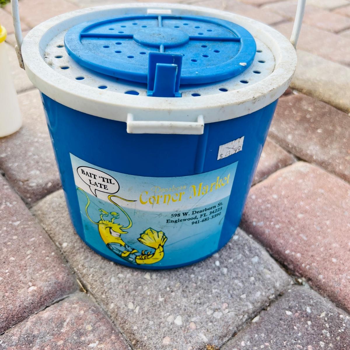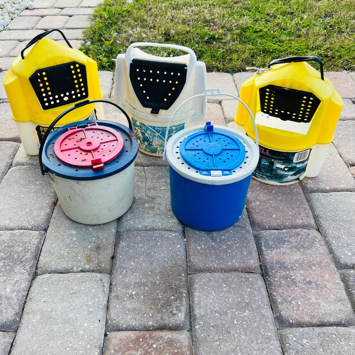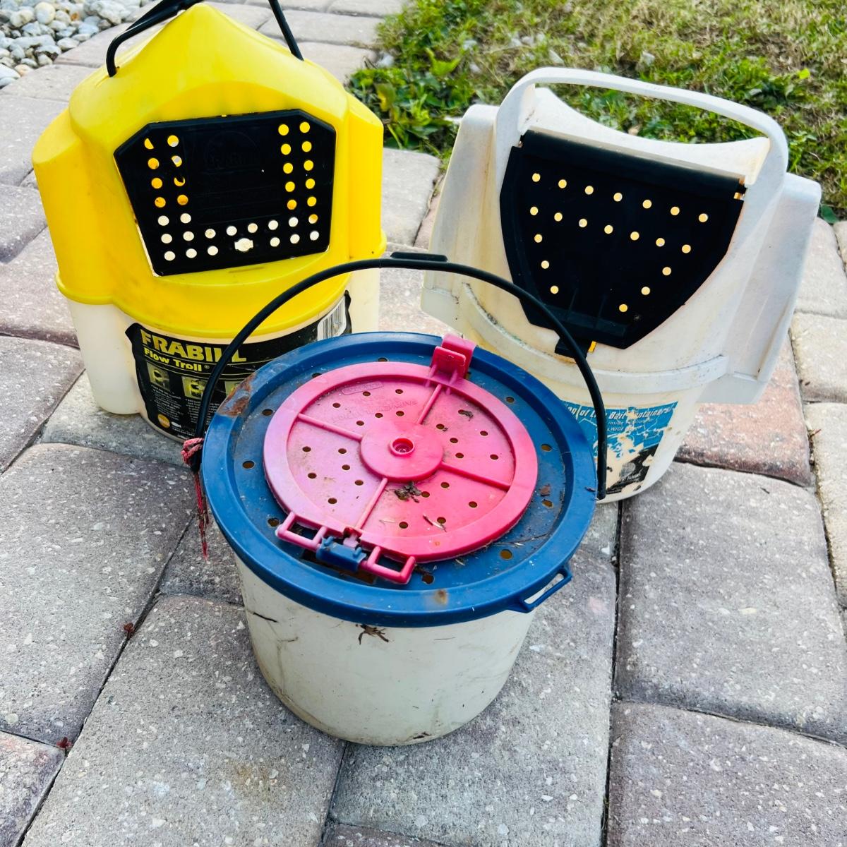 Five bait buckets. Larger ones measure 12”H and 7”D
