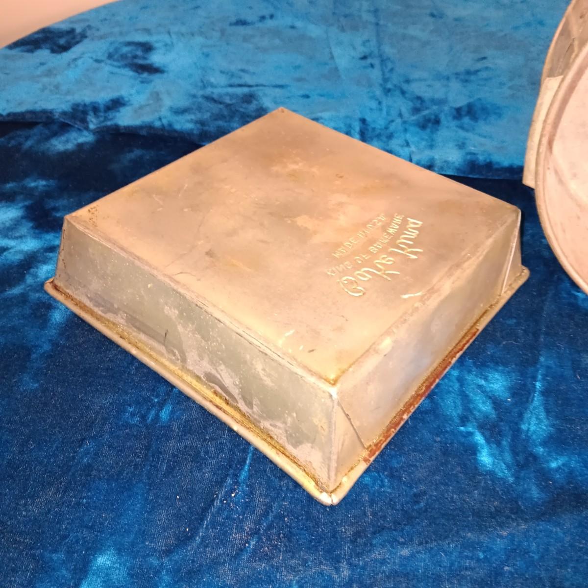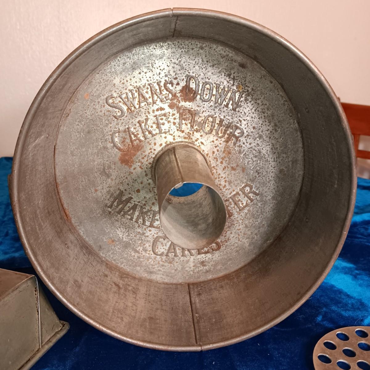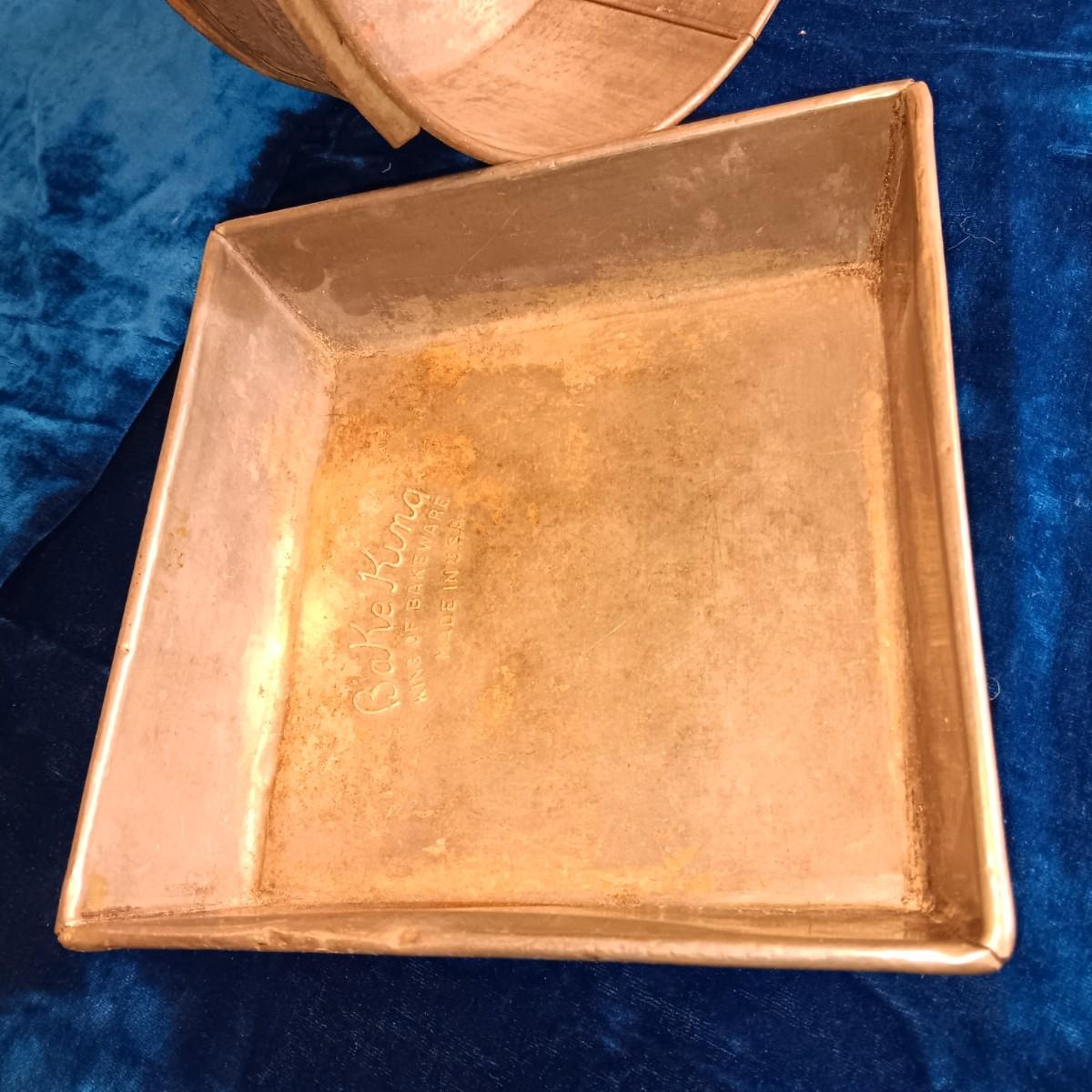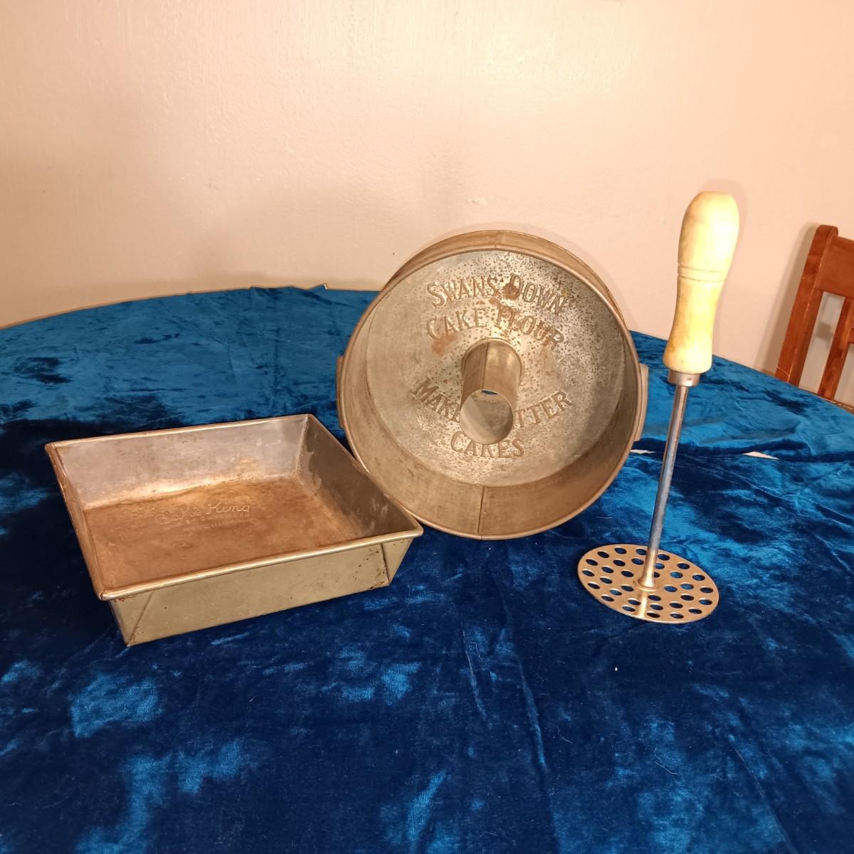 BAKE KING SQUARE PAN, SWANS DOWN CAKE PAN AND A MASHER W/WOODEN HANDLE