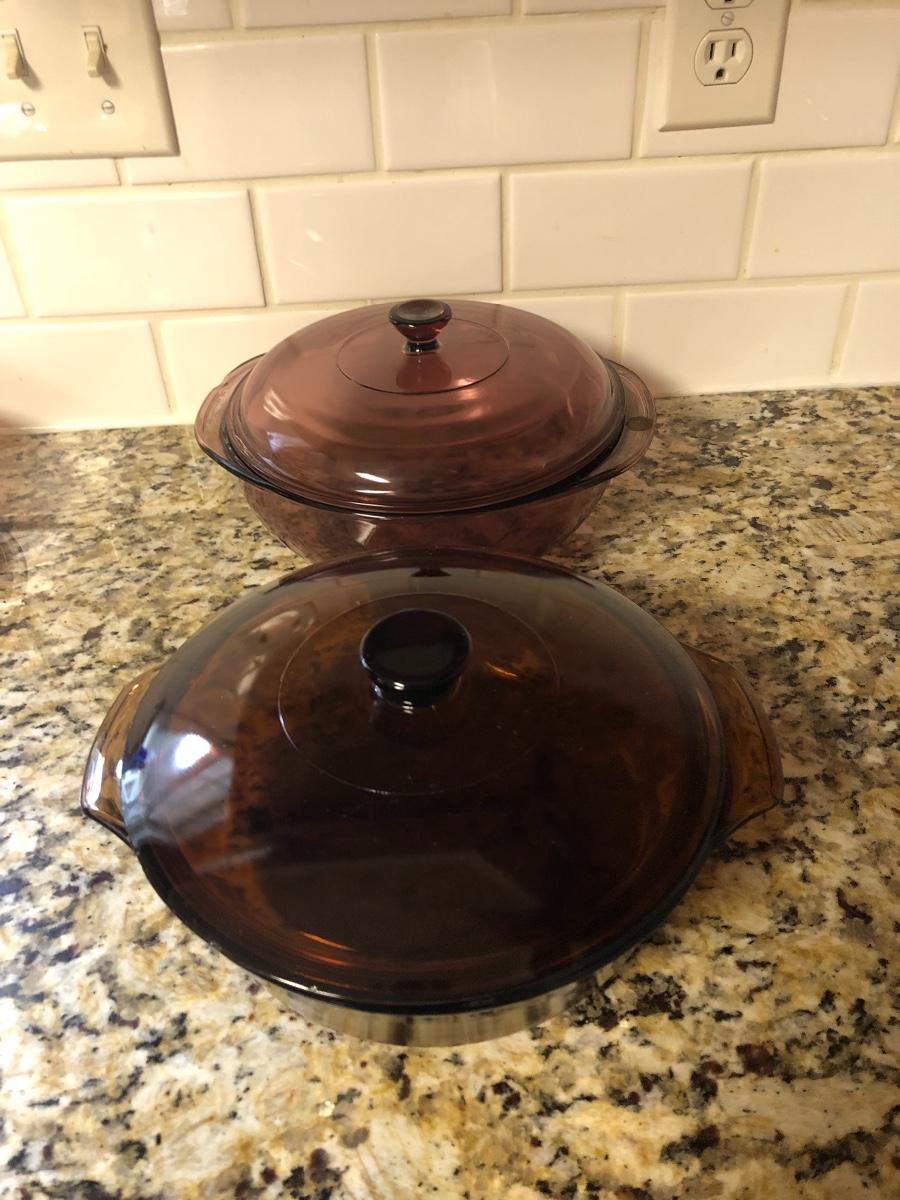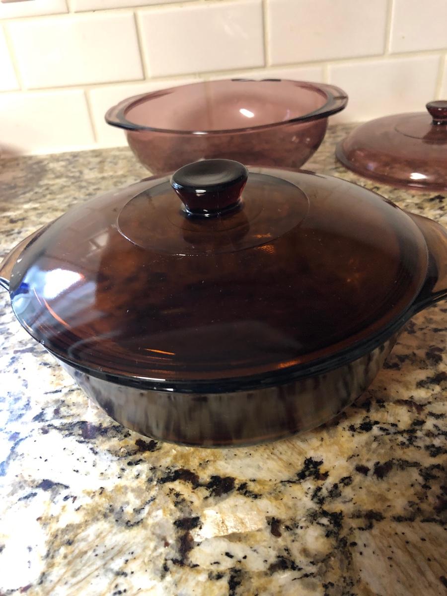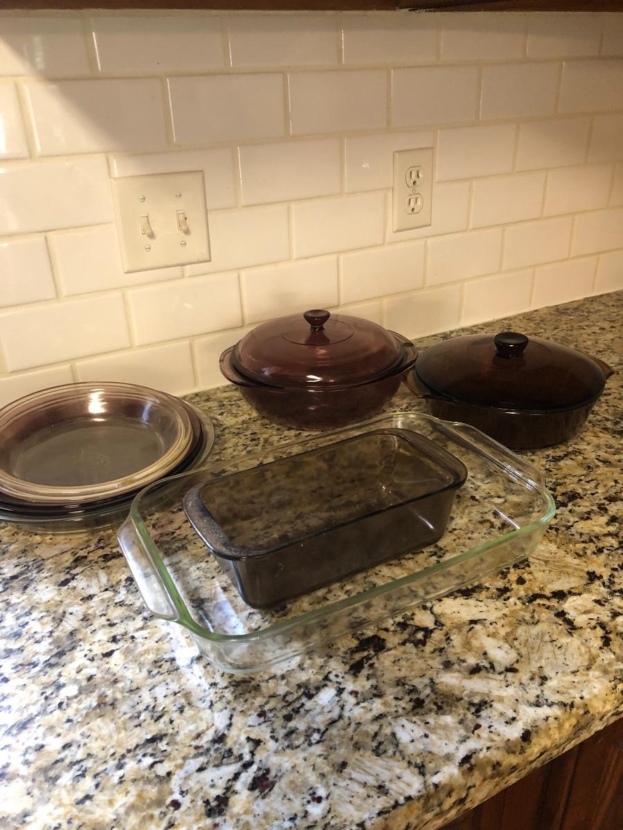 This lot includes one purple colored Pyrex baking dish and one dark yellow Anchor Hocking dish, both with lids (8.5” in diameter), two purple Pyrex pie plates, (10” in diameter), two clear pie plates (8.5” in diameter) and a larger clear pie plate (11” in diameter) and finally a loaf pan and Pyrex 3 quart baking dish. All items are glass. Shipping Available.