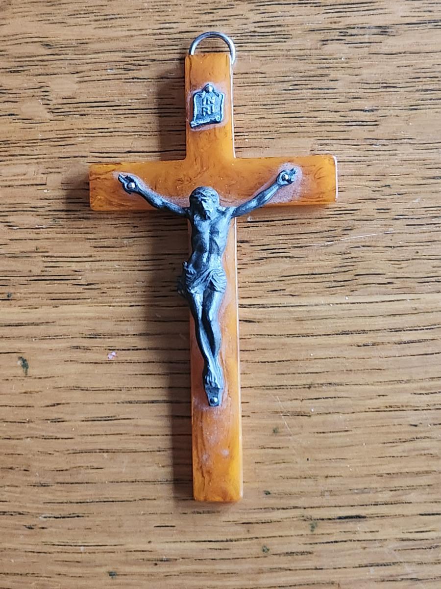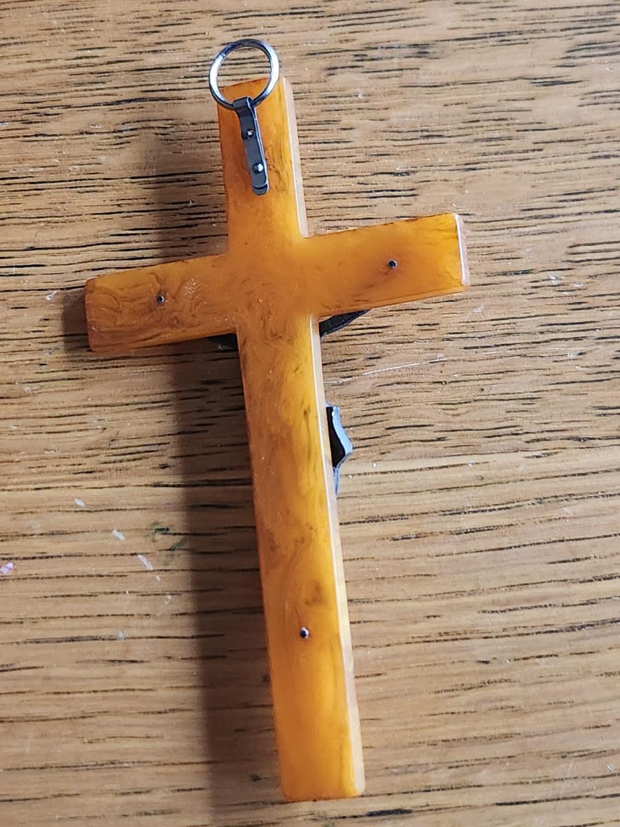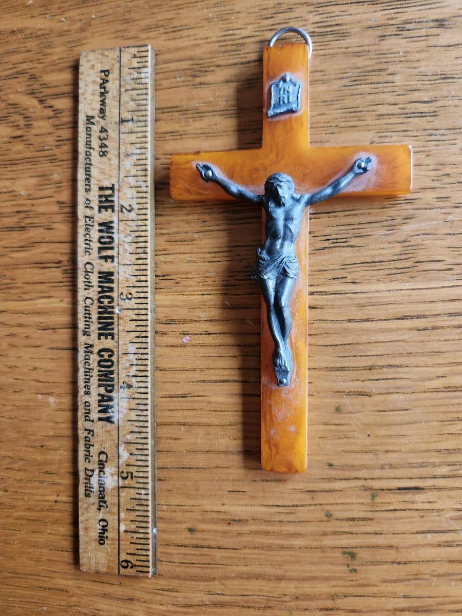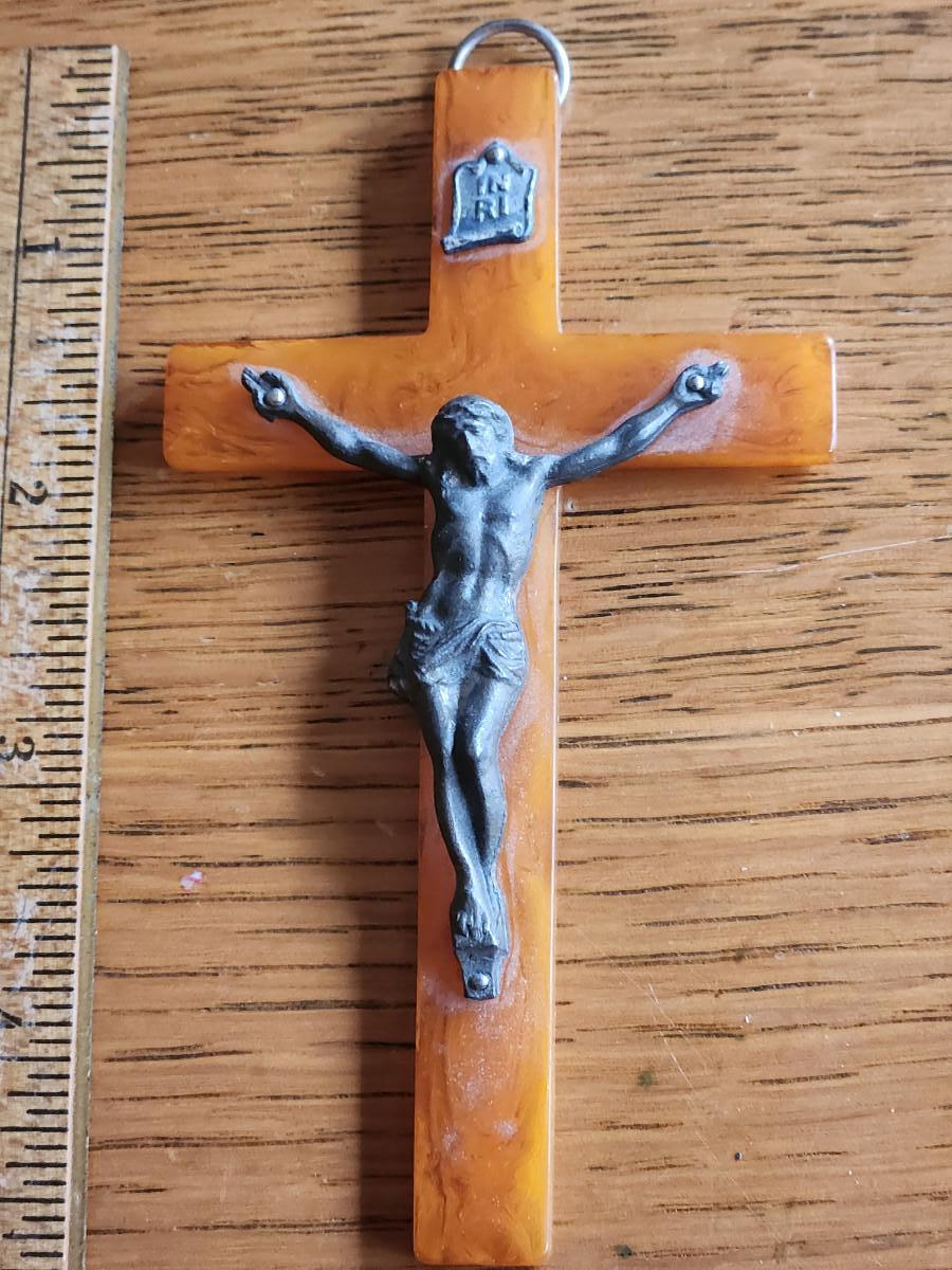 This auction lot is for a Bakelite Crucifix. The cross is bakelite material and the corpus is pot metal. See photo for size. Should have dusted this item before the picture was taken but it is a nice example of the genre.