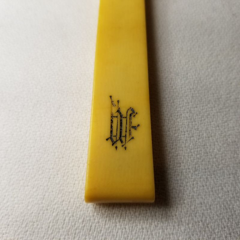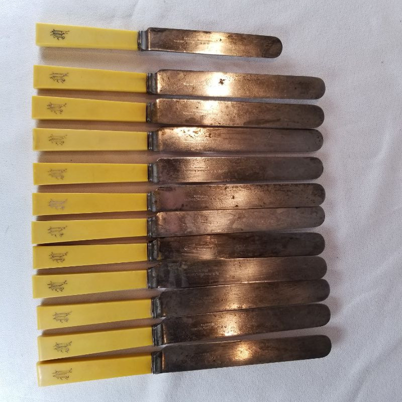 Set of 12 knives with Bakelite handles. 11 are dinner knives, 1 is shorter, maybe a spreader. They are monagramed with the letter 'W", but could be an "M' in the other direction. Condition is consistent with age and use. Overall good condition and quite unique.