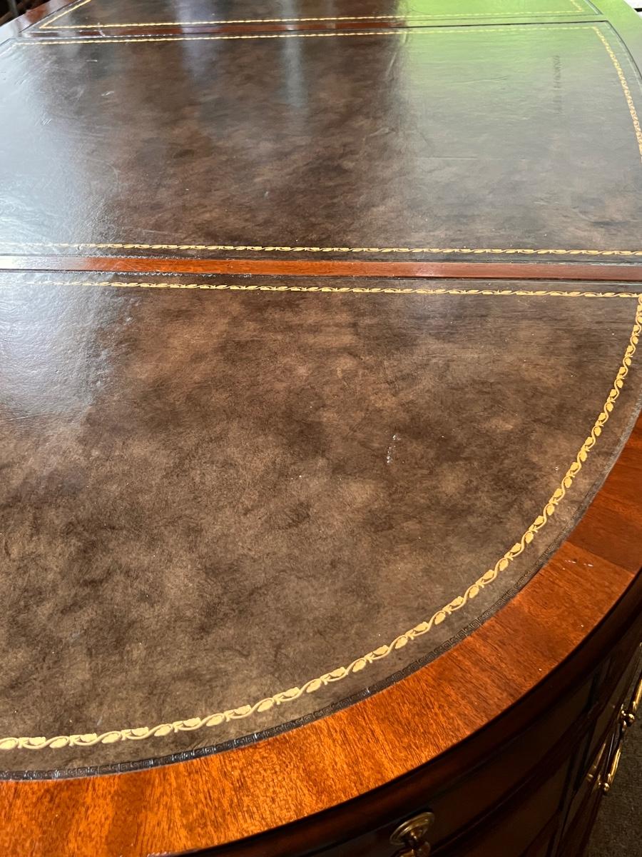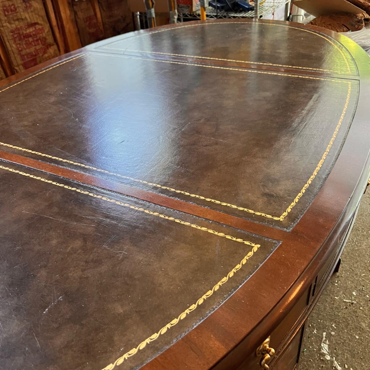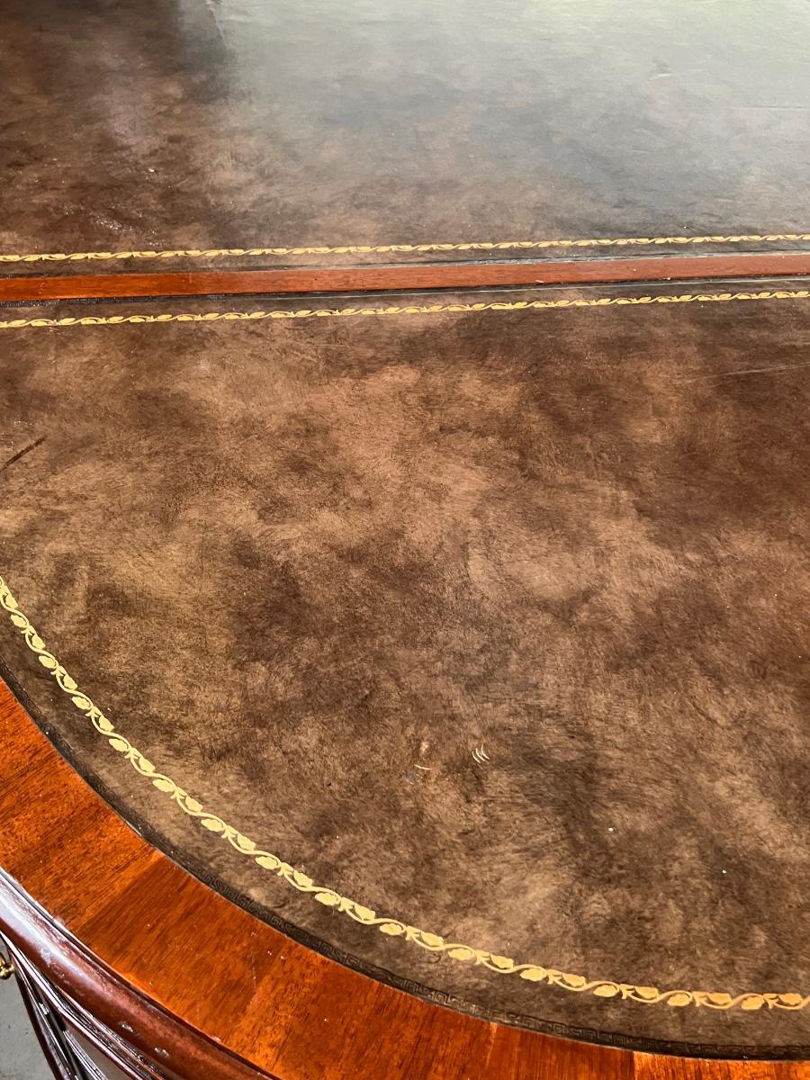 Condition: Its in good used condition. The leather top has some marks as shown in pics. There are some scratches here and there. 2 of the drawers are currently stuck. We are working to resolve this.