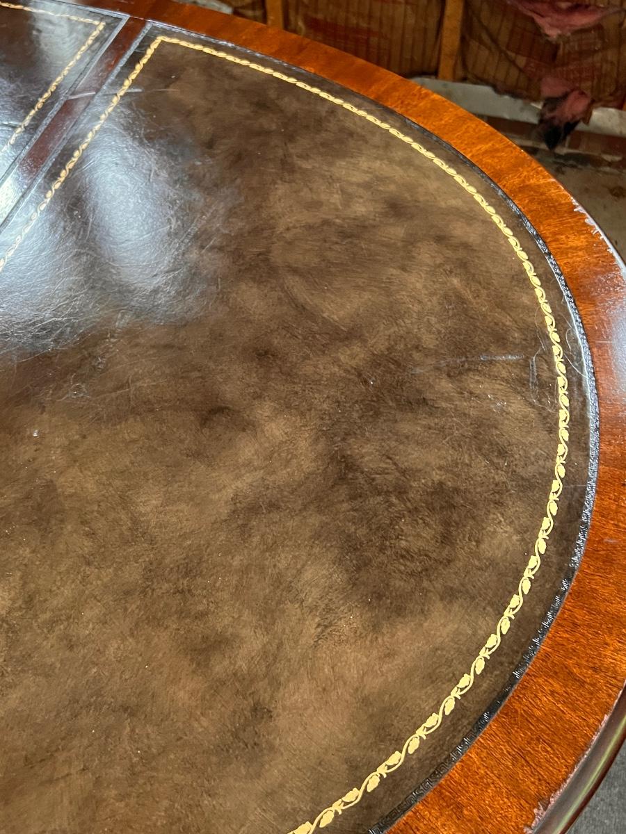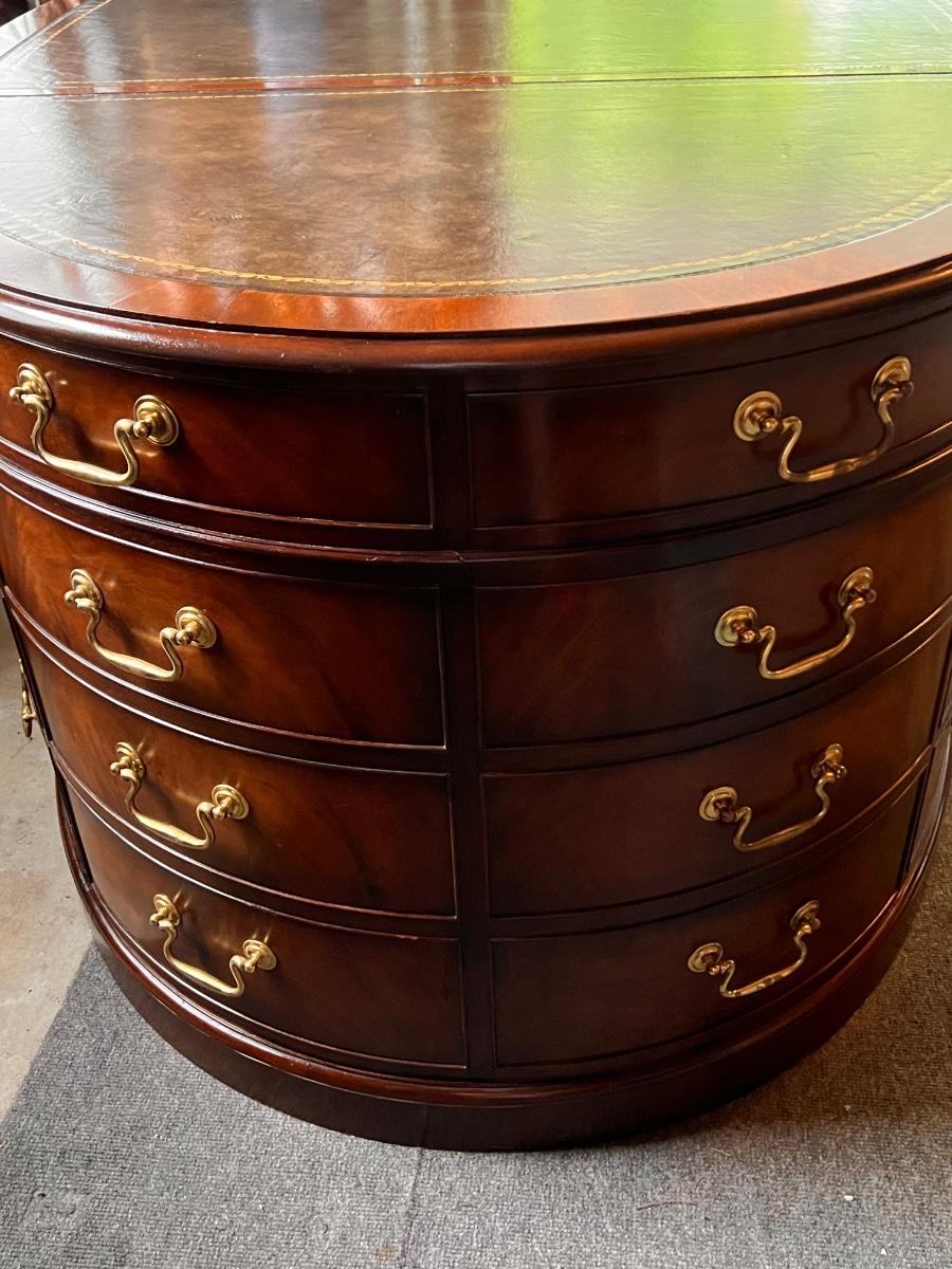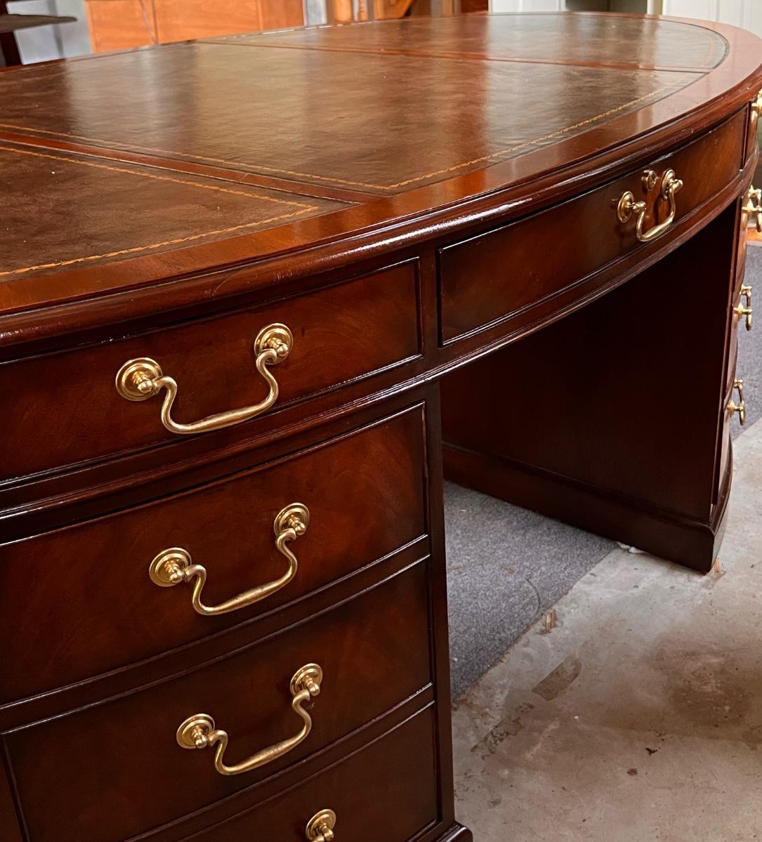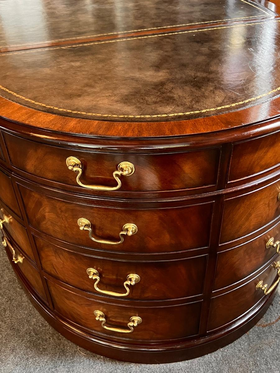 Condition: Its in good used condition. The leather top has some marks as shown in pics. There are some scratches here and there. 2 of the drawers are currently stuck. We are working to resolve this.
