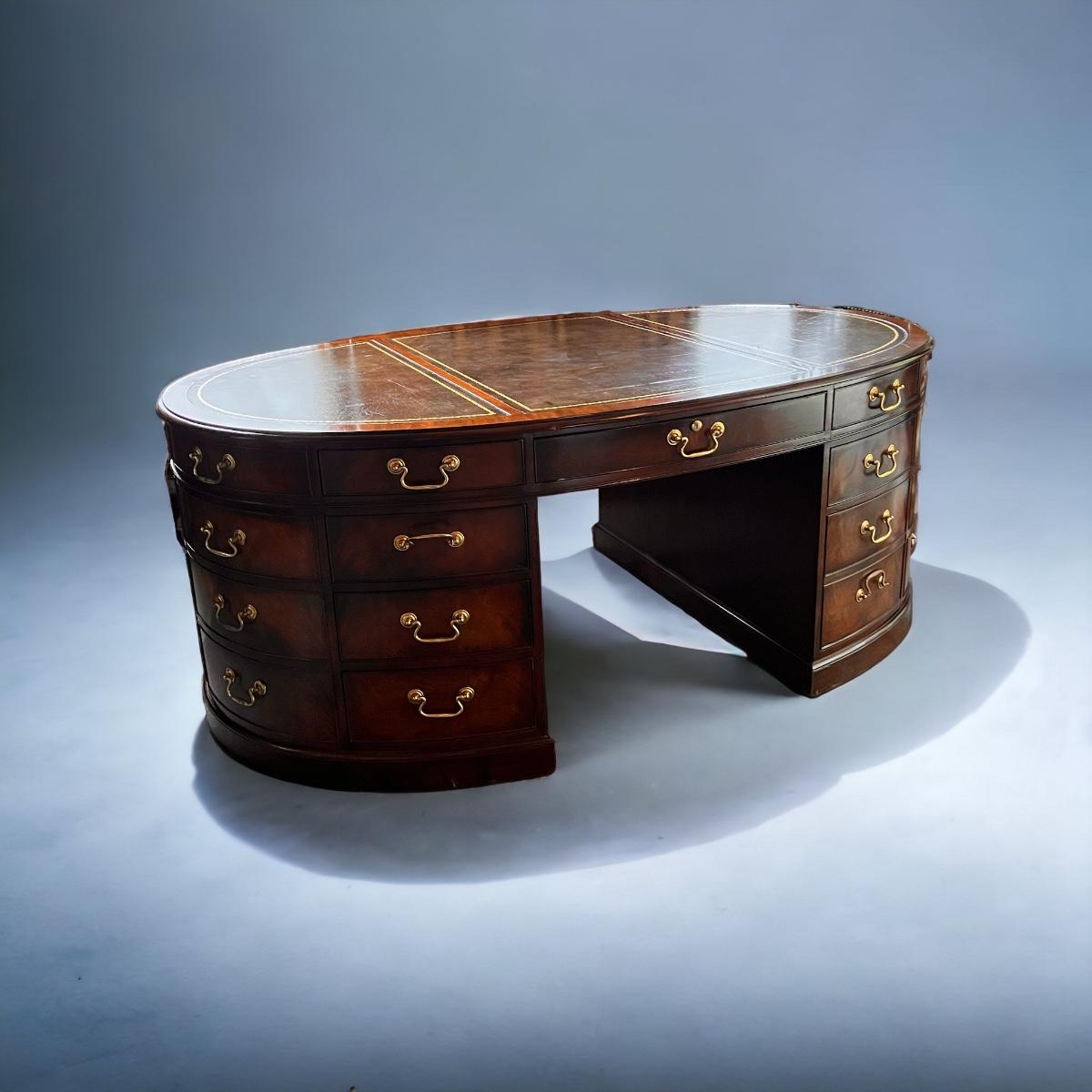 Each of the eight panels is executed in matched mahogany swirls. Solid brass hardware. Three piece inlaid leather top with hand tooled design in gold leaf. Left pedestal includes four drawers. Right pedestal includes 2 box drawers, 1 file drawer