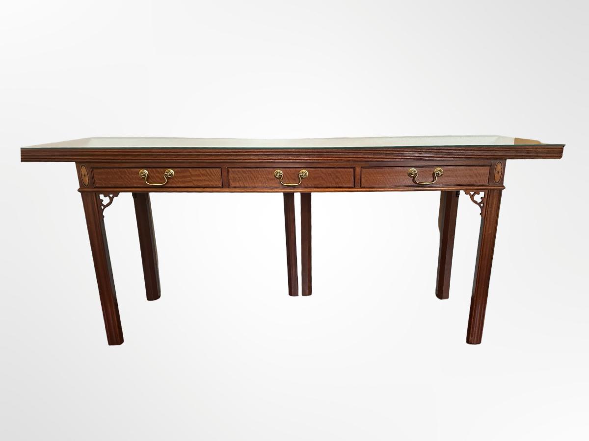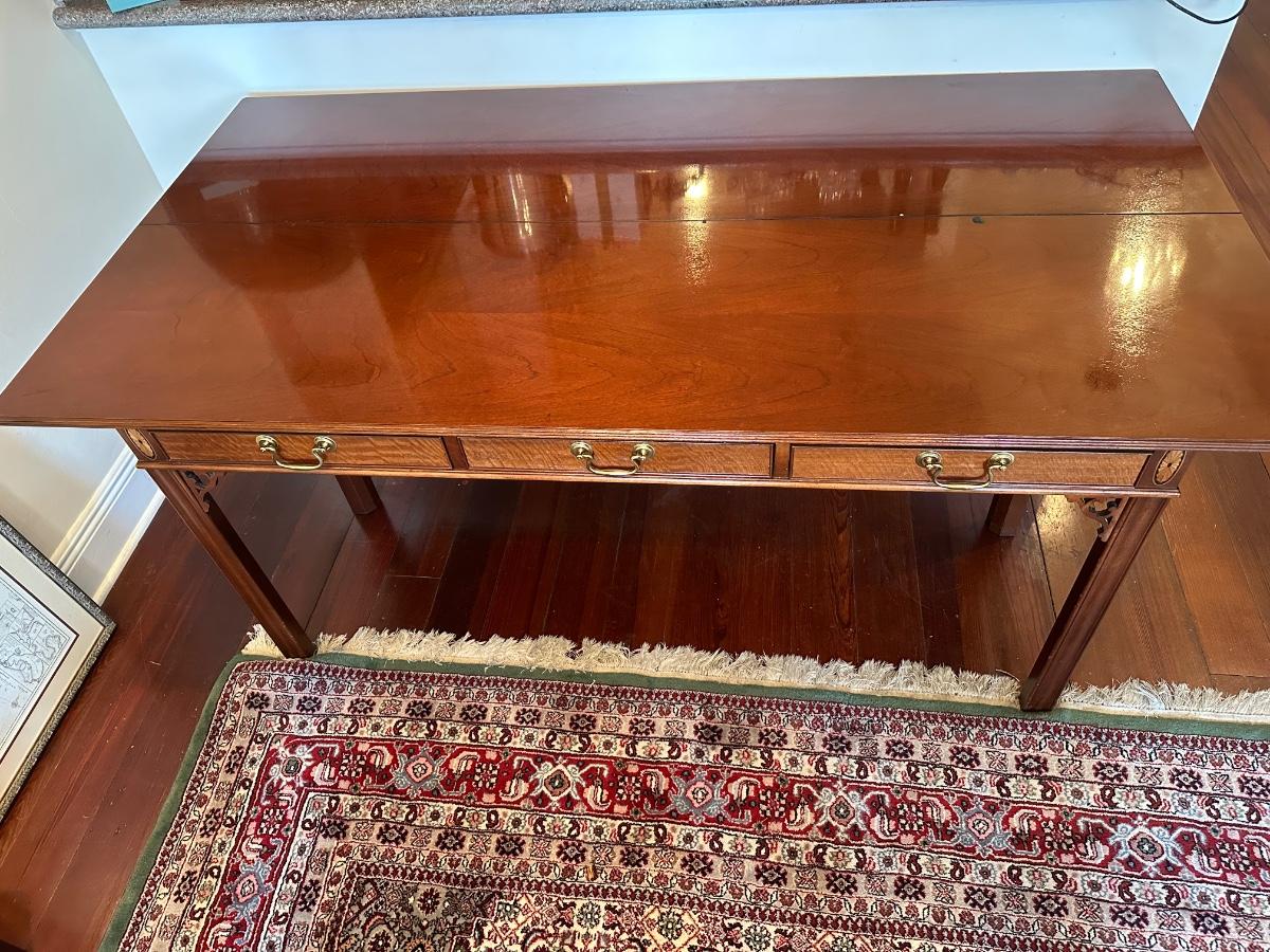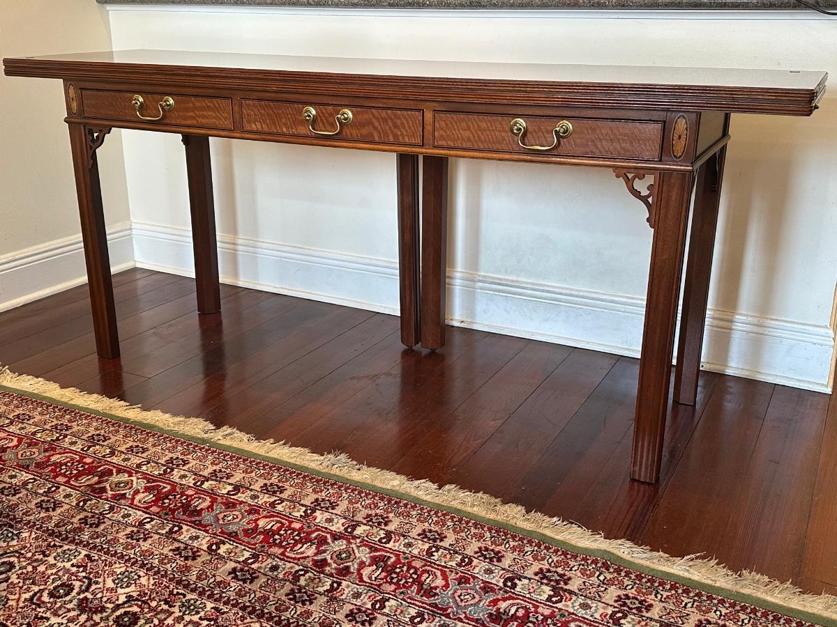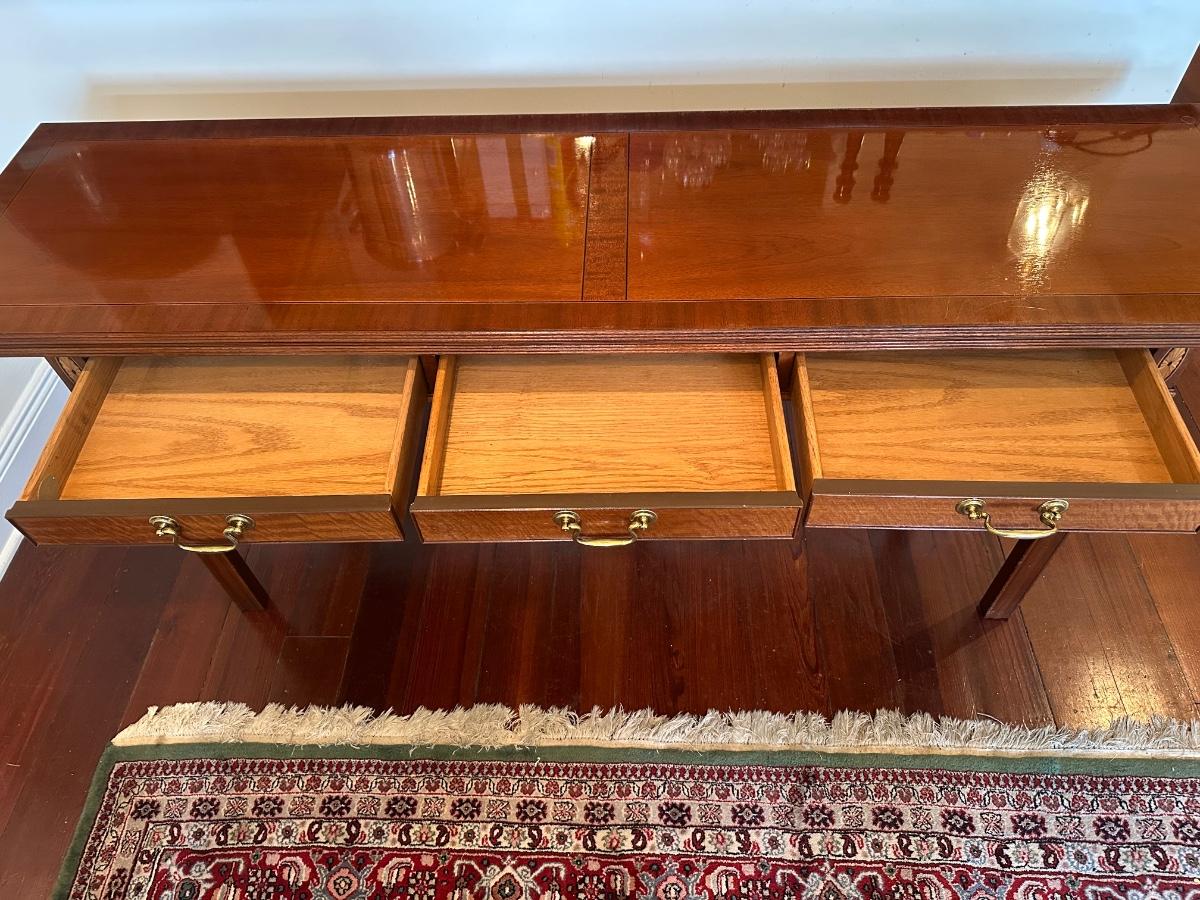 Classic Baker Furniture flip-top console table featuring a hinged top that opens to create a larger surface, suitable for use as a game table or additional serving space. The piece includes three functional drawers, each with brass bail pulls.