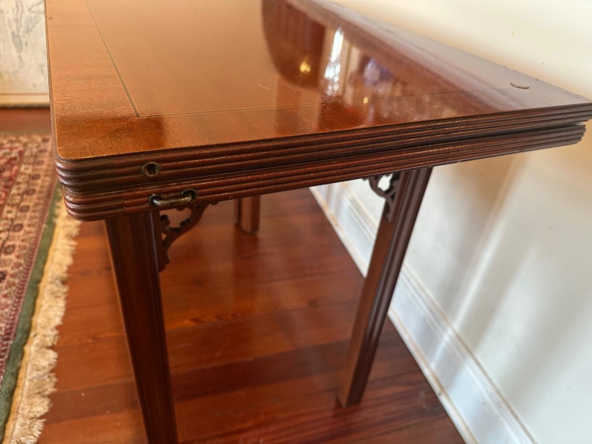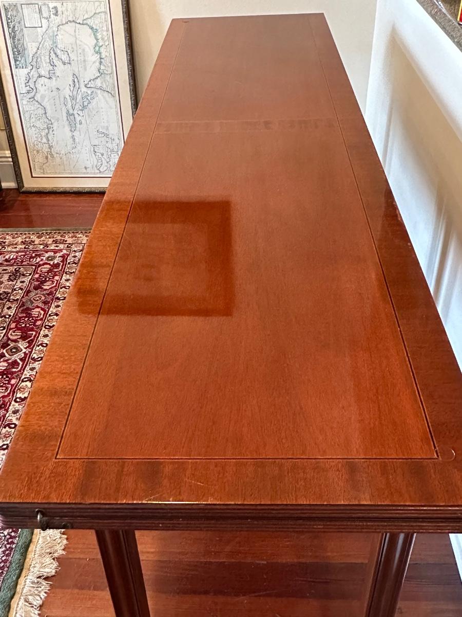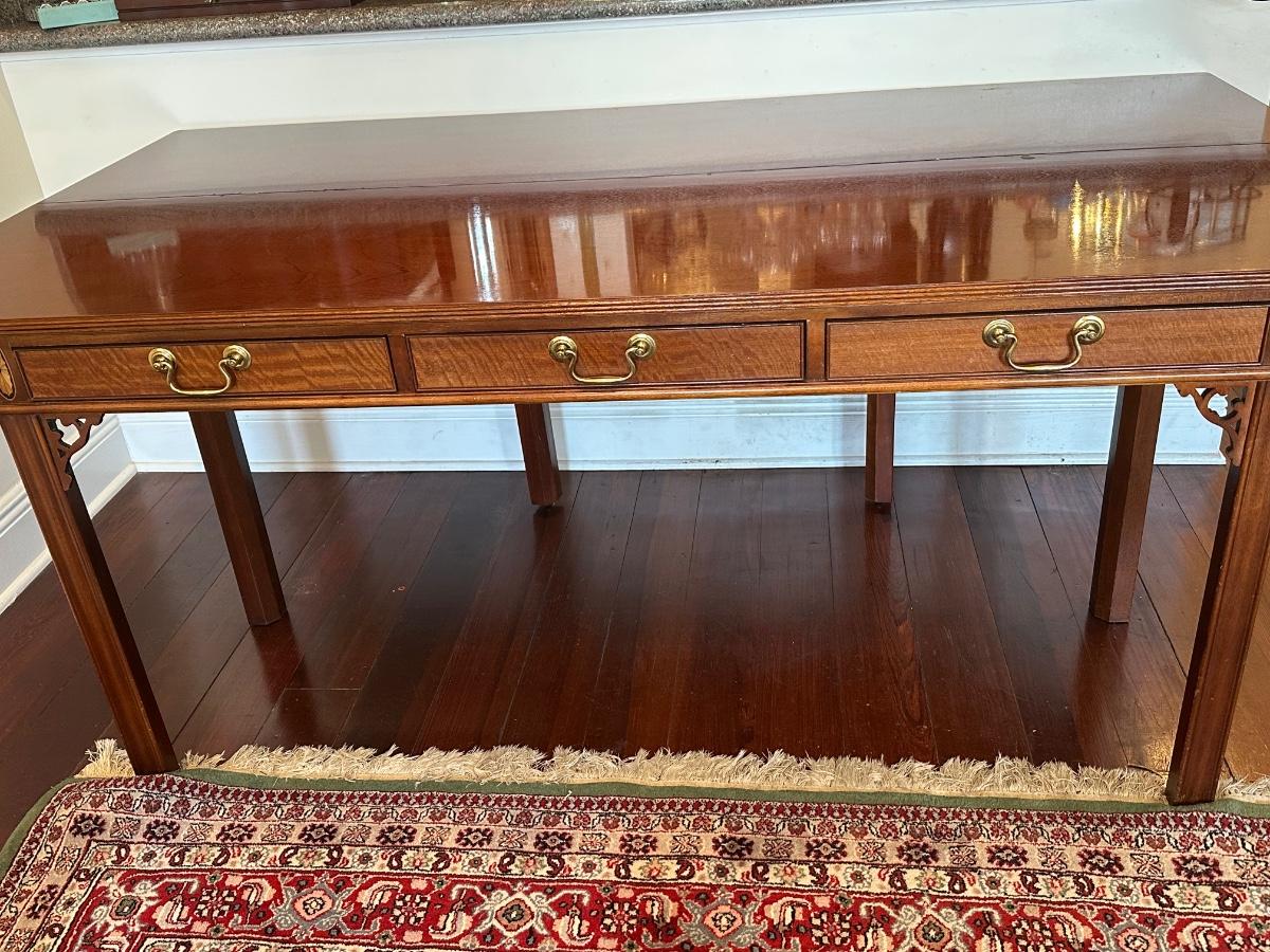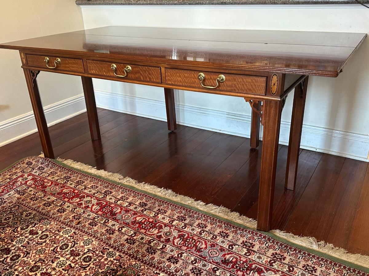 Classic Baker Furniture flip-top console table featuring a hinged top that opens to create a larger surface, suitable for use as a game table or additional serving space. The piece includes three functional drawers, each with brass bail pulls.