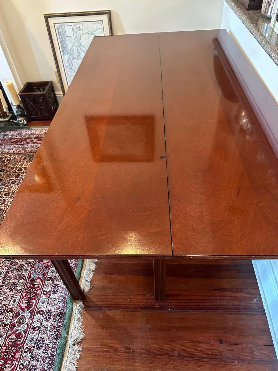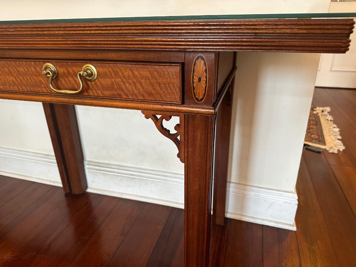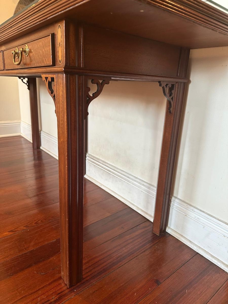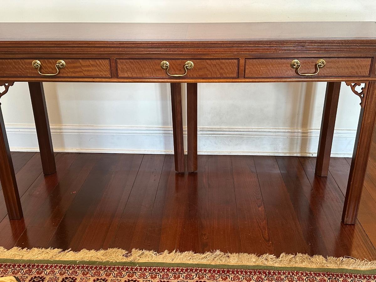 Classic Baker Furniture flip-top console table featuring a hinged top that opens to create a larger surface, suitable for use as a game table or additional serving space. The piece includes three functional drawers, each with brass bail pulls.