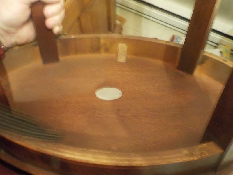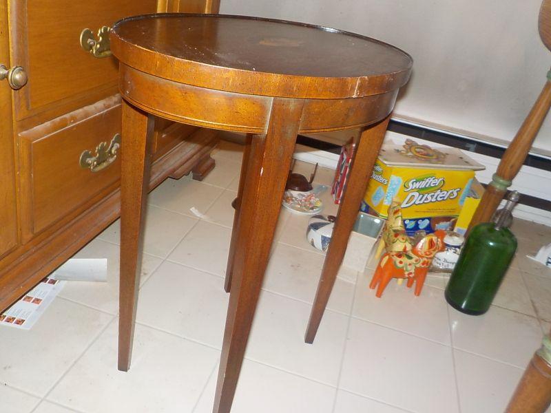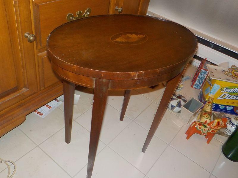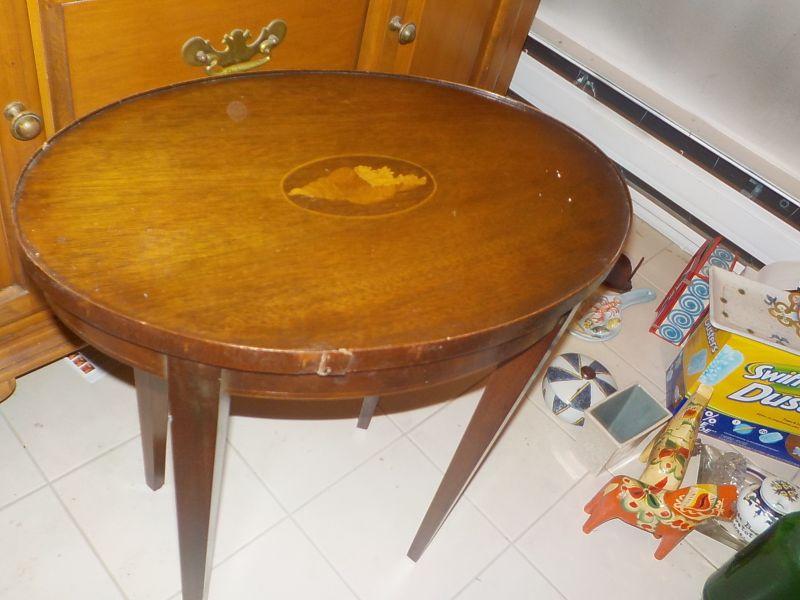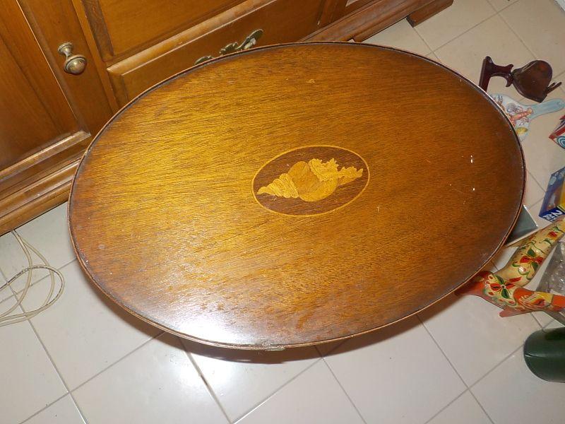22" wide on oval end and 24 " high. sturdy with inlay design.