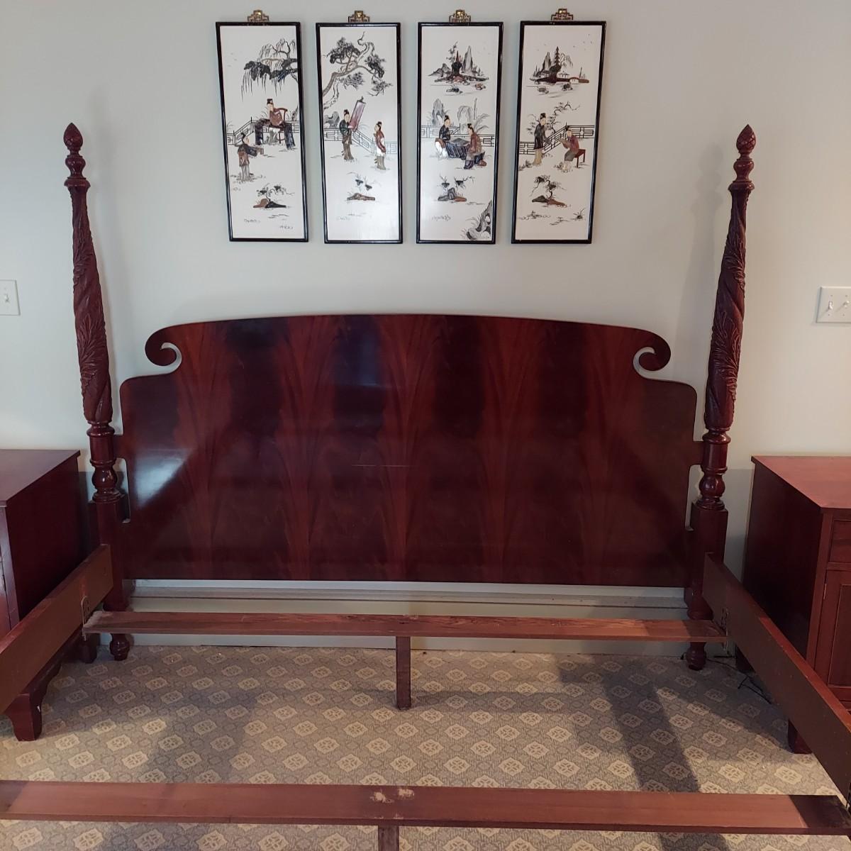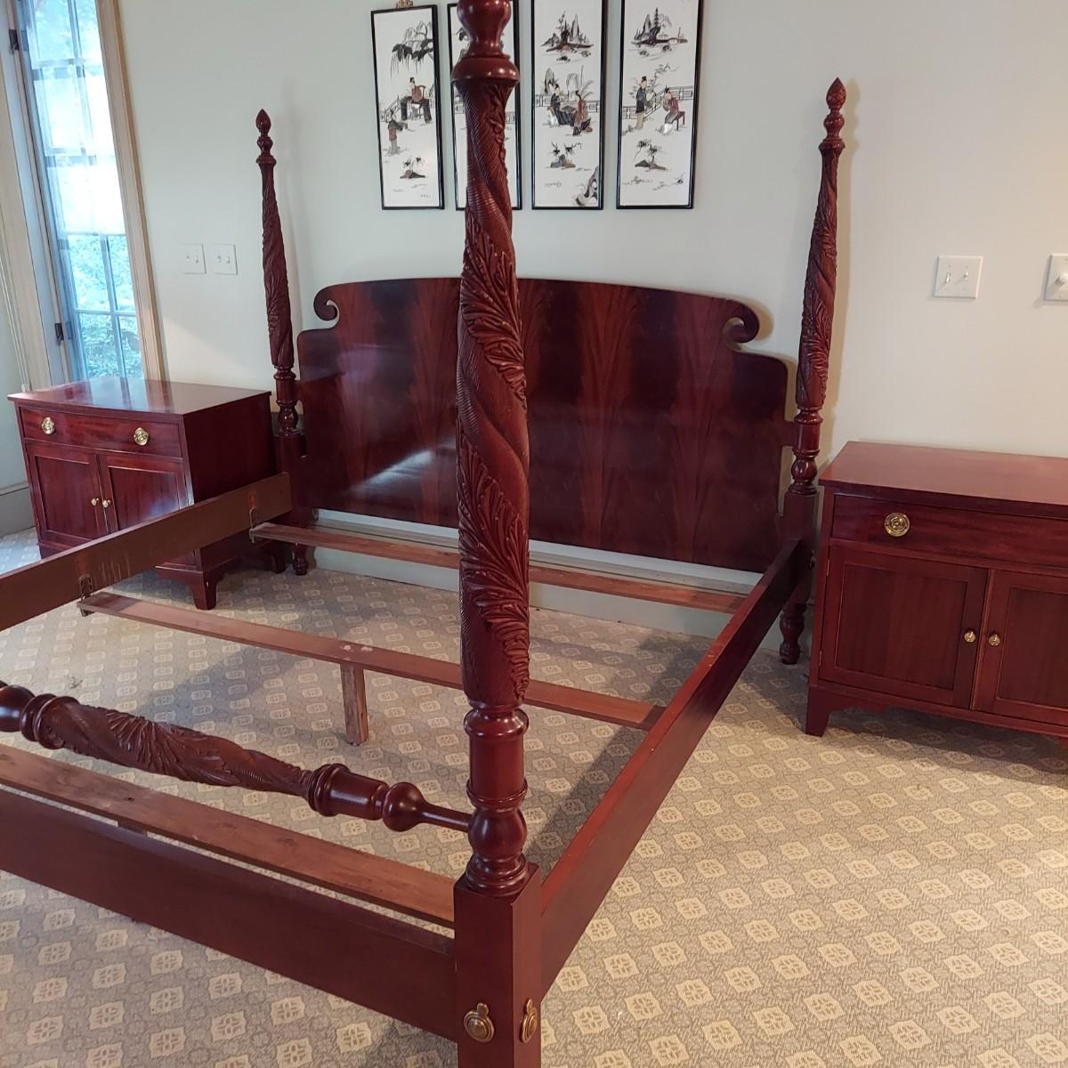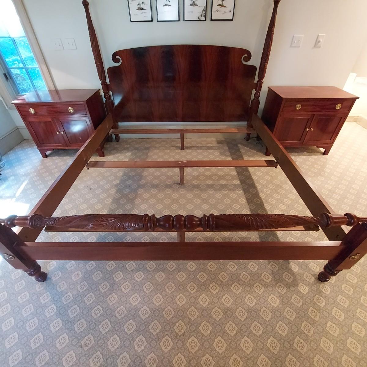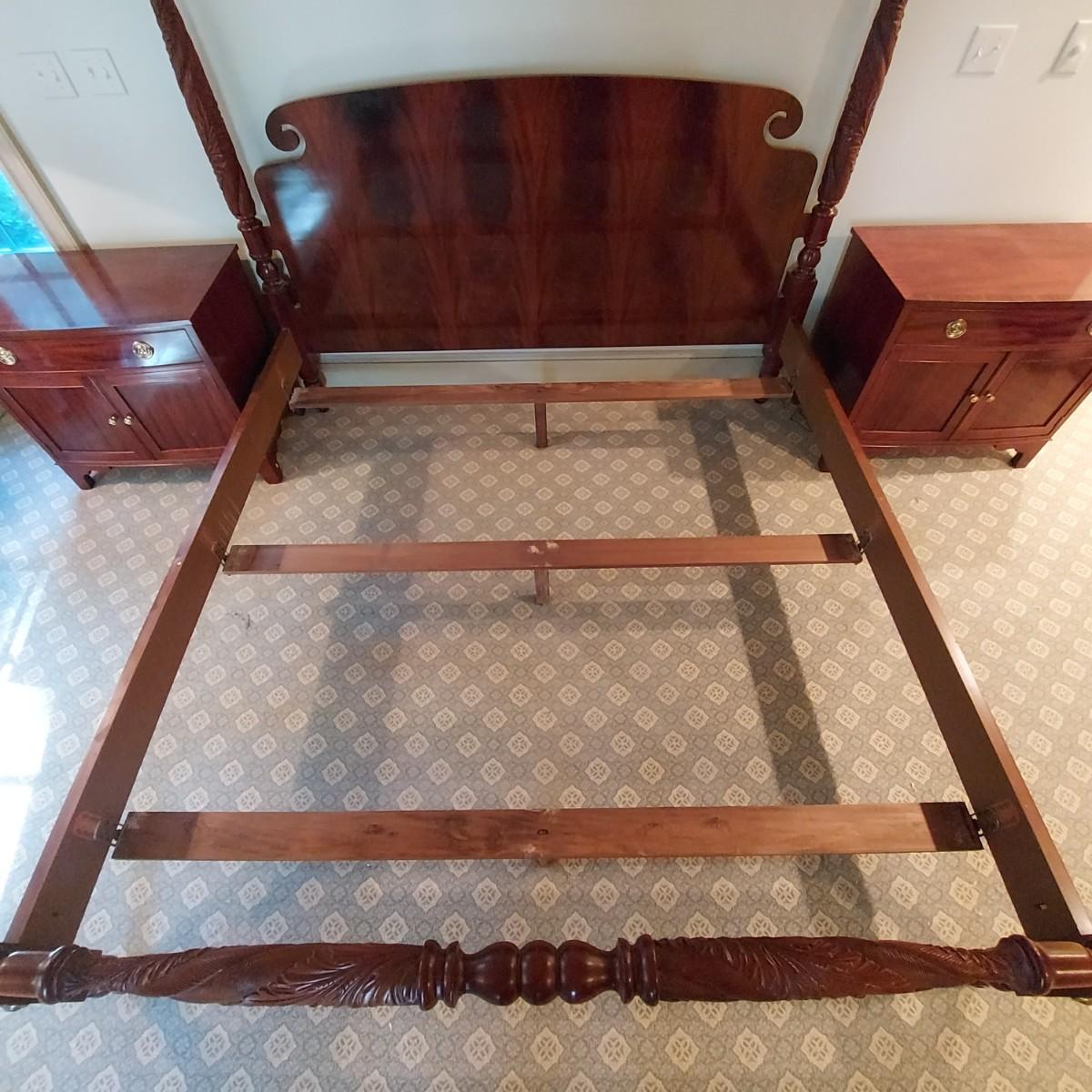 Two solid wood nightstands with brass hardware that measure 34" x 20" x 30"H. They have dovetailed drawers and Baker Furniture stamp. The solid wood king size bed frame measures 82" x 87" x 70"H. It has four carved corner posts. There is no mattress available. Local Pickup Only. Winning bidder must bring assistance to help move and load this item due to its weight and/or size. Please see photos for hardware. Bed will need to be taken down by the buyer on the day of pickup.