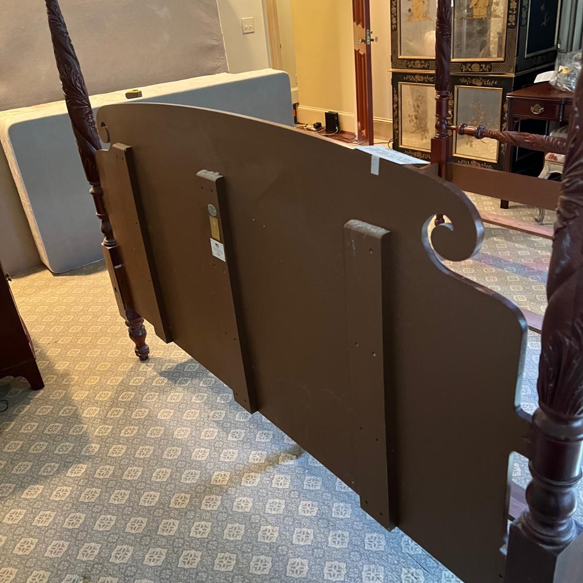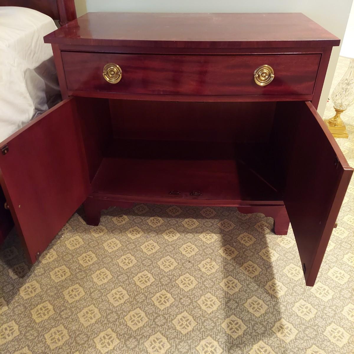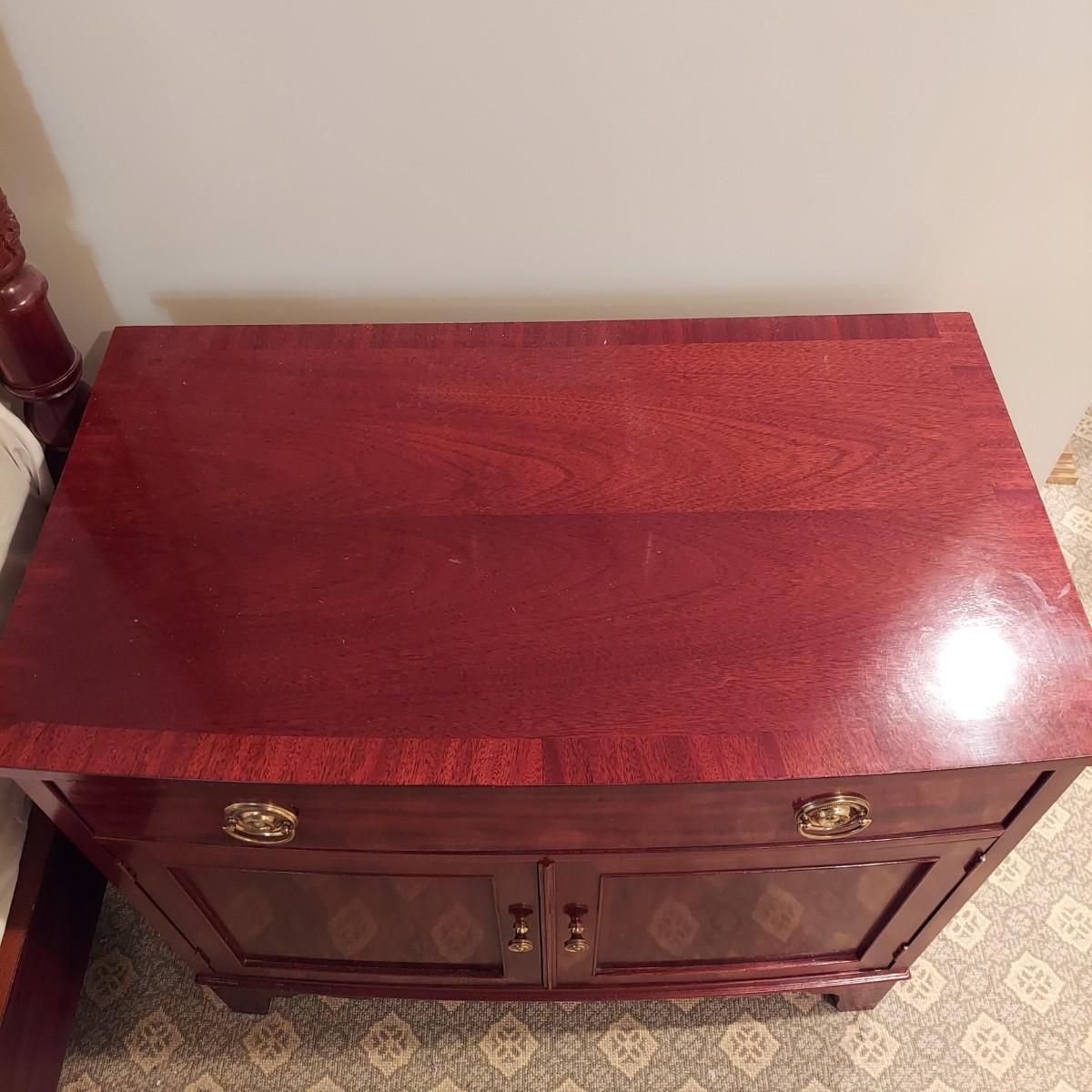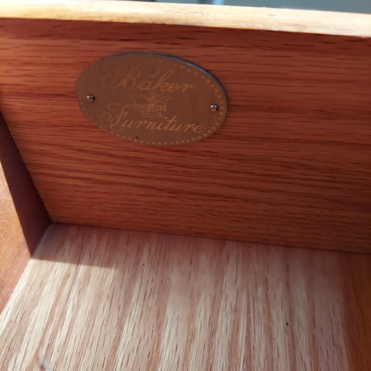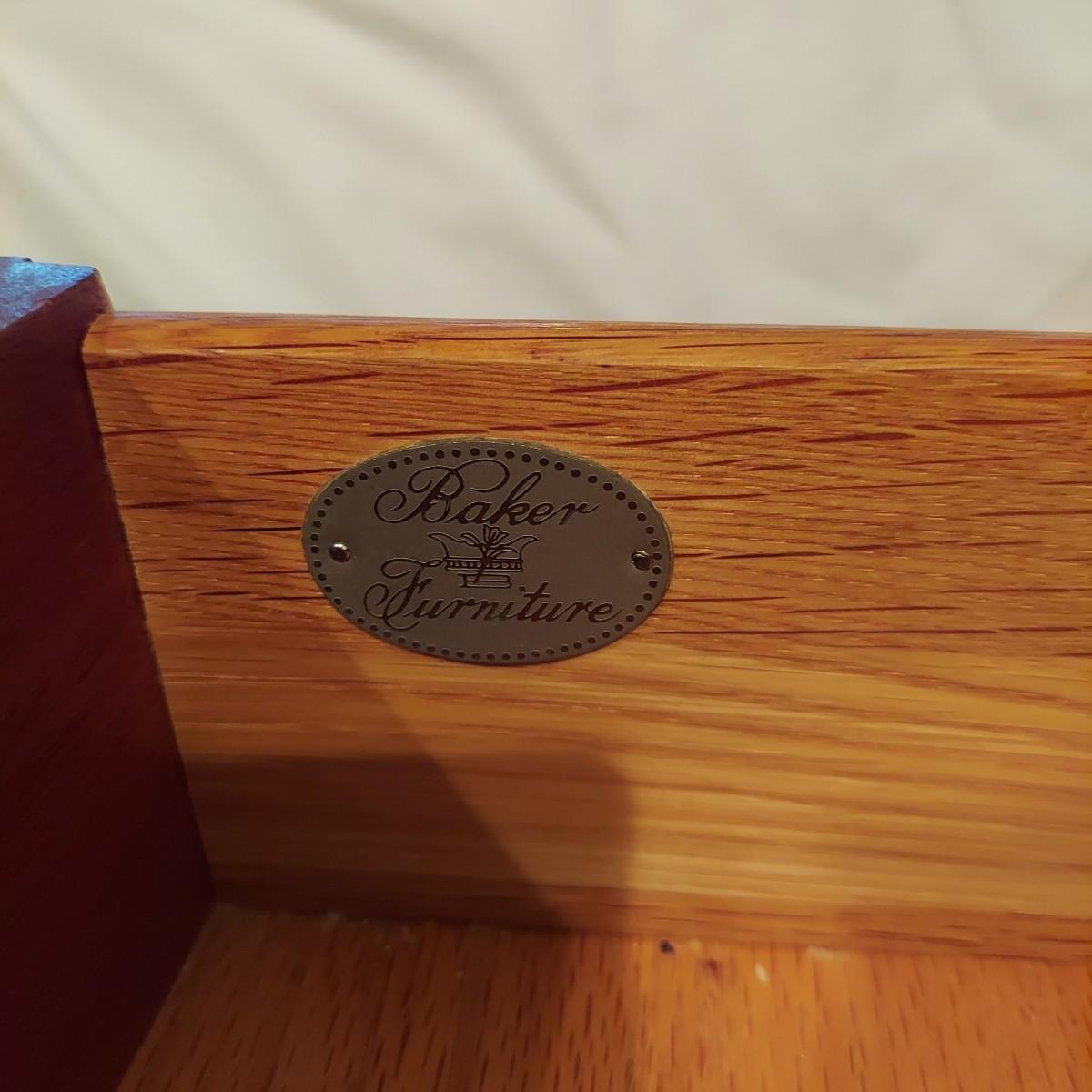 Two solid wood nightstands with brass hardware that measure 34" x 20" x 30"H. They have dovetailed drawers and Baker Furniture stamp. The solid wood king size bed frame measures 82" x 87" x 70"H. It has four carved corner posts. There is no mattress available. Local Pickup Only. Winning bidder must bring assistance to help move and load this item due to its weight and/or size. Please see photos for hardware. Bed will need to be taken down by the buyer on the day of pickup.