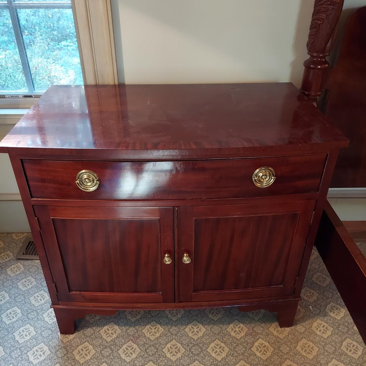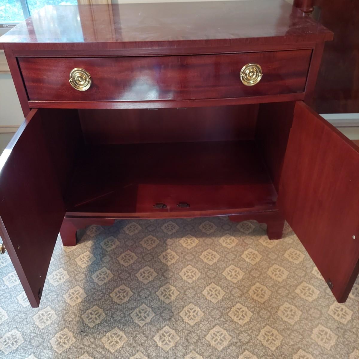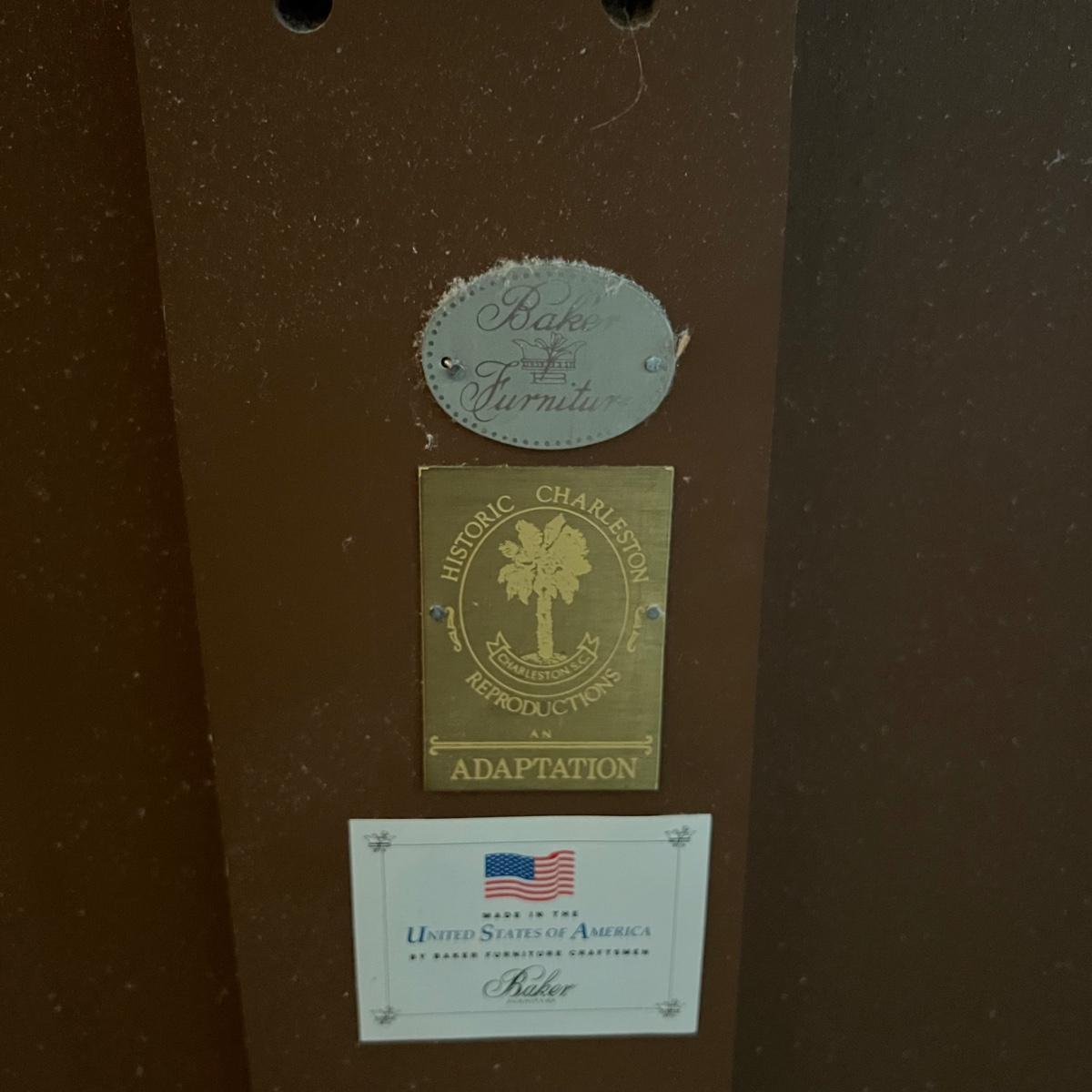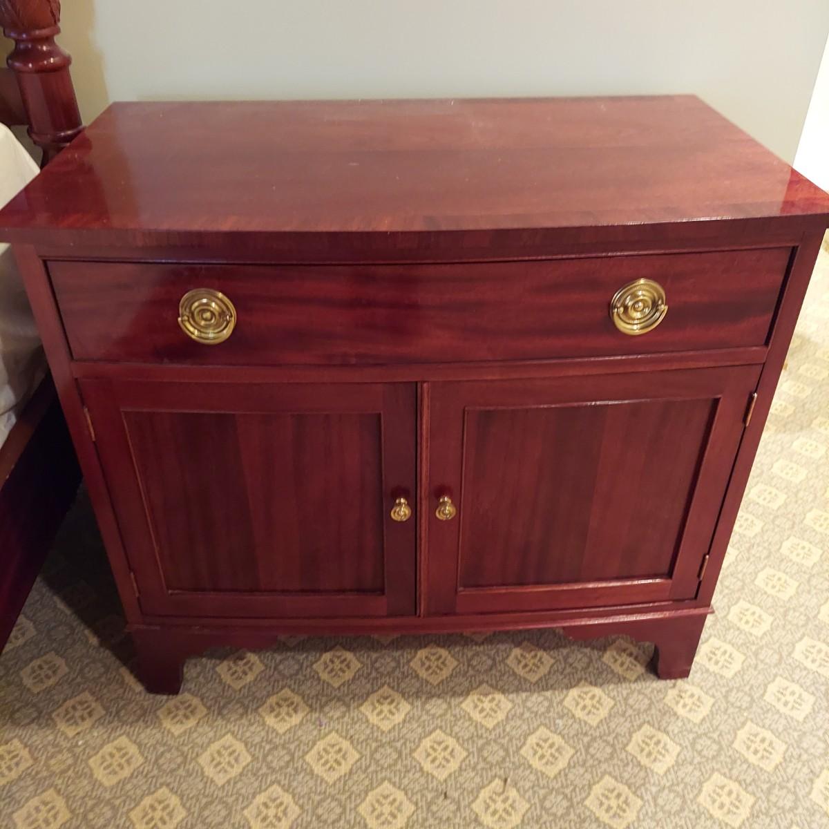 Two solid wood nightstands with brass hardware that measure 34" x 20" x 30"H. They have dovetailed drawers and Baker Furniture stamp. The solid wood king size bed frame measures 82" x 87" x 70"H. It has four carved corner posts. There is no mattress available. Local Pickup Only. Winning bidder must bring assistance to help move and load this item due to its weight and/or size. Please see photos for hardware. Bed will need to be taken down by the buyer on the day of pickup.