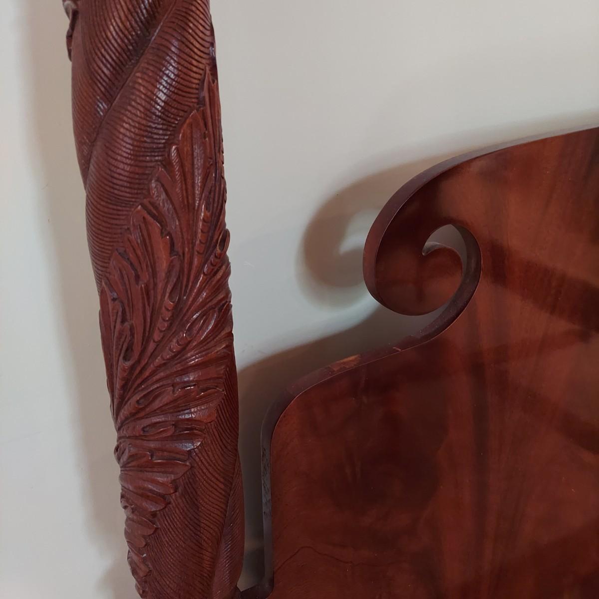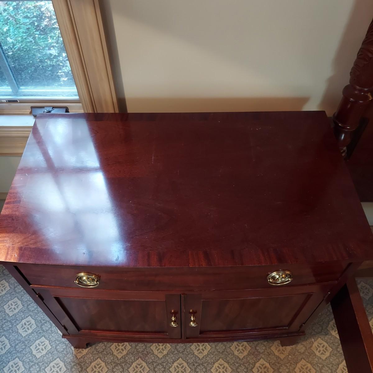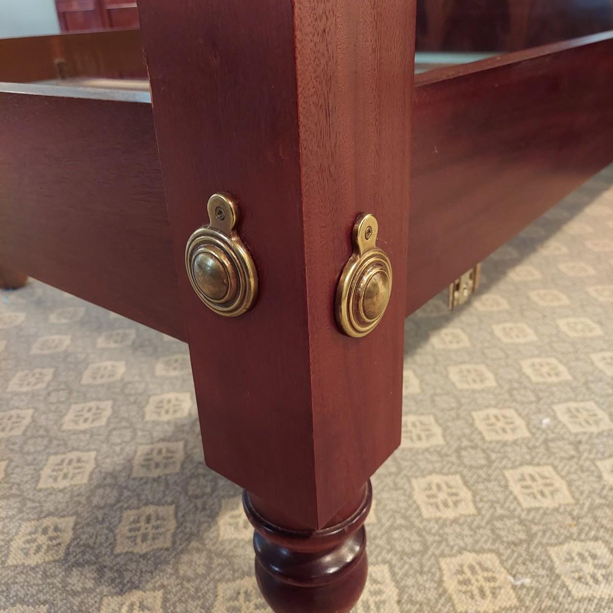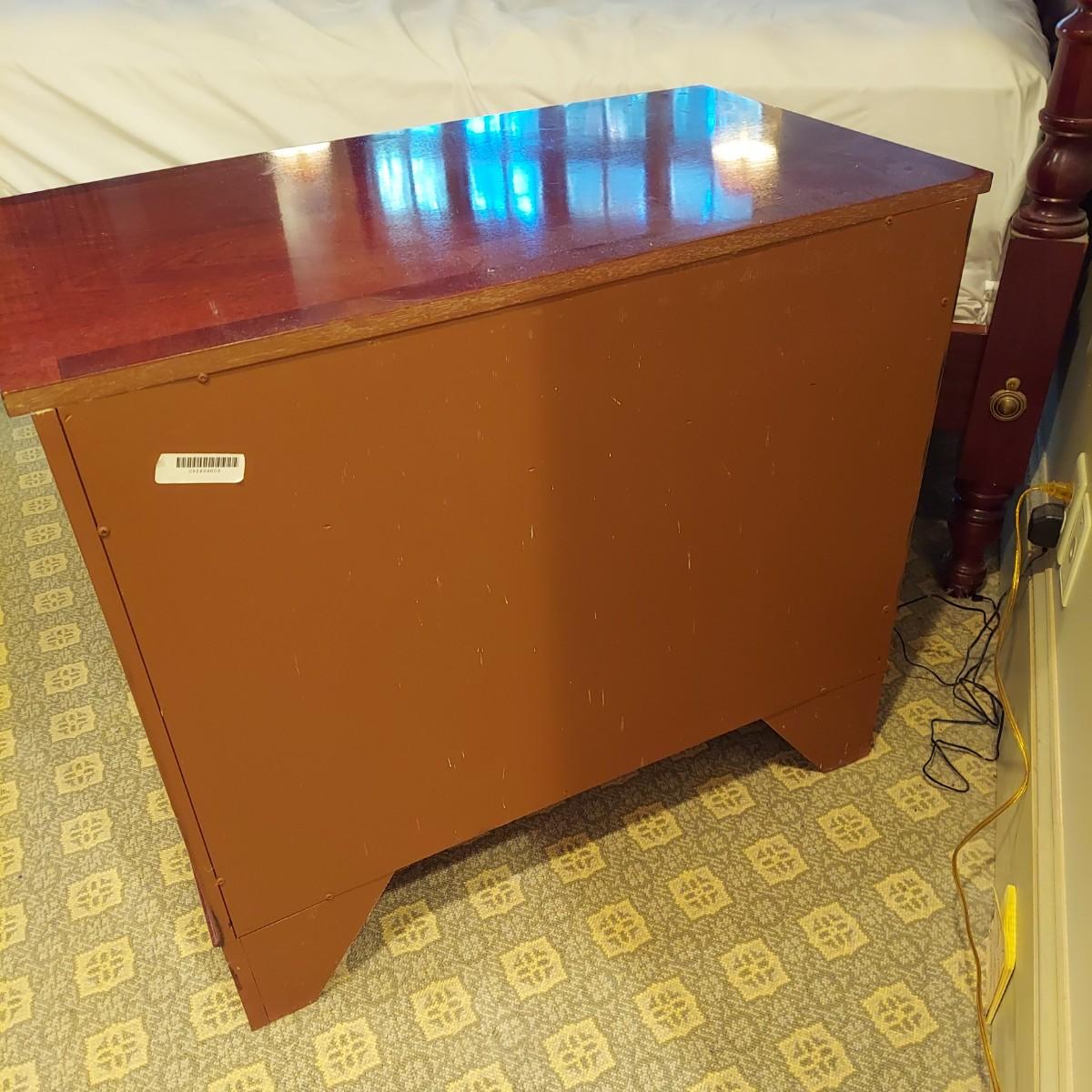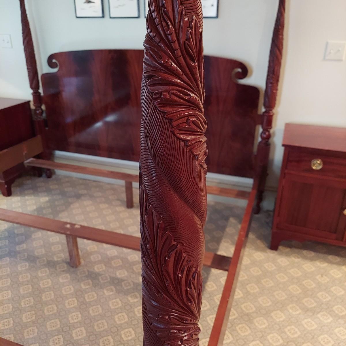 Two solid wood nightstands with brass hardware that measure 34" x 20" x 30"H. They have dovetailed drawers and Baker Furniture stamp. The solid wood king size bed frame measures 82" x 87" x 70"H. It has four carved corner posts. There is no mattress available. Local Pickup Only. Winning bidder must bring assistance to help move and load this item due to its weight and/or size. Please see photos for hardware. Bed will need to be taken down by the buyer on the day of pickup.