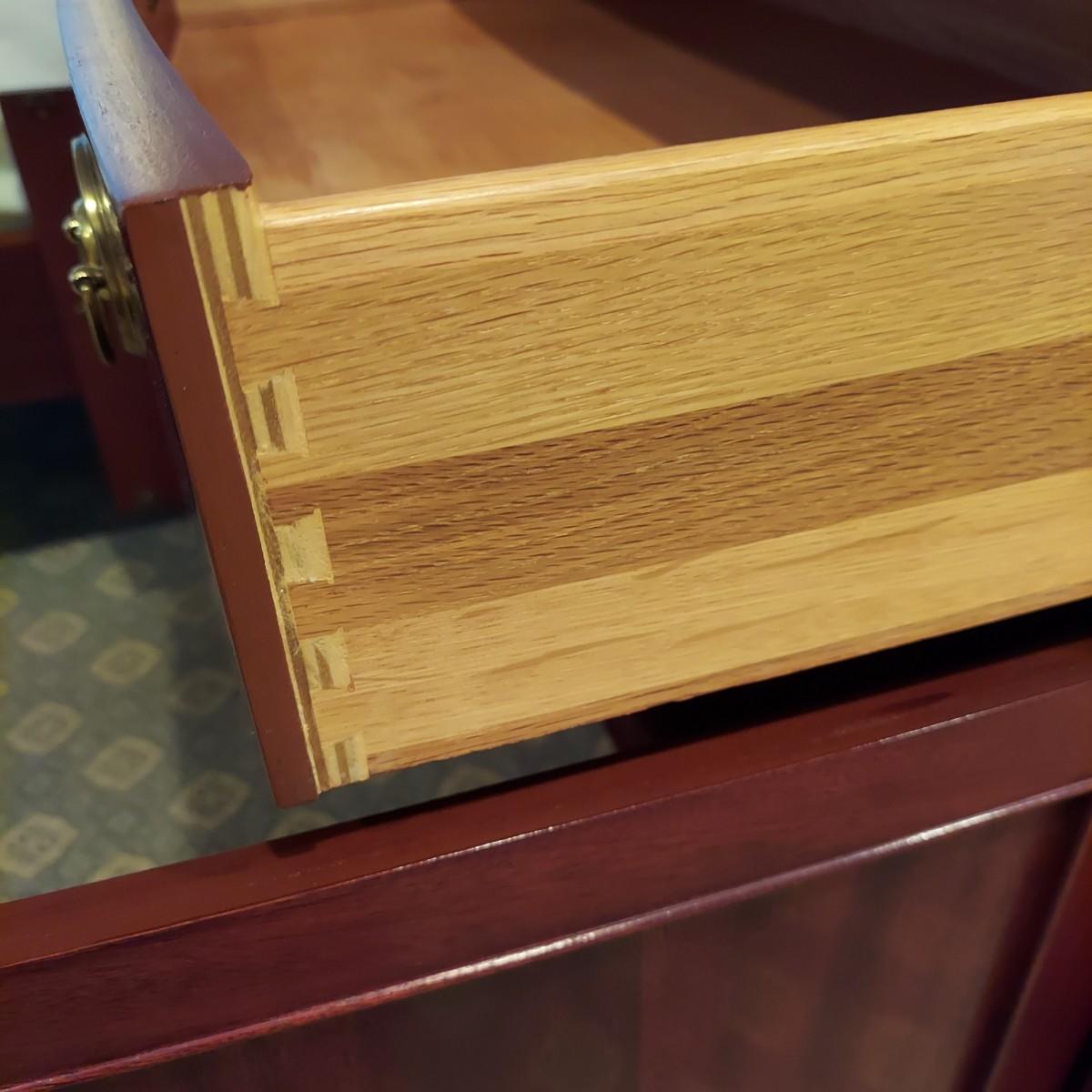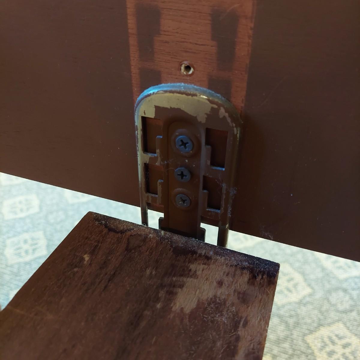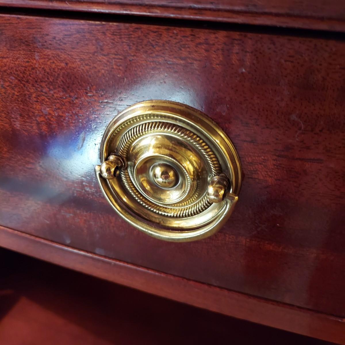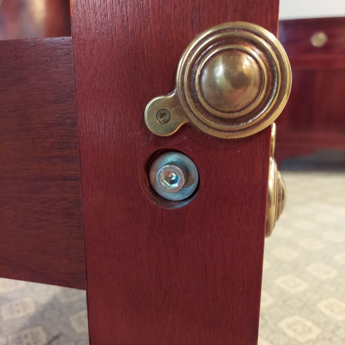 Two solid wood nightstands with brass hardware that measure 34" x 20" x 30"H. They have dovetailed drawers and Baker Furniture stamp. The solid wood king size bed frame measures 82" x 87" x 70"H. It has four carved corner posts. There is no mattress available. Local Pickup Only. Winning bidder must bring assistance to help move and load this item due to its weight and/or size. Please see photos for hardware. Bed will need to be taken down by the buyer on the day of pickup.
