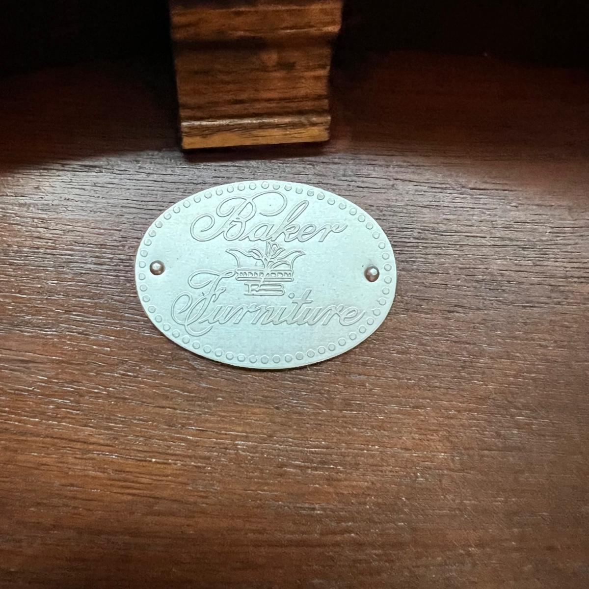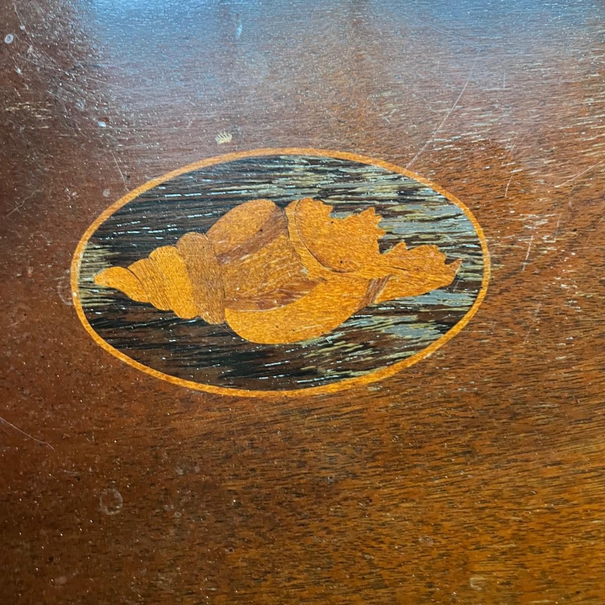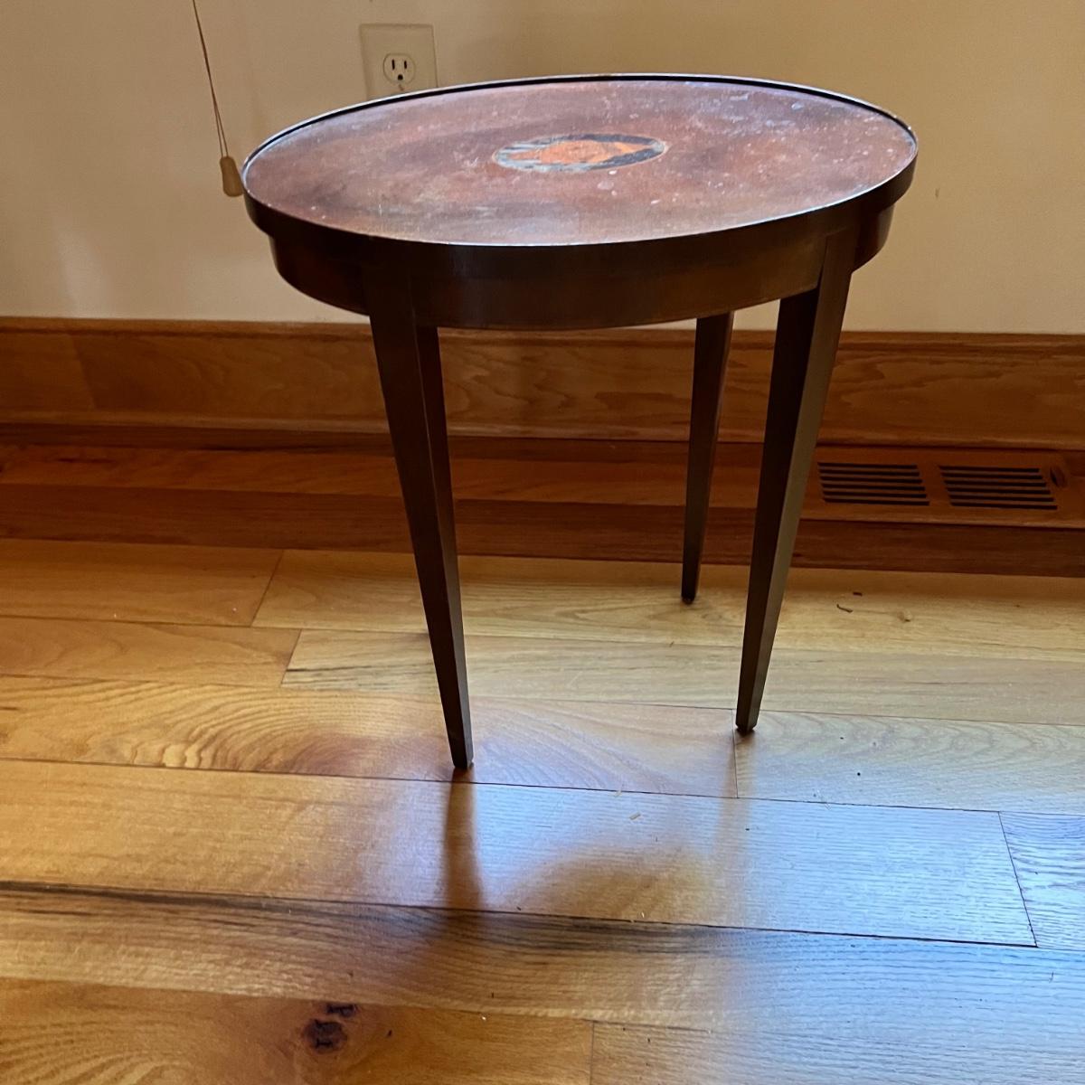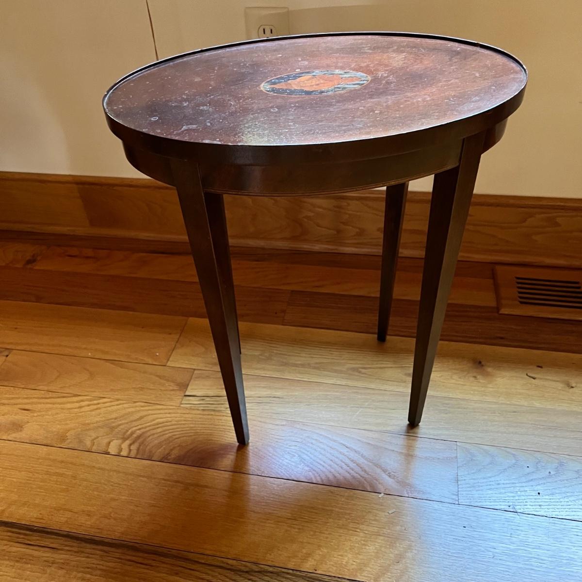 An oval side table by Baker Furniture with an inlaid shell on the surface. The wooden table measures approximately 18.” x 12” x21”H.