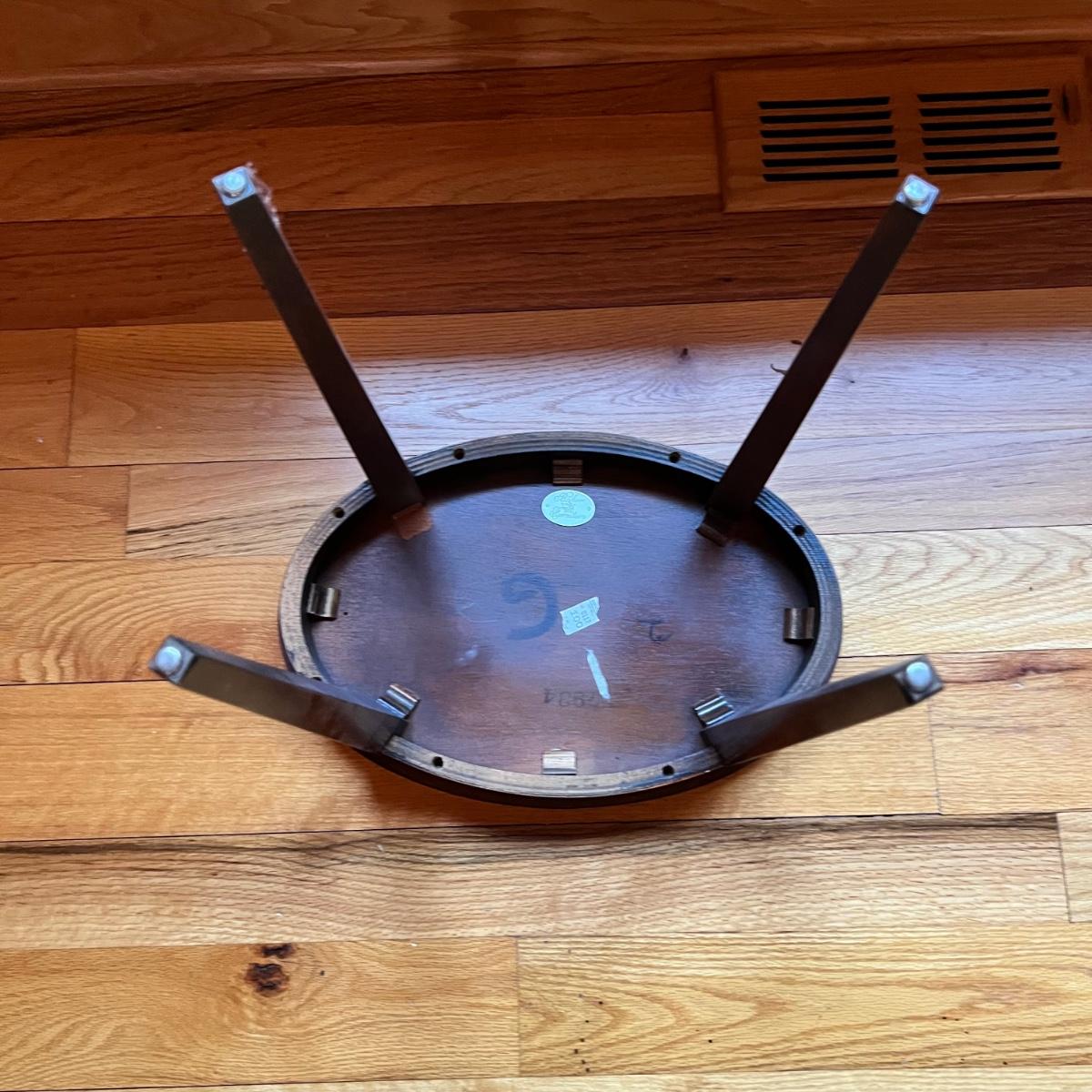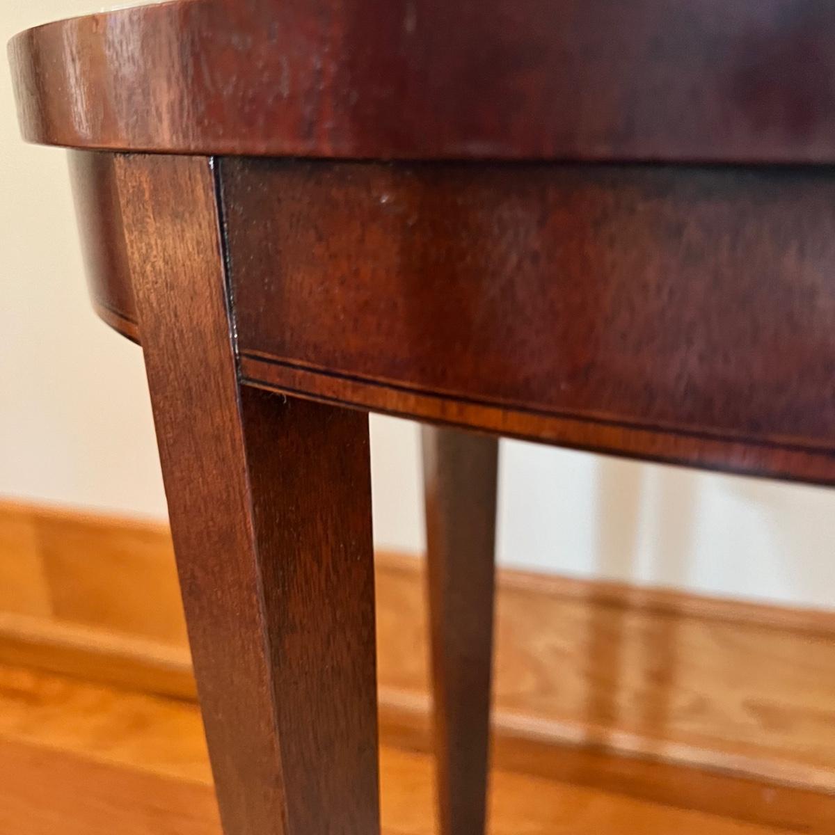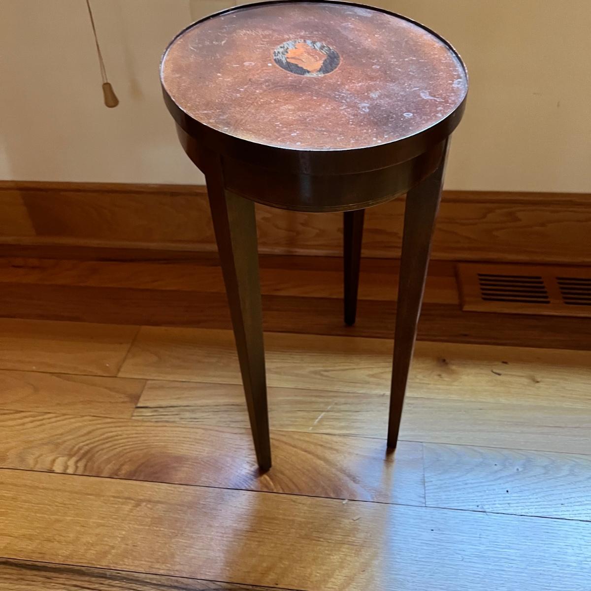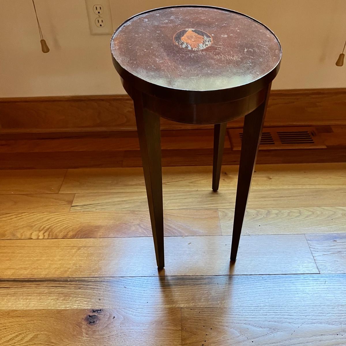 An oval side table by Baker Furniture with an inlaid shell on the surface. The wooden table measures approximately 18.” x 12” x21”H.