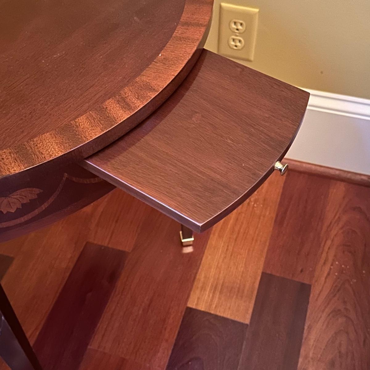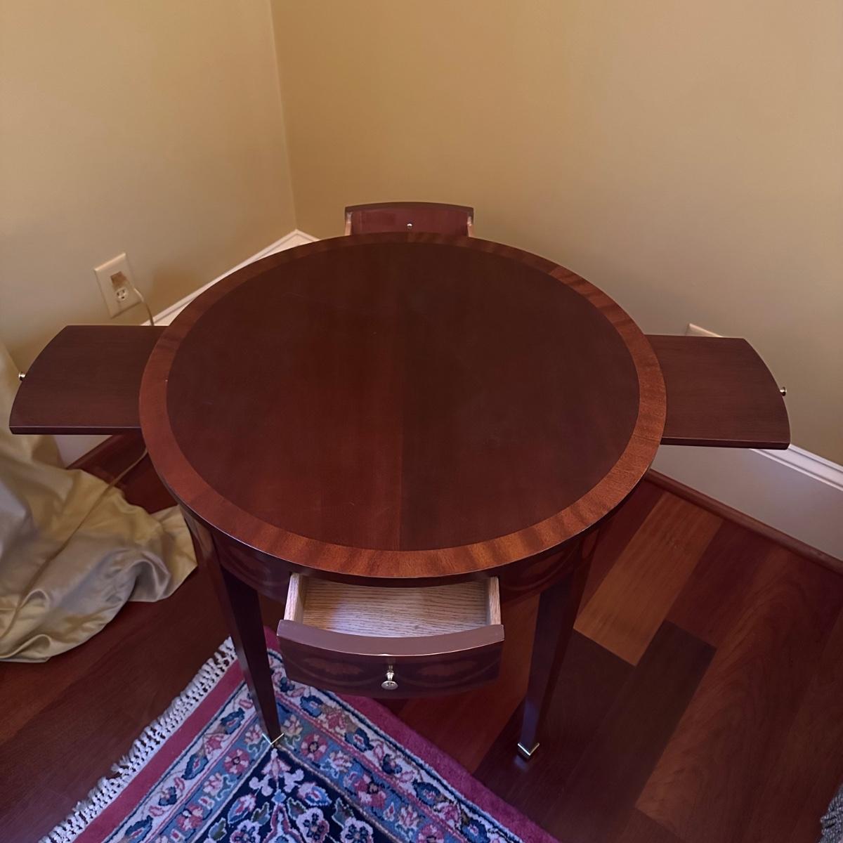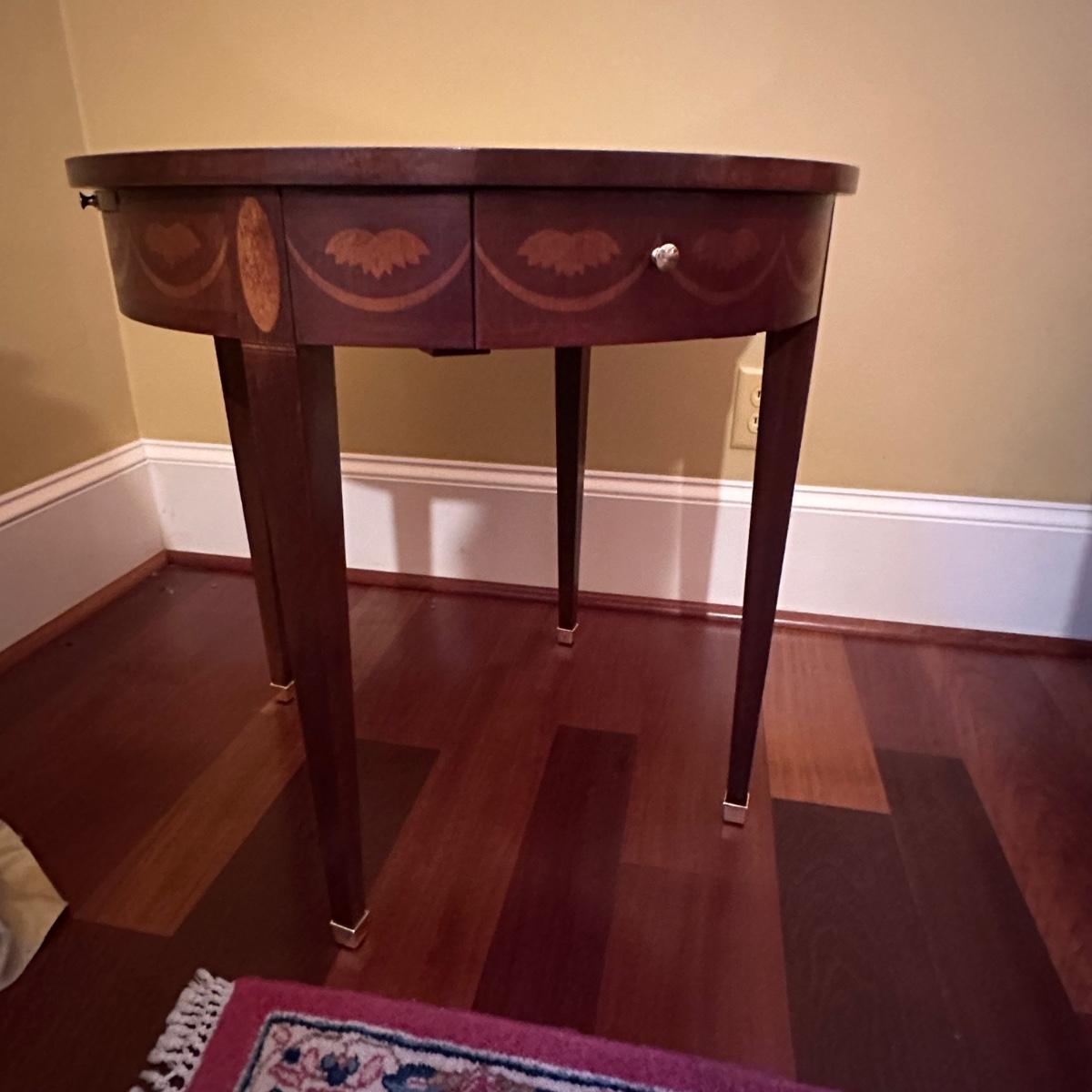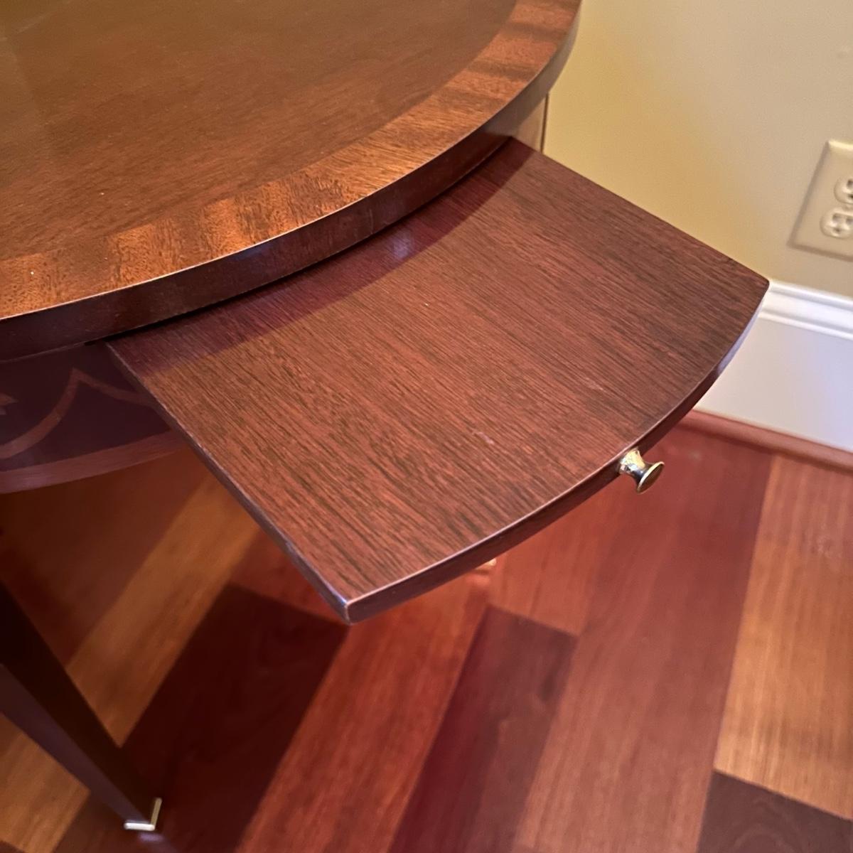 Baker round solid wood inlaid side table with two drawers and two pull out side shelves. Feet have brass caps. Measures 25.5”D x 25”H. Local pickup only.