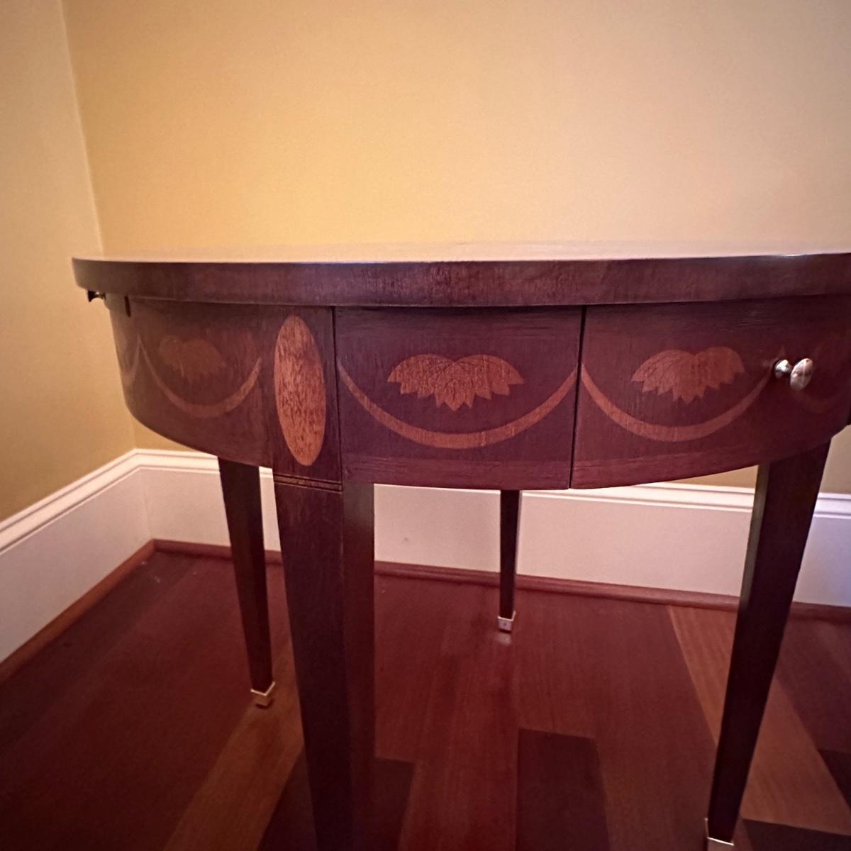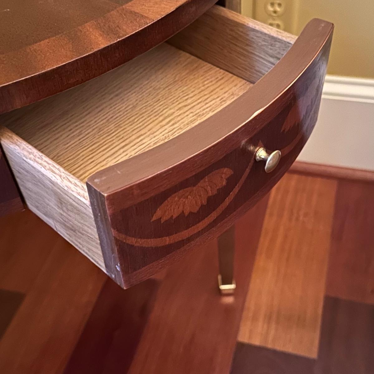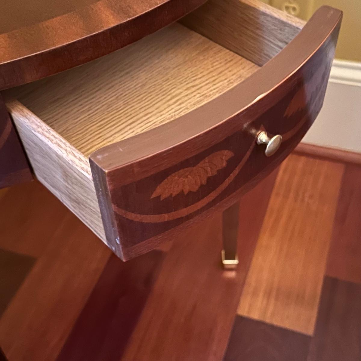 Baker round solid wood inlaid side table with two drawers and two pull out side shelves. Feet have brass caps. Measures 25.5”D x 25”H. Local pickup only.