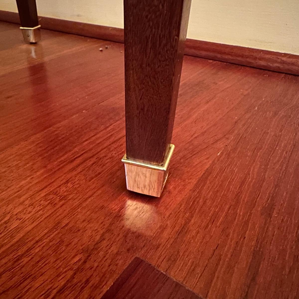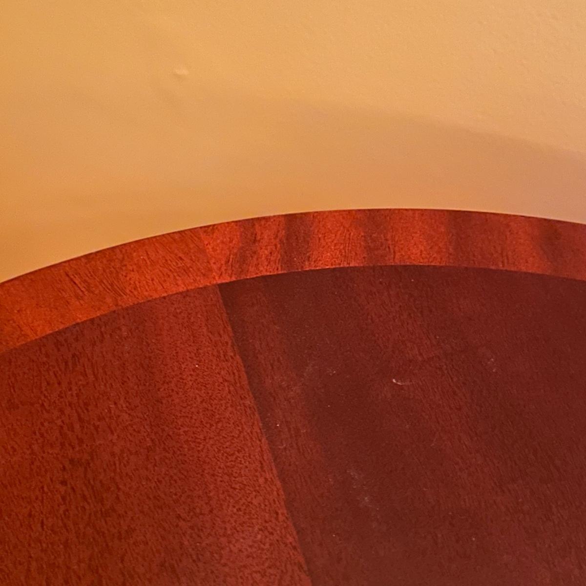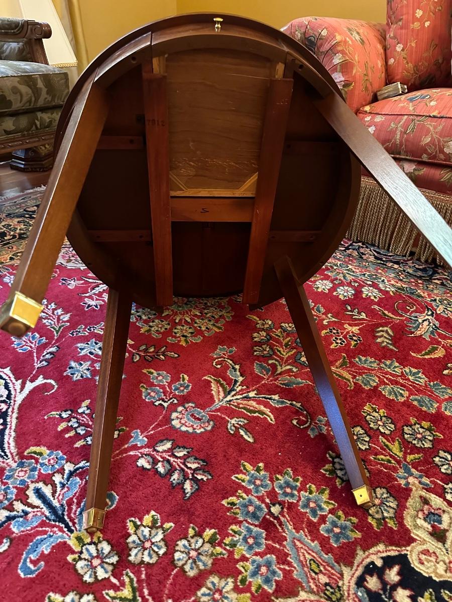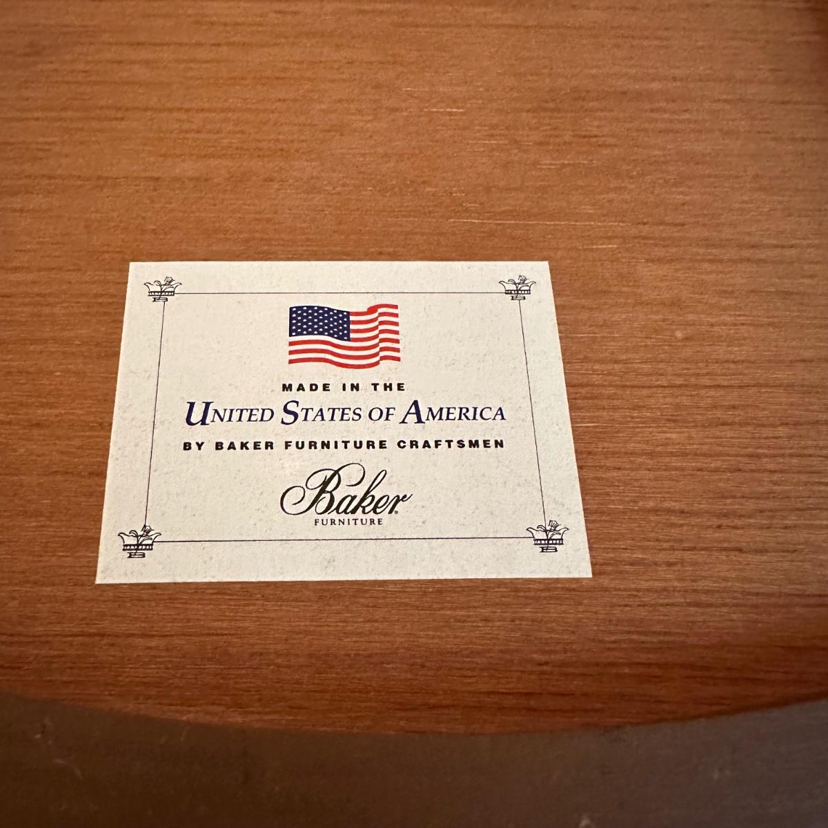 Baker round solid wood inlaid side table with two drawers and two pull out side shelves. Feet have brass caps. Measures 25.5”D x 25”H. Local pickup only.