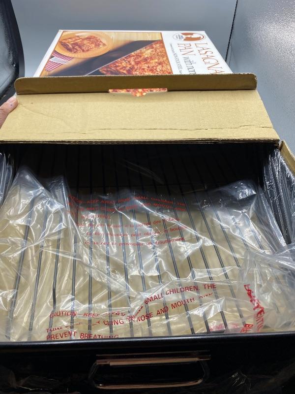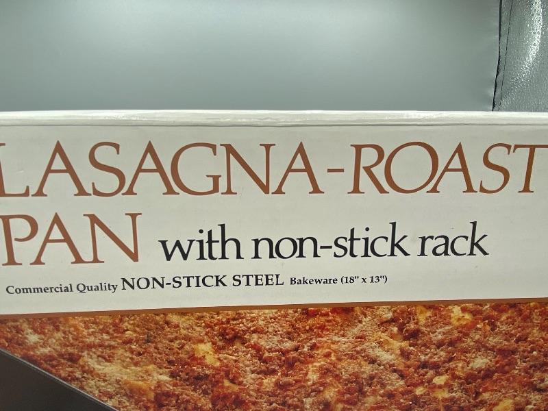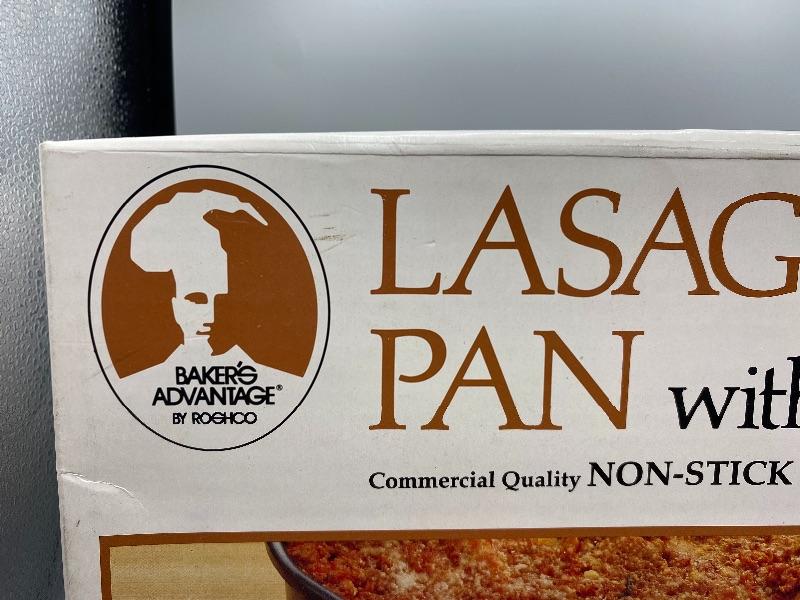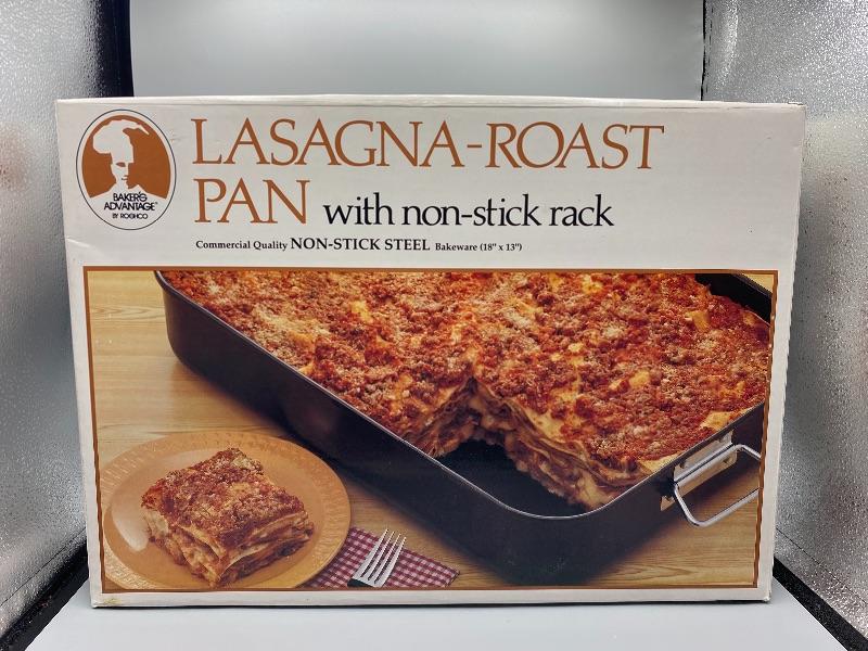 Baker's Advantage Lasagna Roast Pan by Roshco. New in box, still in plastic. Comes with a non-stick rack. Measures 18"x13".