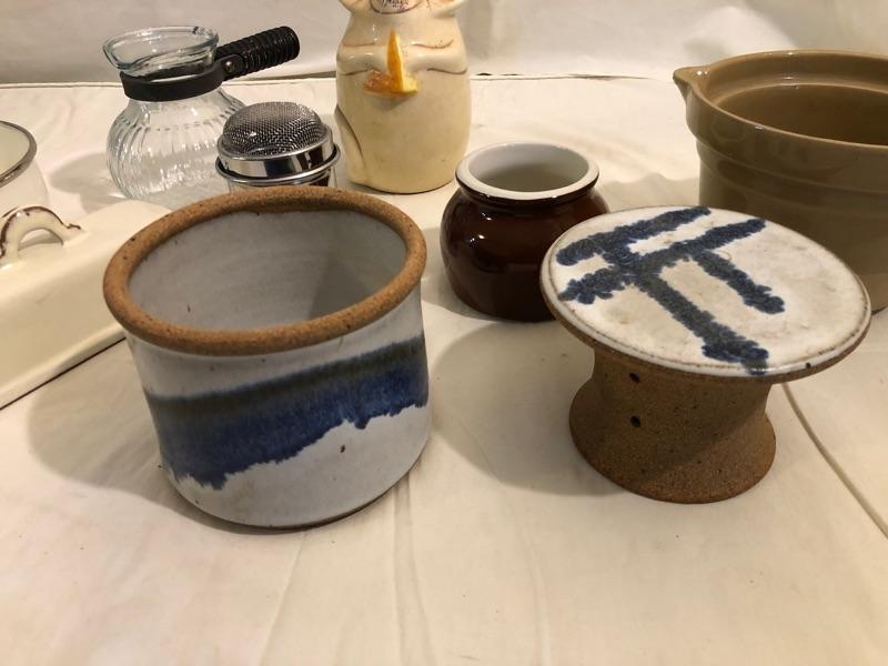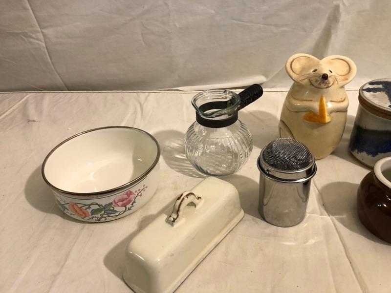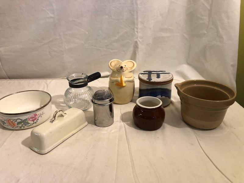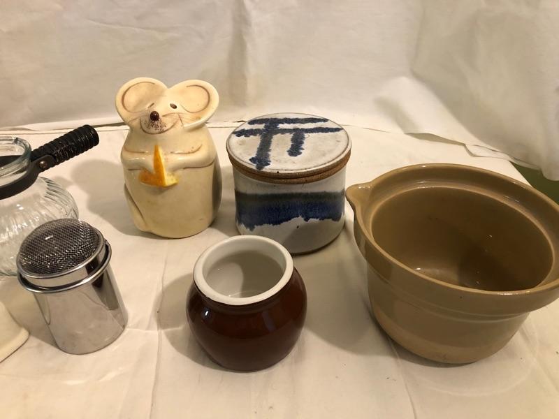 collection of butter safe, butter lid, mixing croc, mouse sugar shaker, butter melter or heating syrup