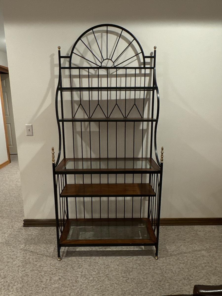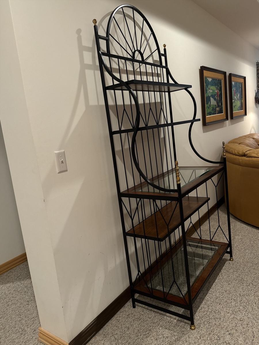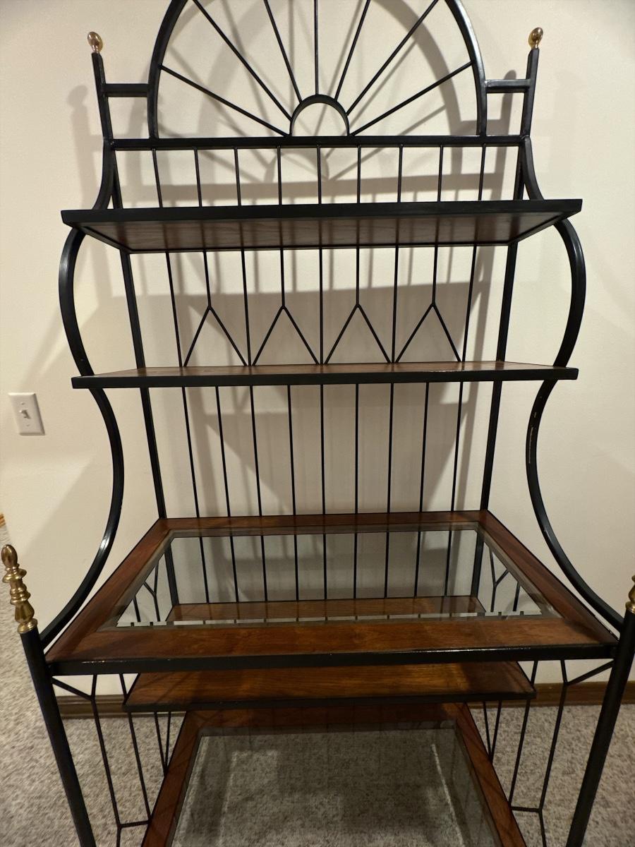 Bakers rack with metal, wood and glass