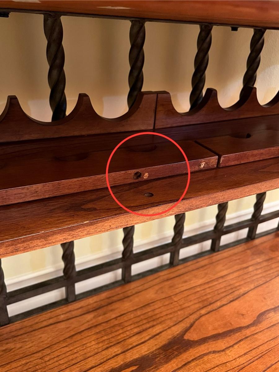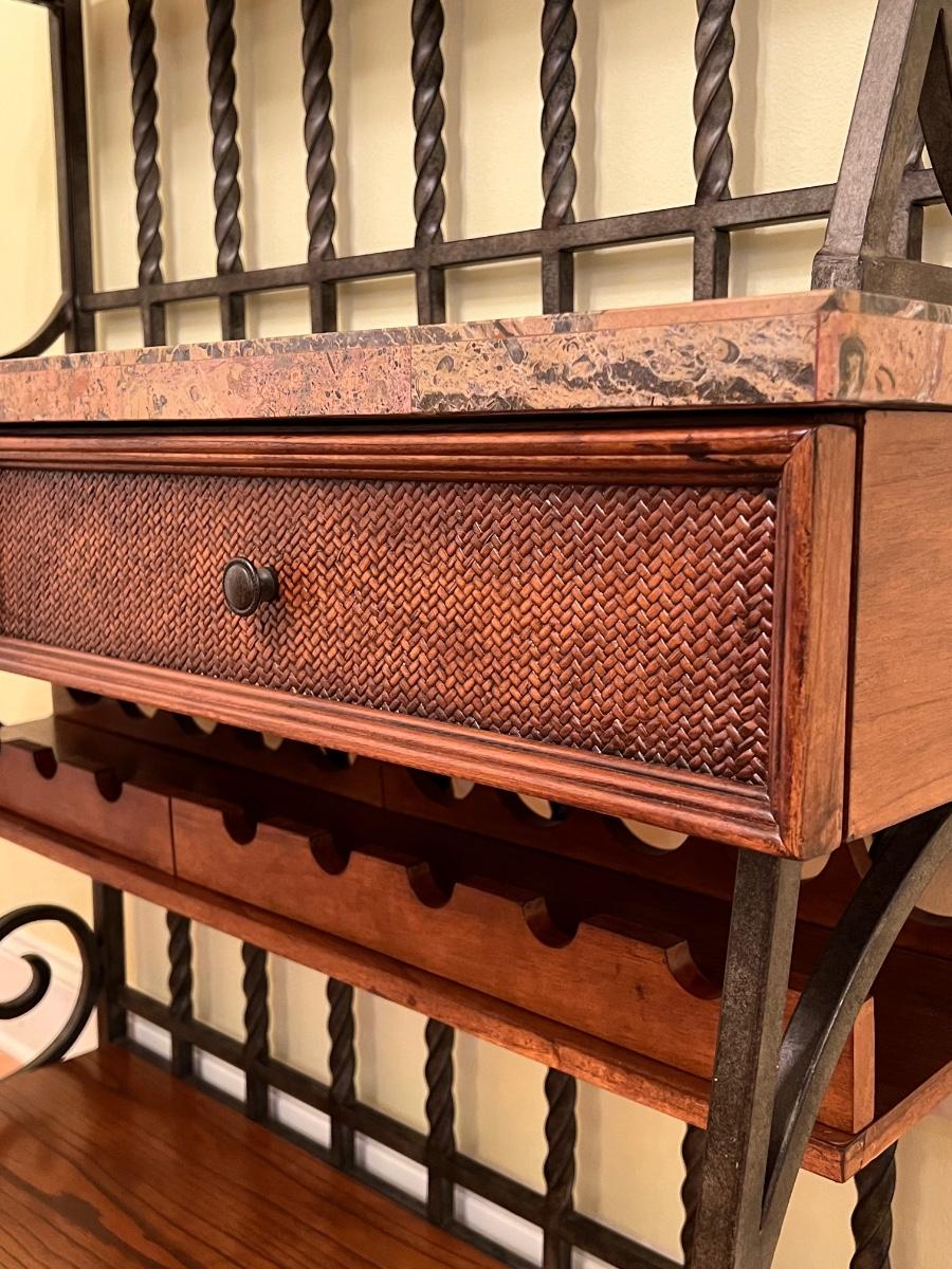 Super Heavy!!! No Brand name ~ Faux marble top ~ Wine holder on bottom shelving needs 2 pegs, see photos ~ 82” H x 50” W x 18” D