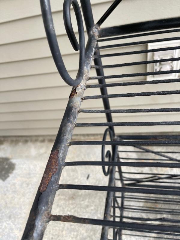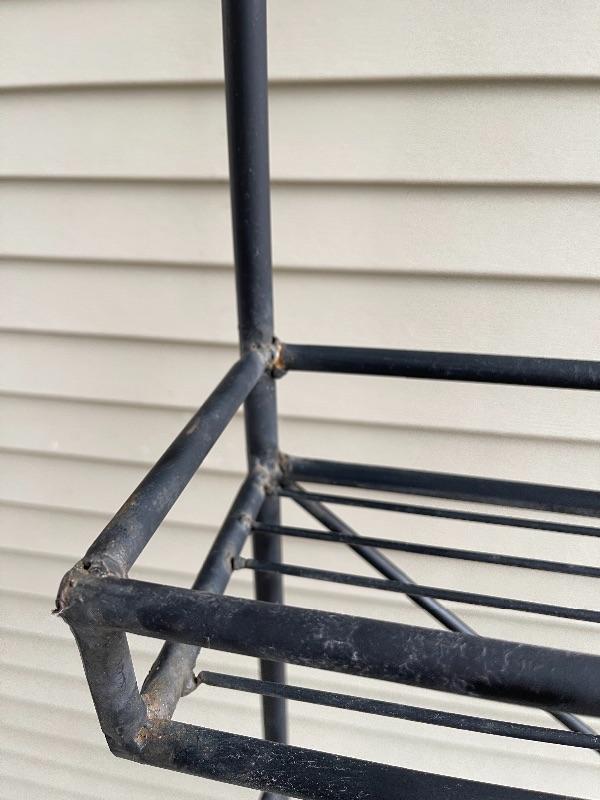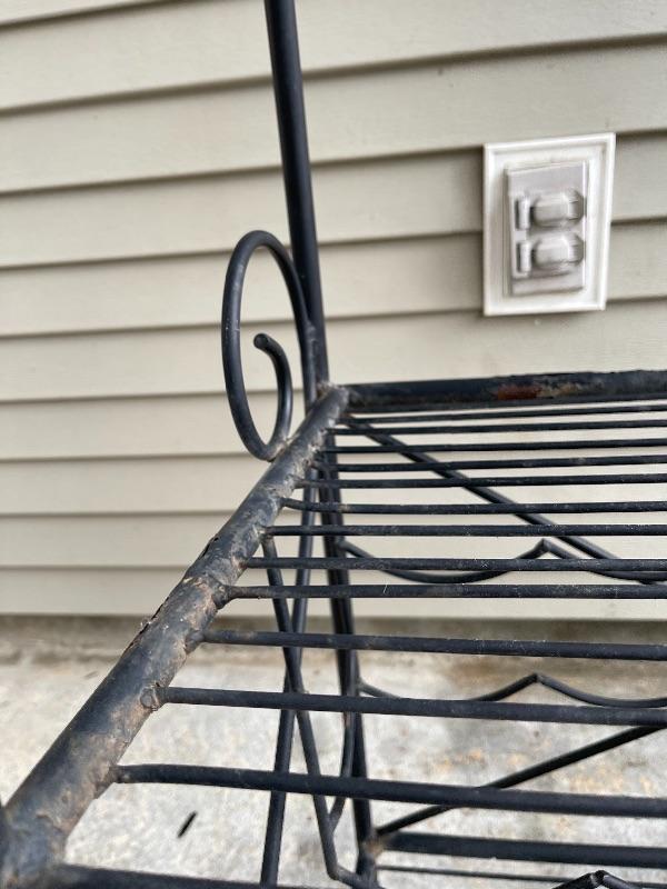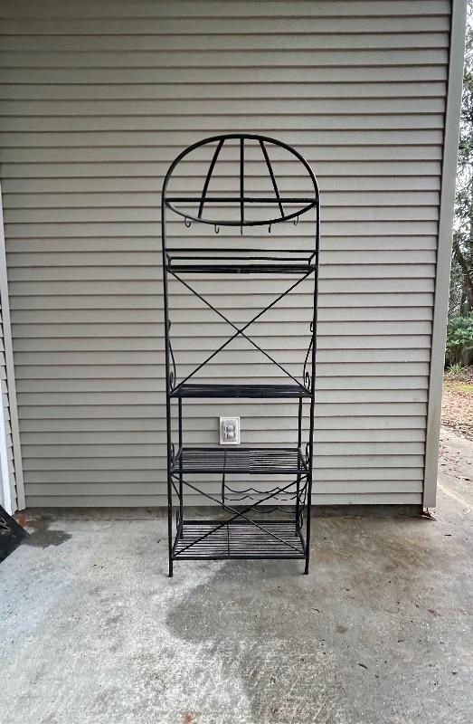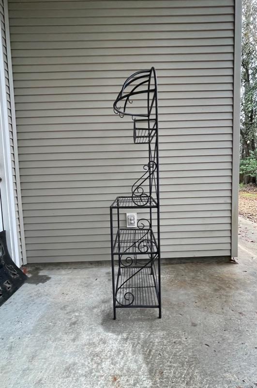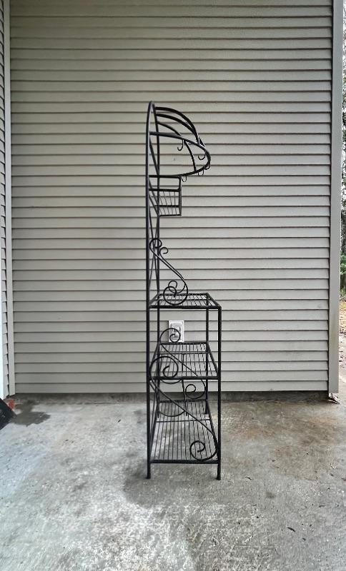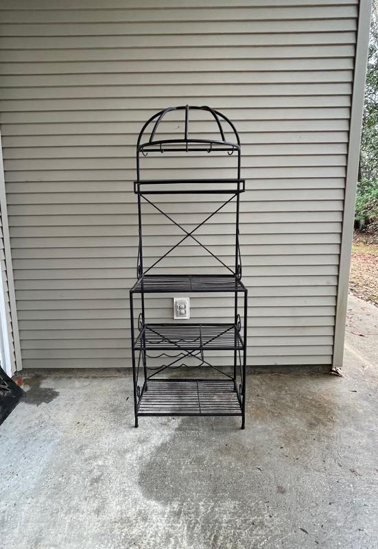 Black, metal bakers rack. Has been used as potting station outdoors. 5 hooks for accessories.