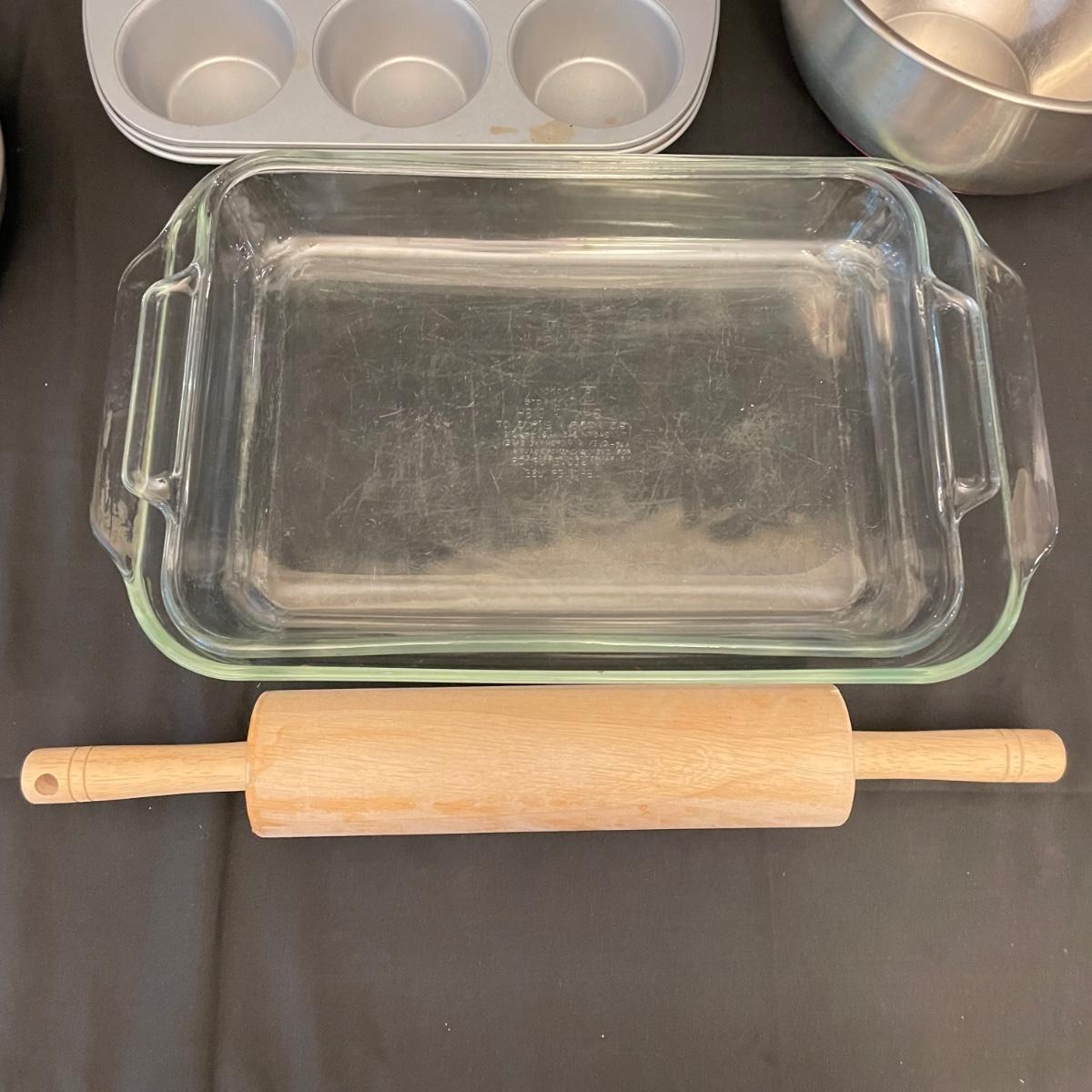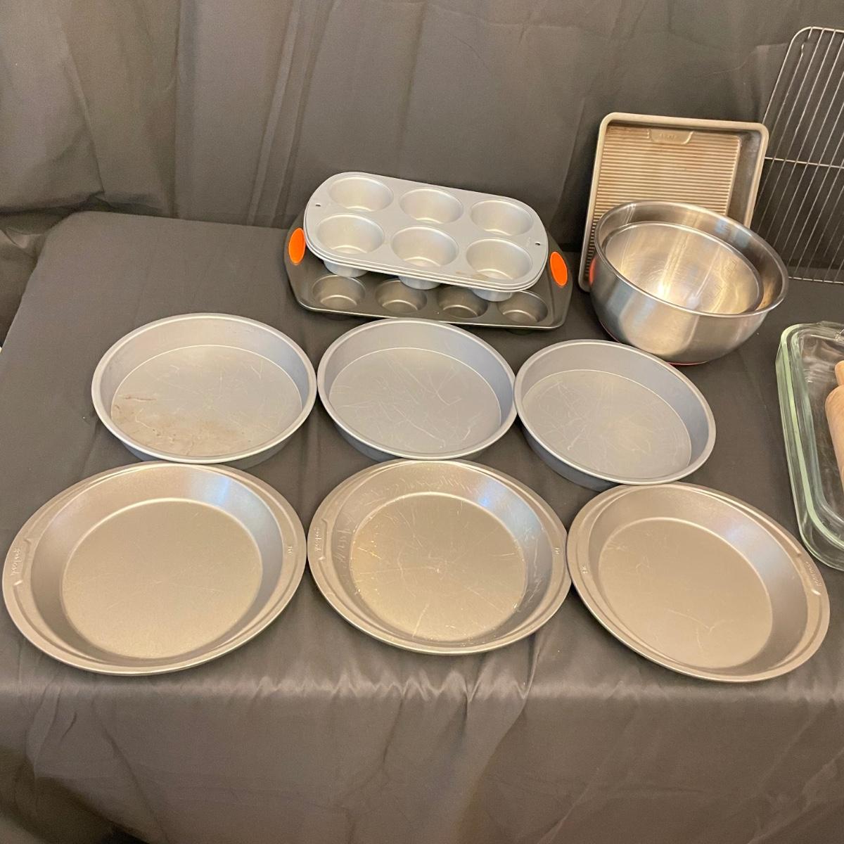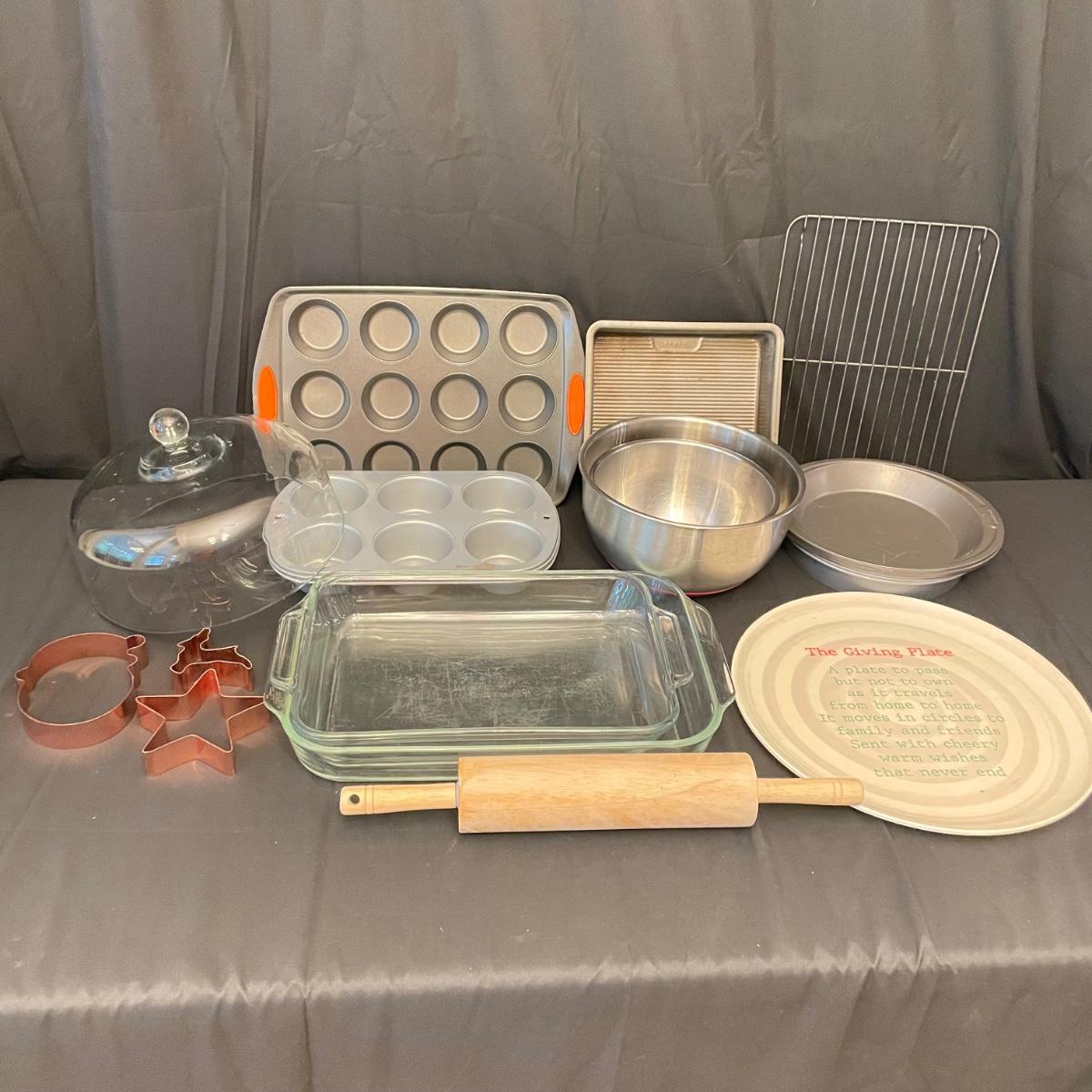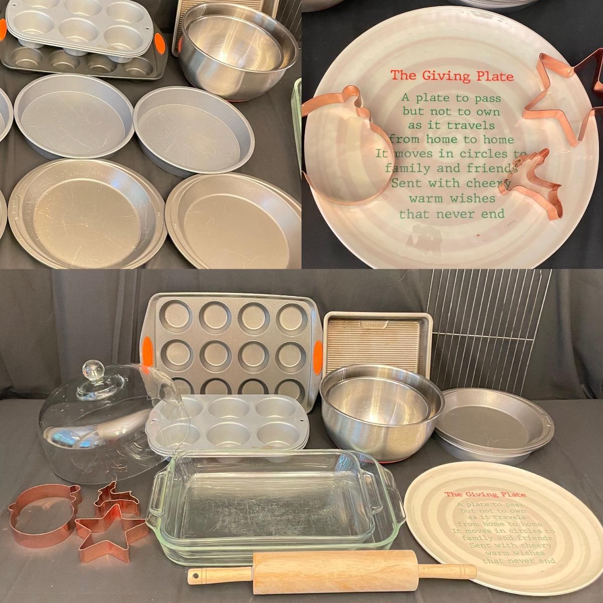 A useful and decorative lot for any baker. Lot contains many pans including cake pans, pie plates, muffin and cupcake tins. Two nesting mixing bowls with non-slip silicone bottoms. A quality wooden rolling pin and three large copper colored cookie cutters. Displays include an 8”H heavy glass plate topper and a 14”D melamine-like “Giving Plate”. Local pick up only.