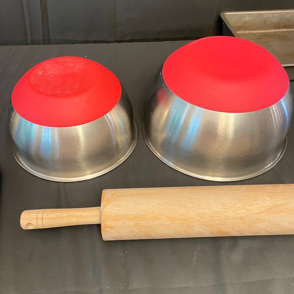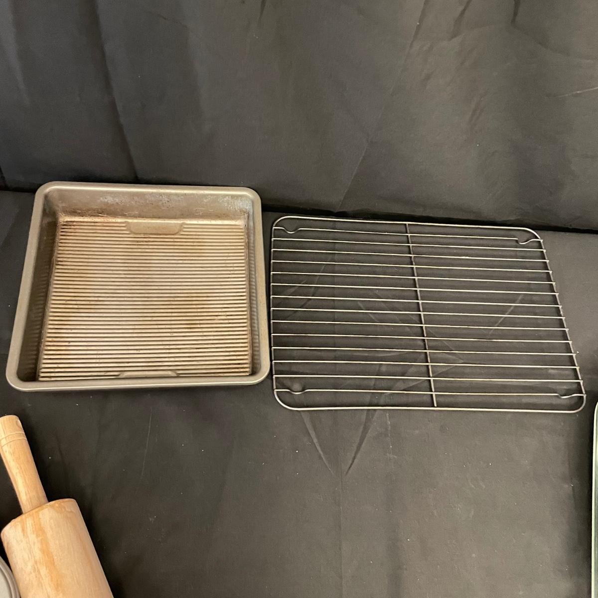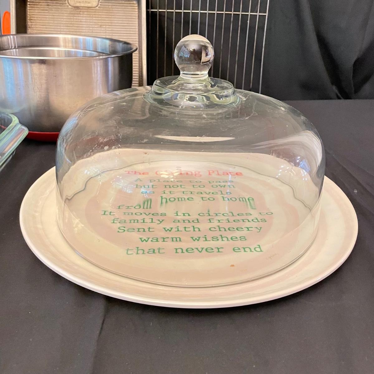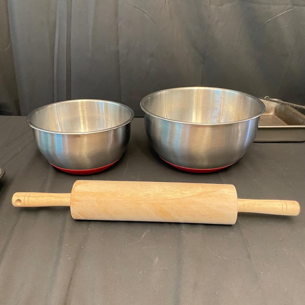 A useful and decorative lot for any baker. Lot contains many pans including cake pans, pie plates, muffin and cupcake tins. Two nesting mixing bowls with non-slip silicone bottoms. A quality wooden rolling pin and three large copper colored cookie cutters. Displays include an 8”H heavy glass plate topper and a 14”D melamine-like “Giving Plate”. Local pick up only.