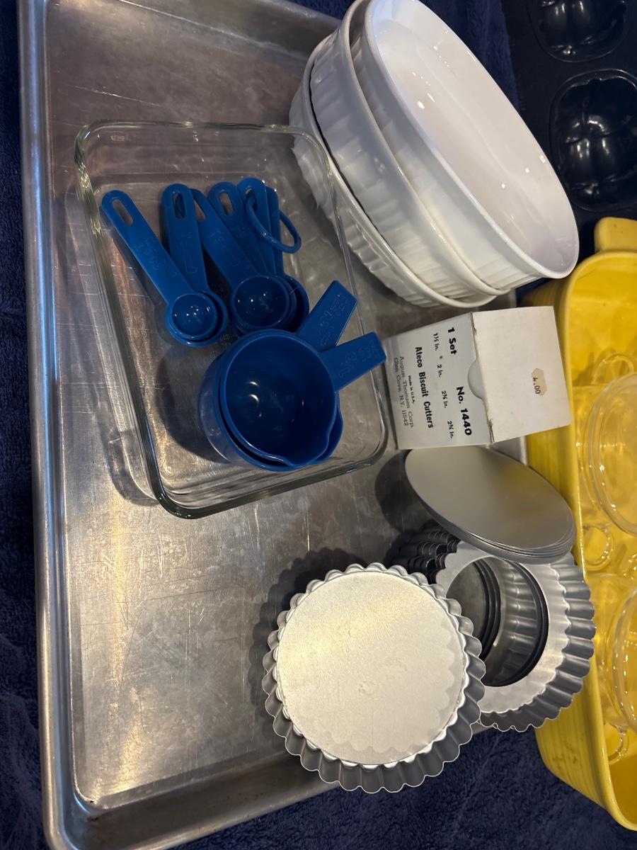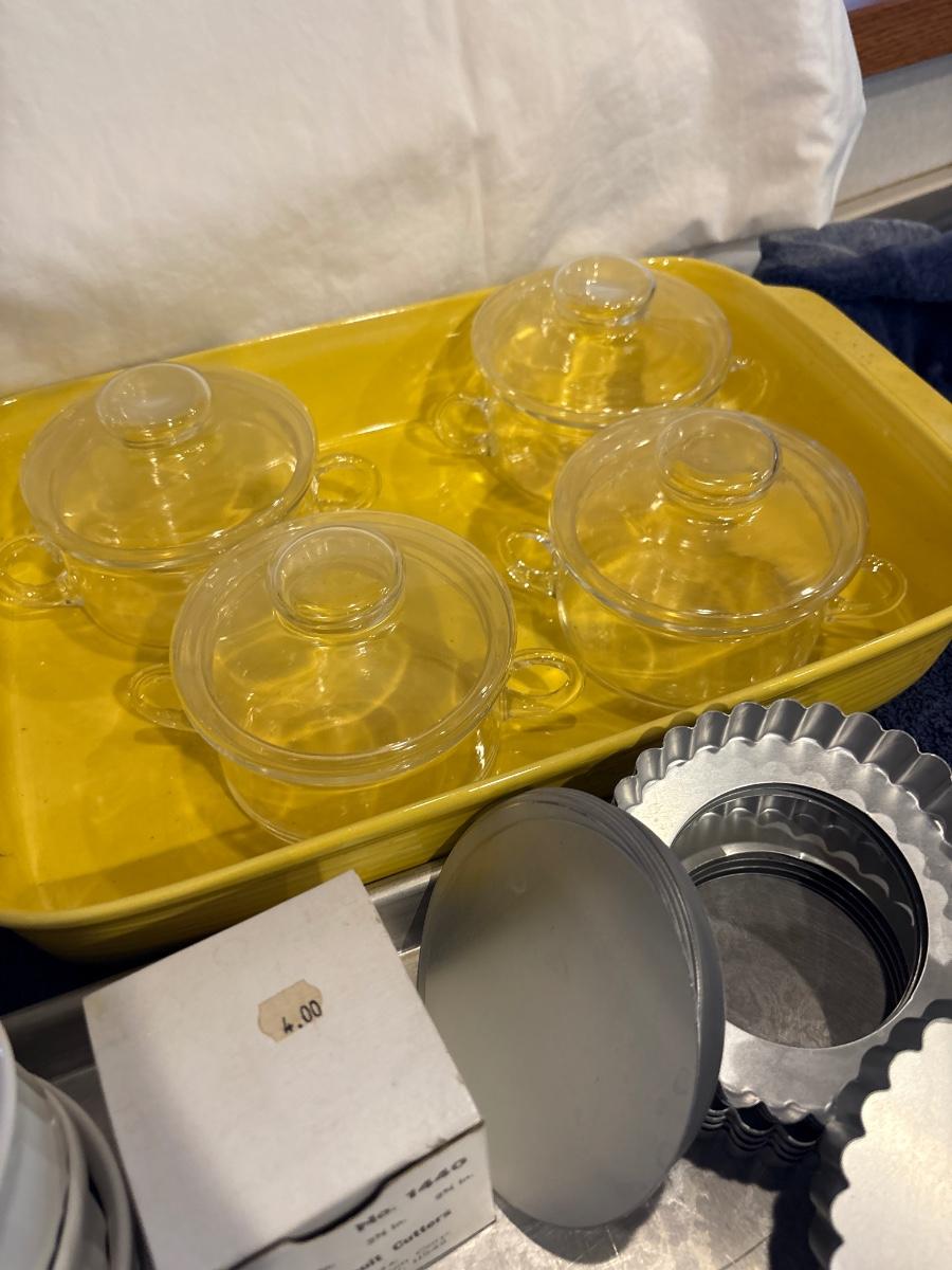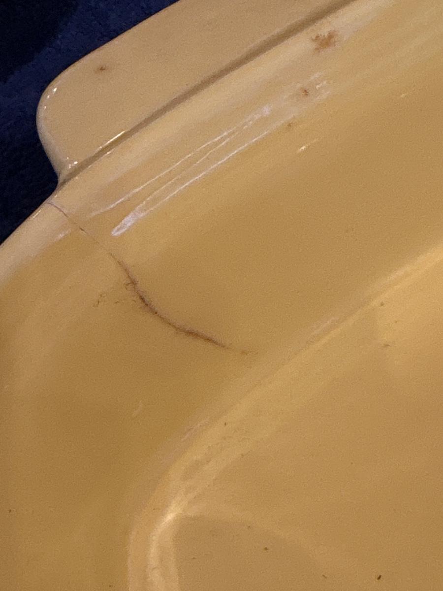 See pictures. Yellow baking pan has a crack but appears to still be usable.