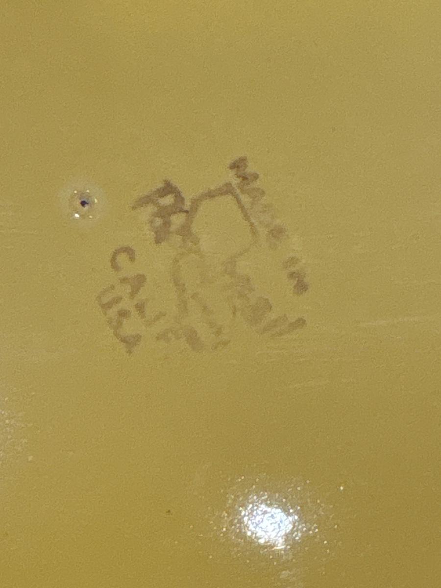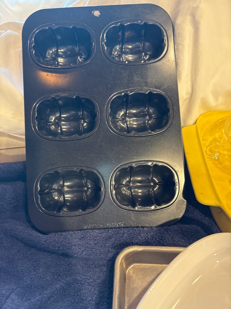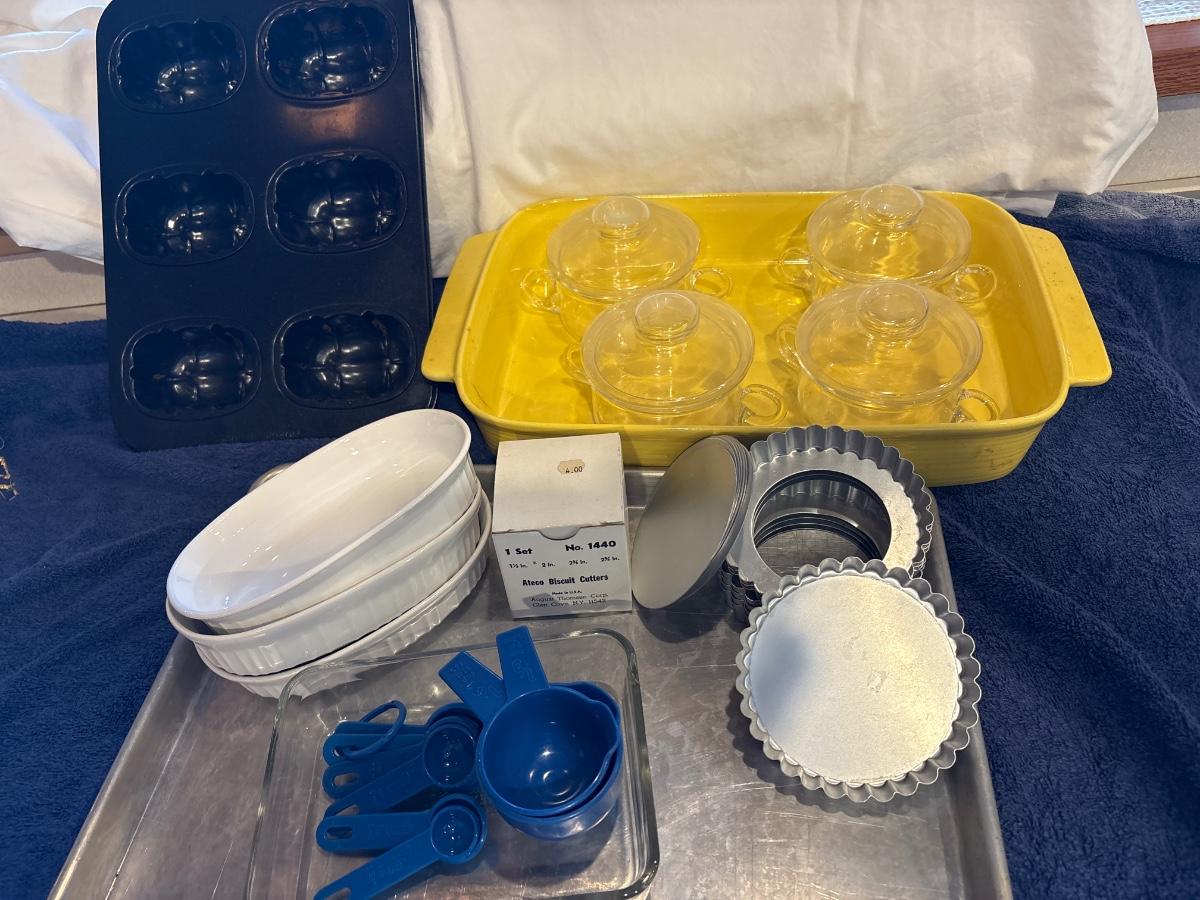 See pictures. Yellow baking pan has a crack but appears to still be usable.