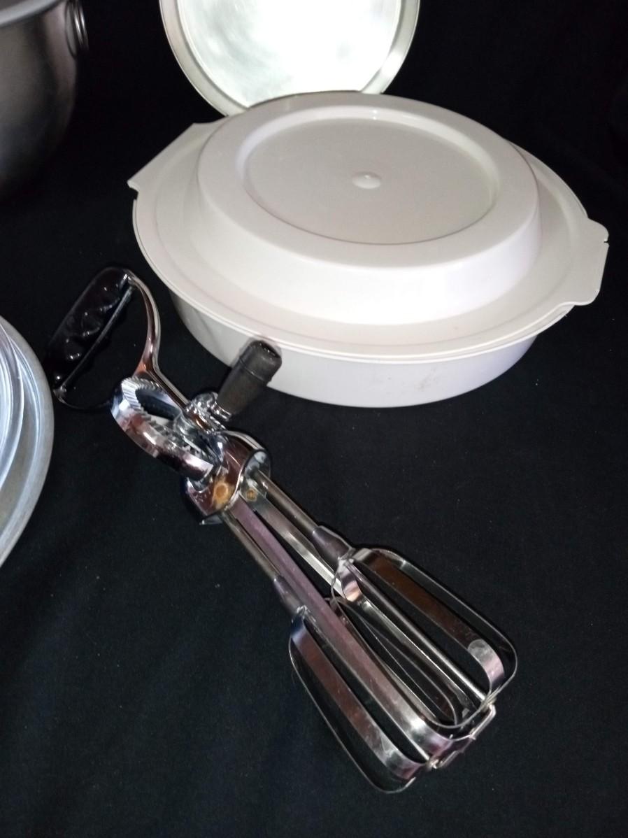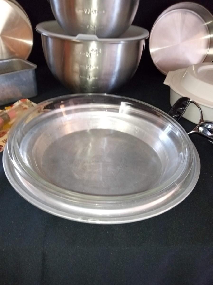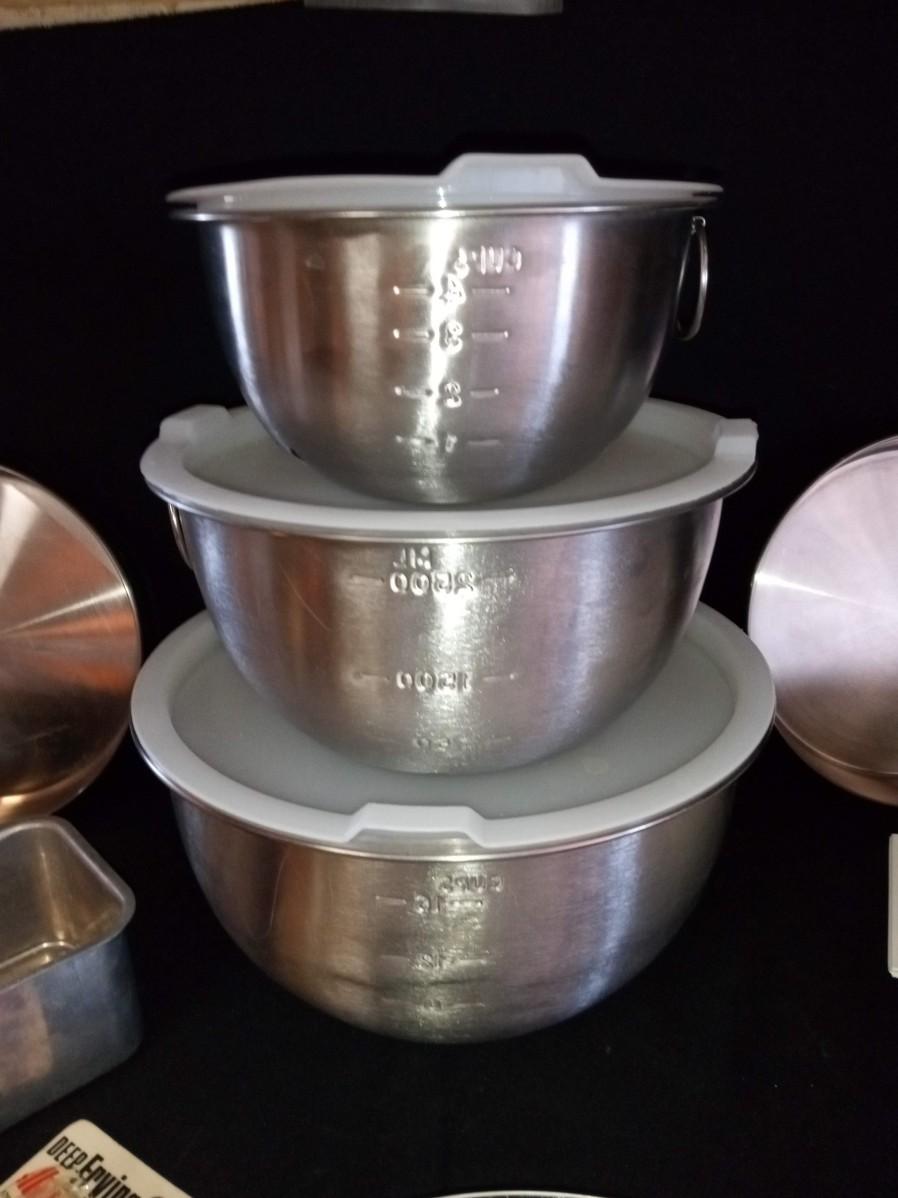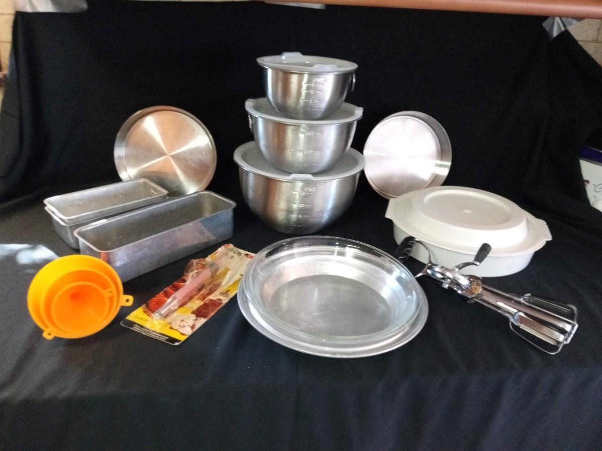 3 MEASURING STAINLESS STEEL BOWLS WITH PLASTIC LIDS, PIE STORAGE CONTAINER, BAKING PANS, THERMOMETER, HAND MIXER AND FUNNELS